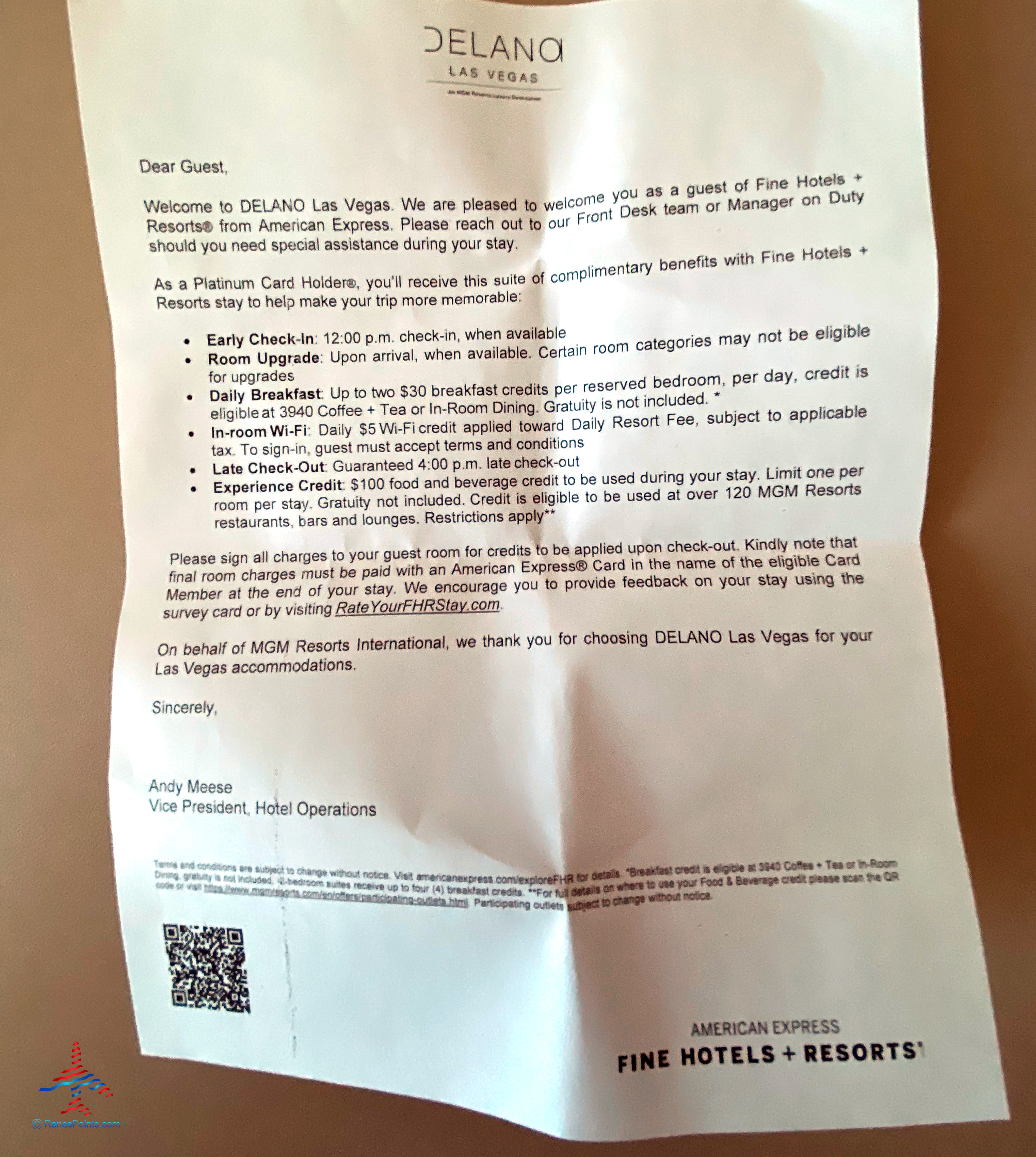 An American Express Fine Hotels & Resorts welcome letter for Delano Las Vegas, an MGM Resorts hotel part of the Mandalay Bay Resort Casino complex near the Las Vegas Strip in Paradise, Nevada.