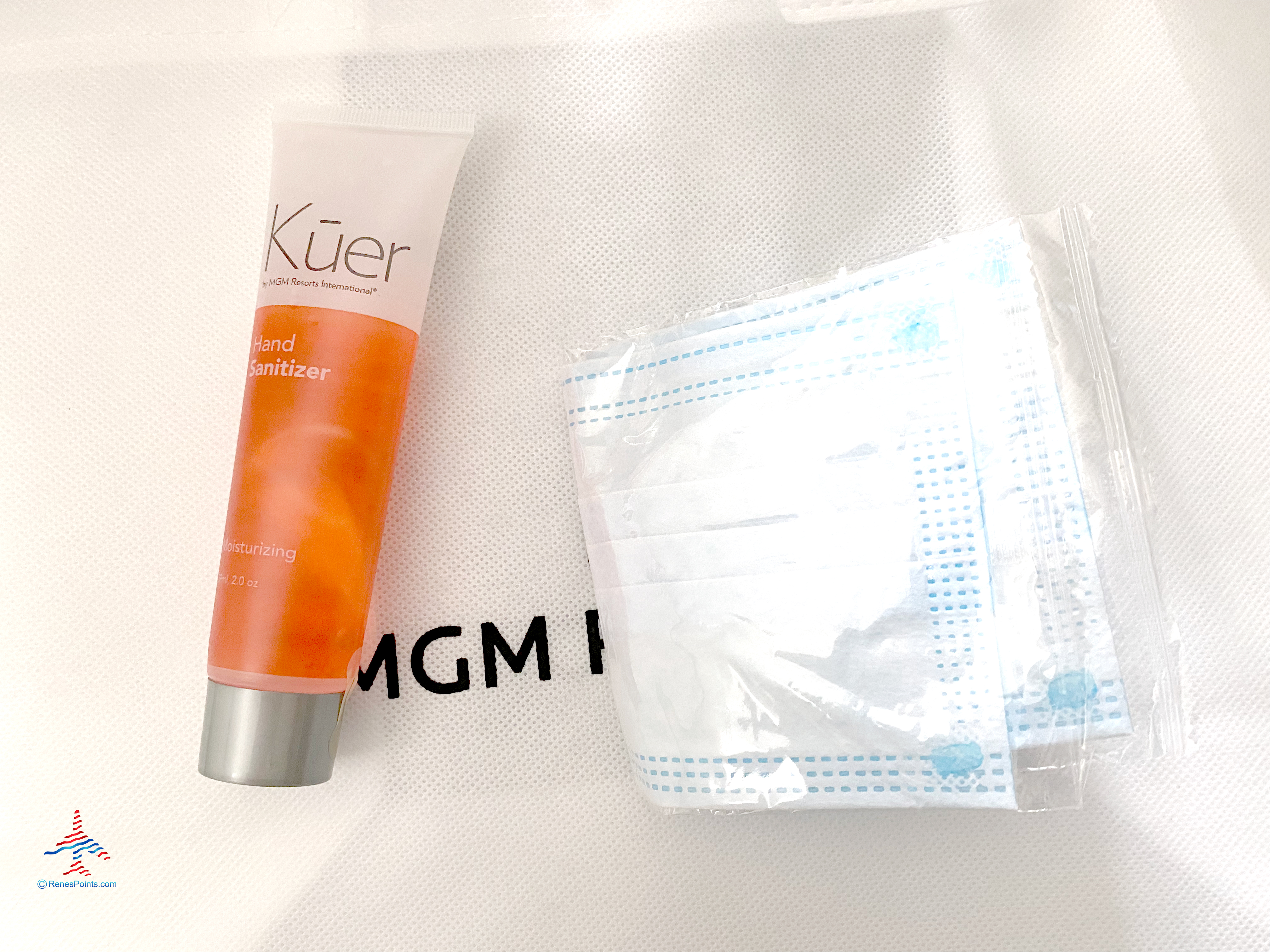 Awaiting us was a Mandalay Bay-branded zippered pouch containing two surgical masks and a bottle of hand sanitizer.