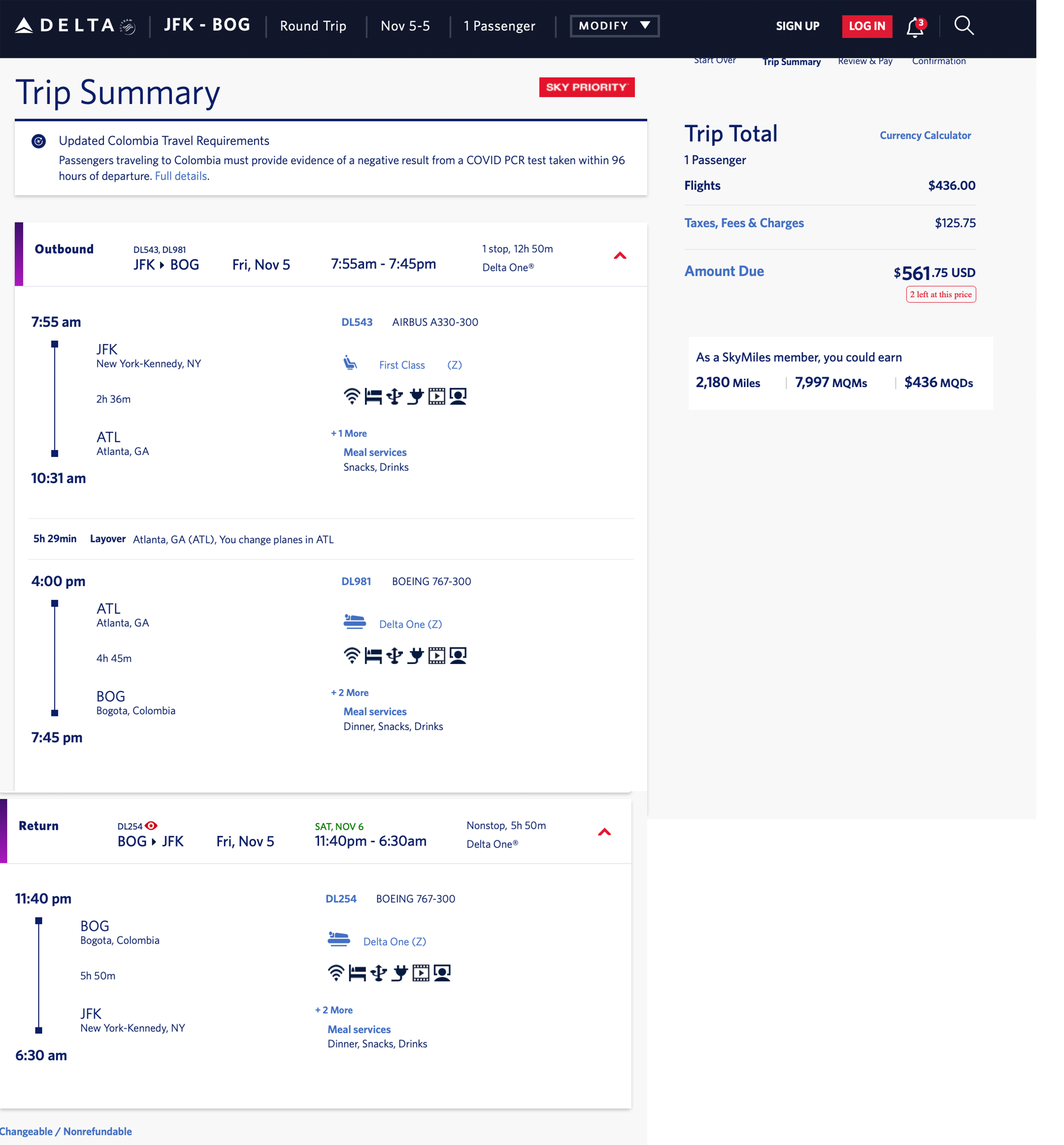 Because Delta is awarding 75% MQM, MQS, and MQD bonuses on premium cabin trips flown during the rest of 2021, this JFK-ATL-BOG-JFK run should yield 13,994 MQM and $763 MQD. The price is just $561.75. That comes out to about 4.0 CPM.