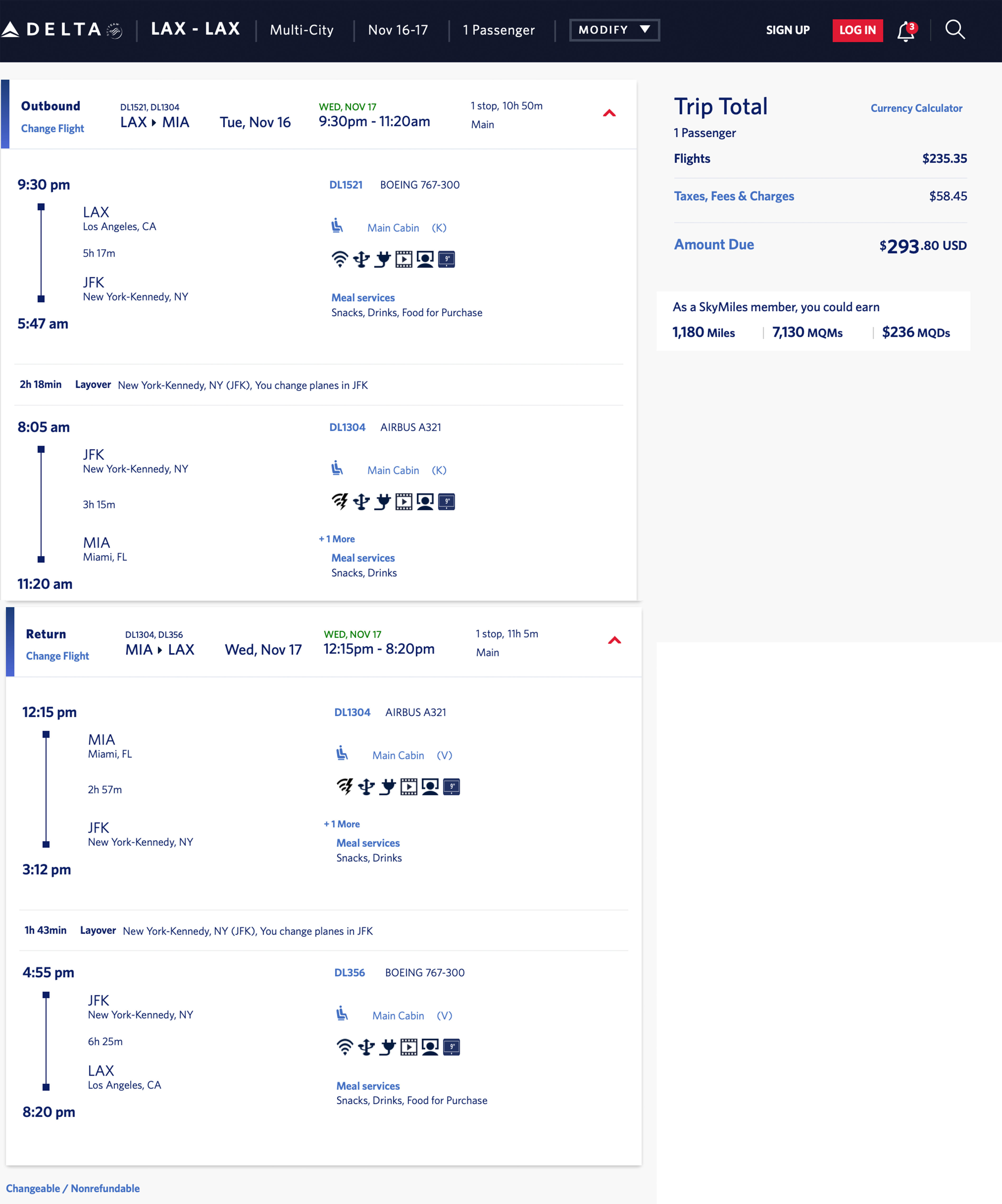 This is an LAX-JFK-MIA-JFK-LAX trip you can knock down in about 23 hours of flying. It’s a Main Cabin trip — but the flights between LAX and JFK are aboard 767-300s. So if you’re a Platinum or Diamond Medallion®, it might be worth using an upgrade certificate to get yourself to the top of the upgrade list — especially for the overnight trip.