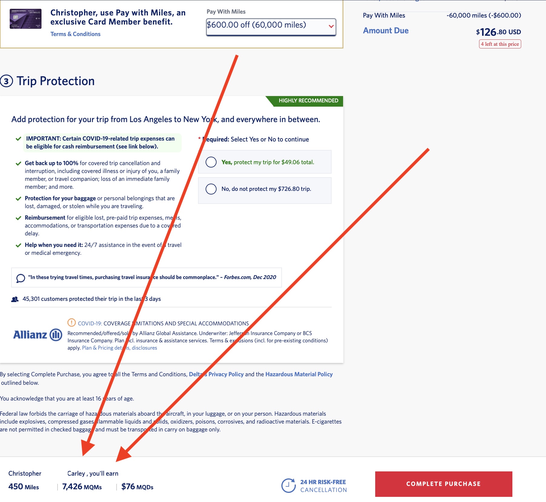 I applied 60,000 SkyMiles to save $600 of the total price. Delta’s Pay With Miles tickets earn full MQM. (They only earn MQD on any eligible cash put towards the fare.) So far, so good!