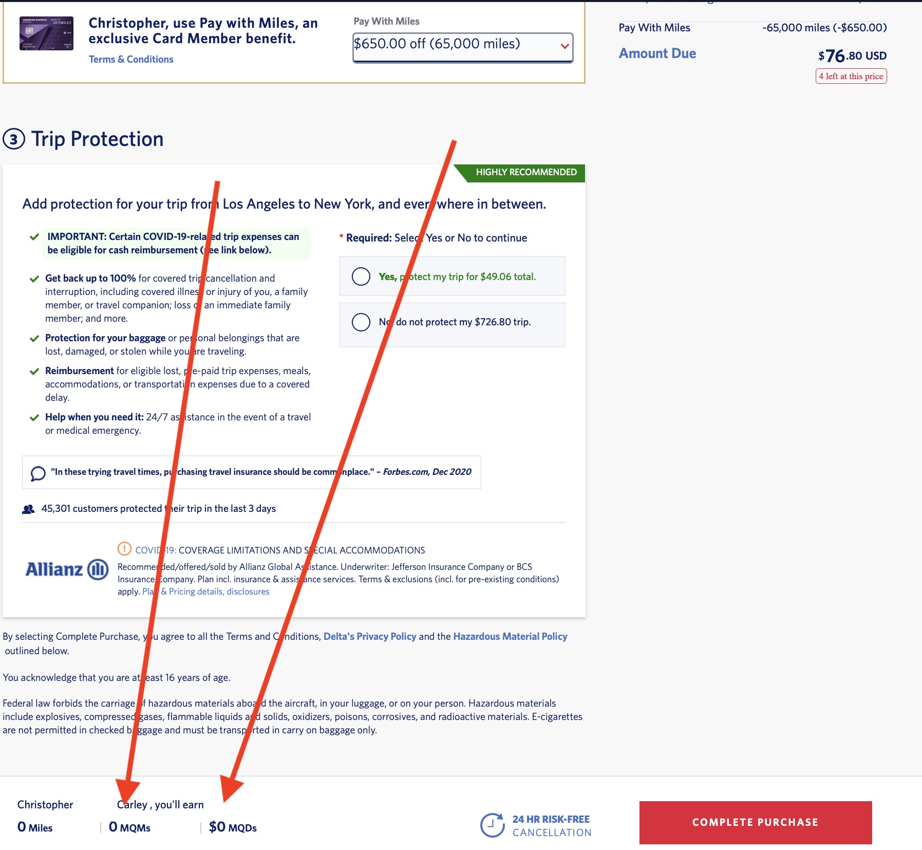I tried to use the Pay With Miles feature on the same sample itinerary.