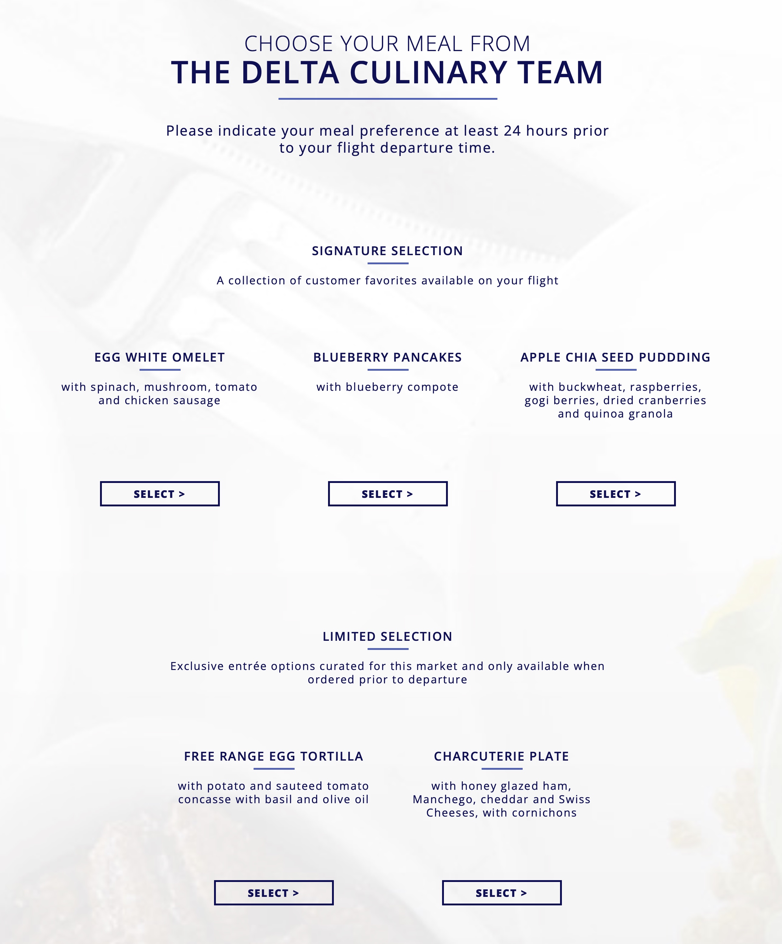 Exactly one week prior to departure (almost to the minute!), an email from Delta invited me to select my breakfast choice. Here were my options: