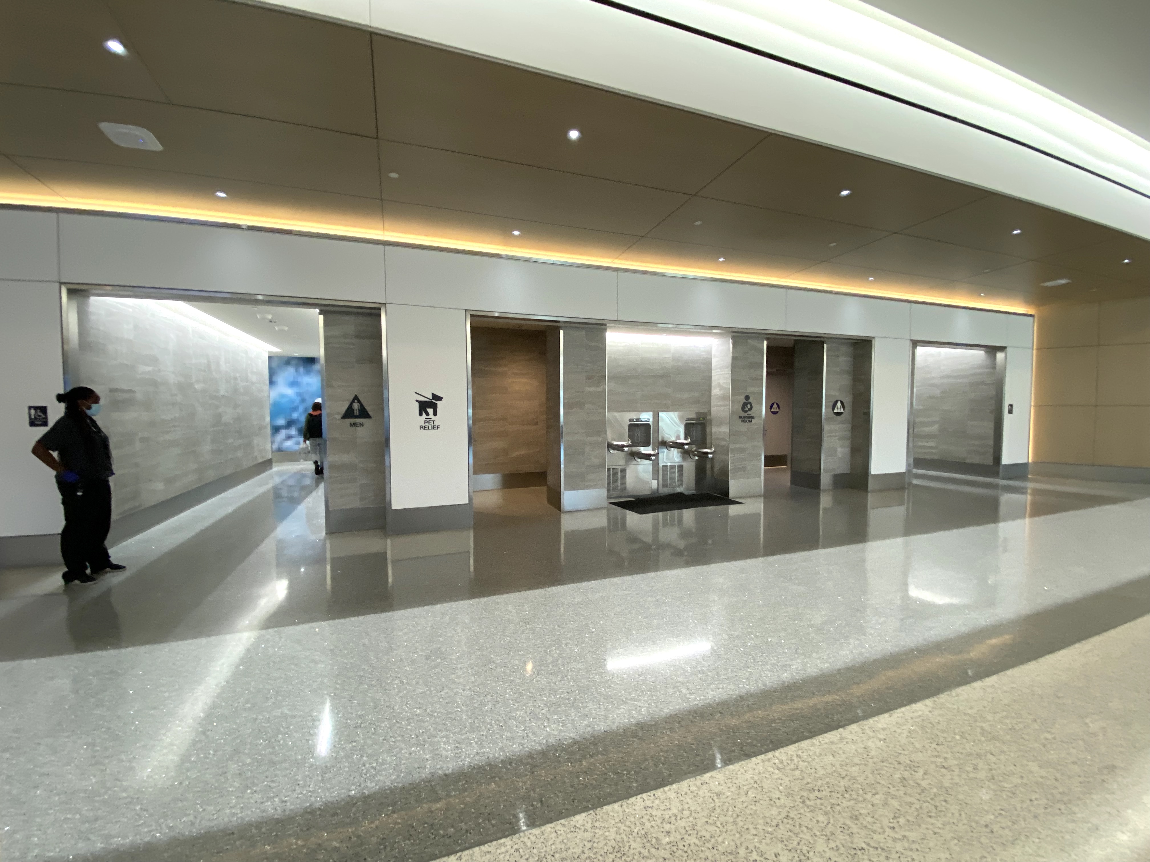 The restrooms and pet relief area are on our right as we walk to gate 33.