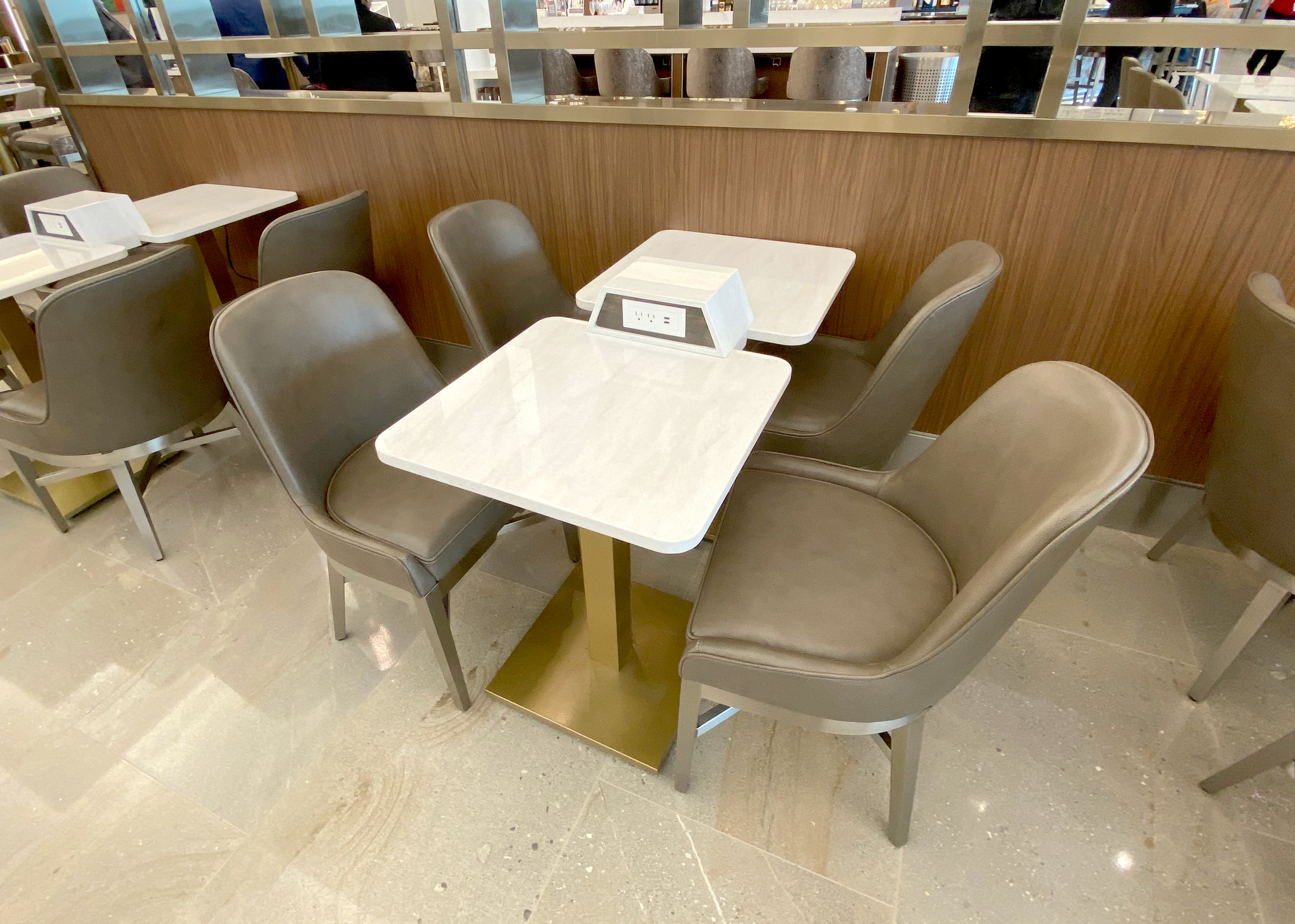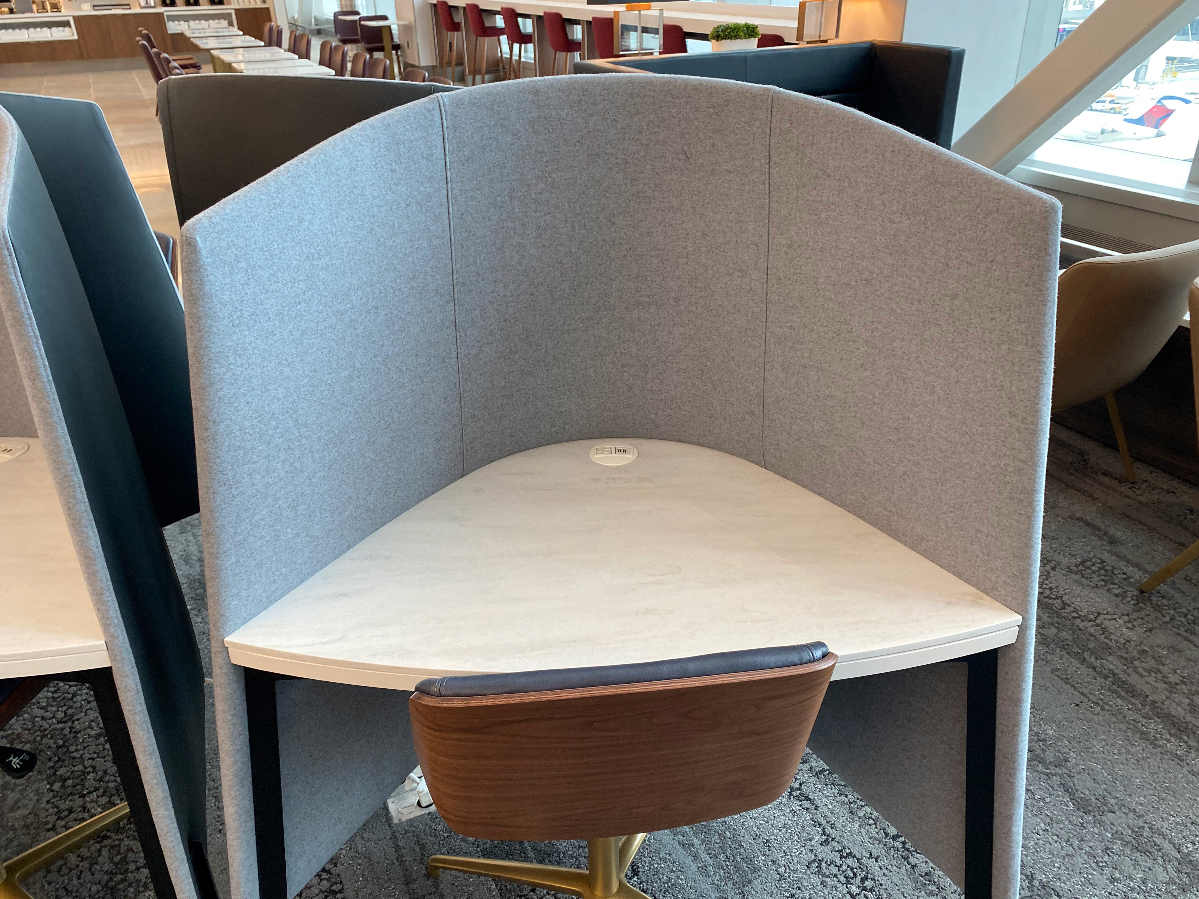 A Crown Room or WorldClub this ain’t. The LGA Delta Sky Club is sort of a retro-hip airport lounge that Delta modeled as sort of a turn-of-the-20th-century, hotel-metropolitan theme. Not every seat has access to power outlets or USB ports — but many do. Plus, Delta installed several dozen (at least) USB-C ports at a number of seats and workstations.