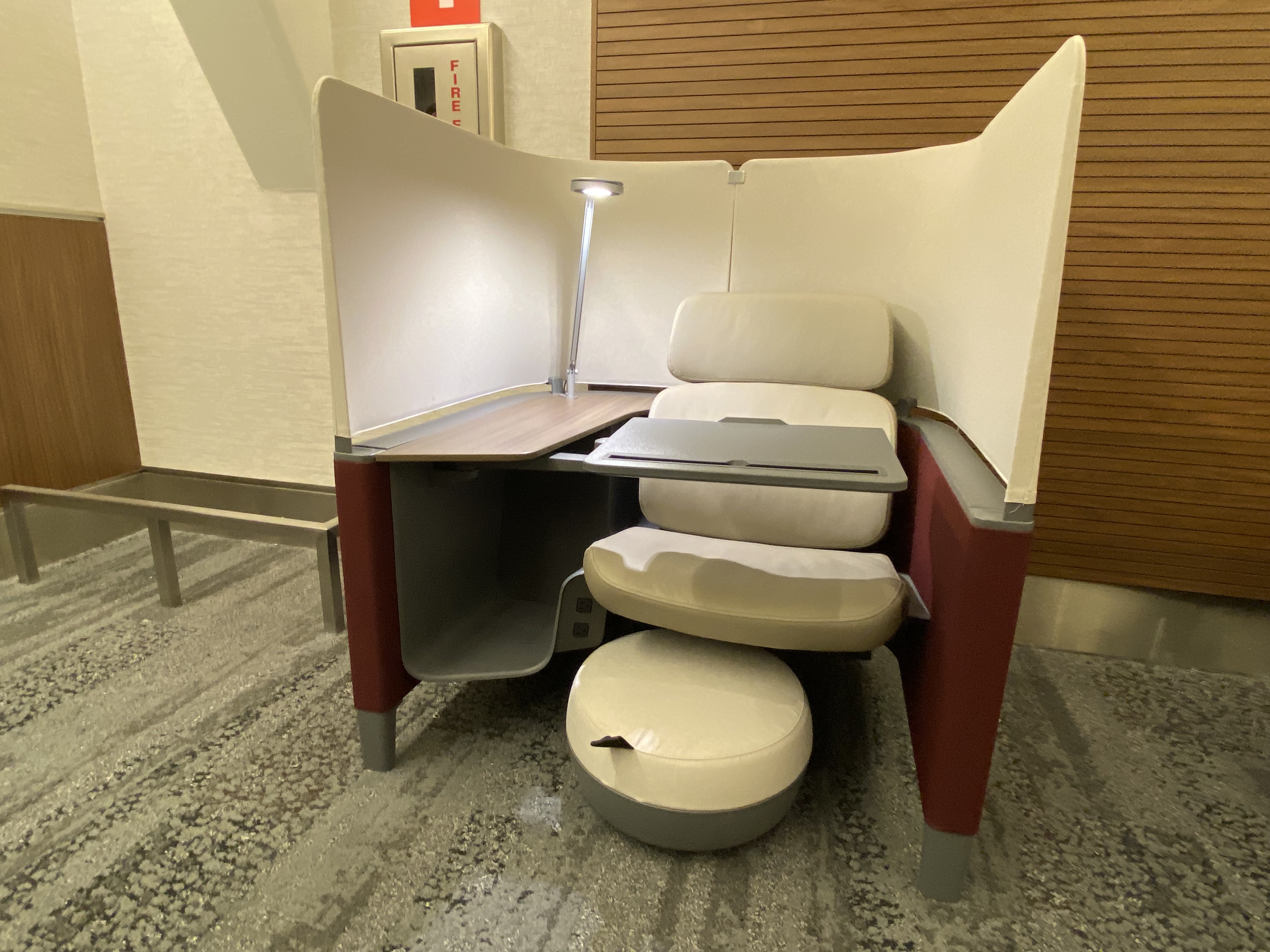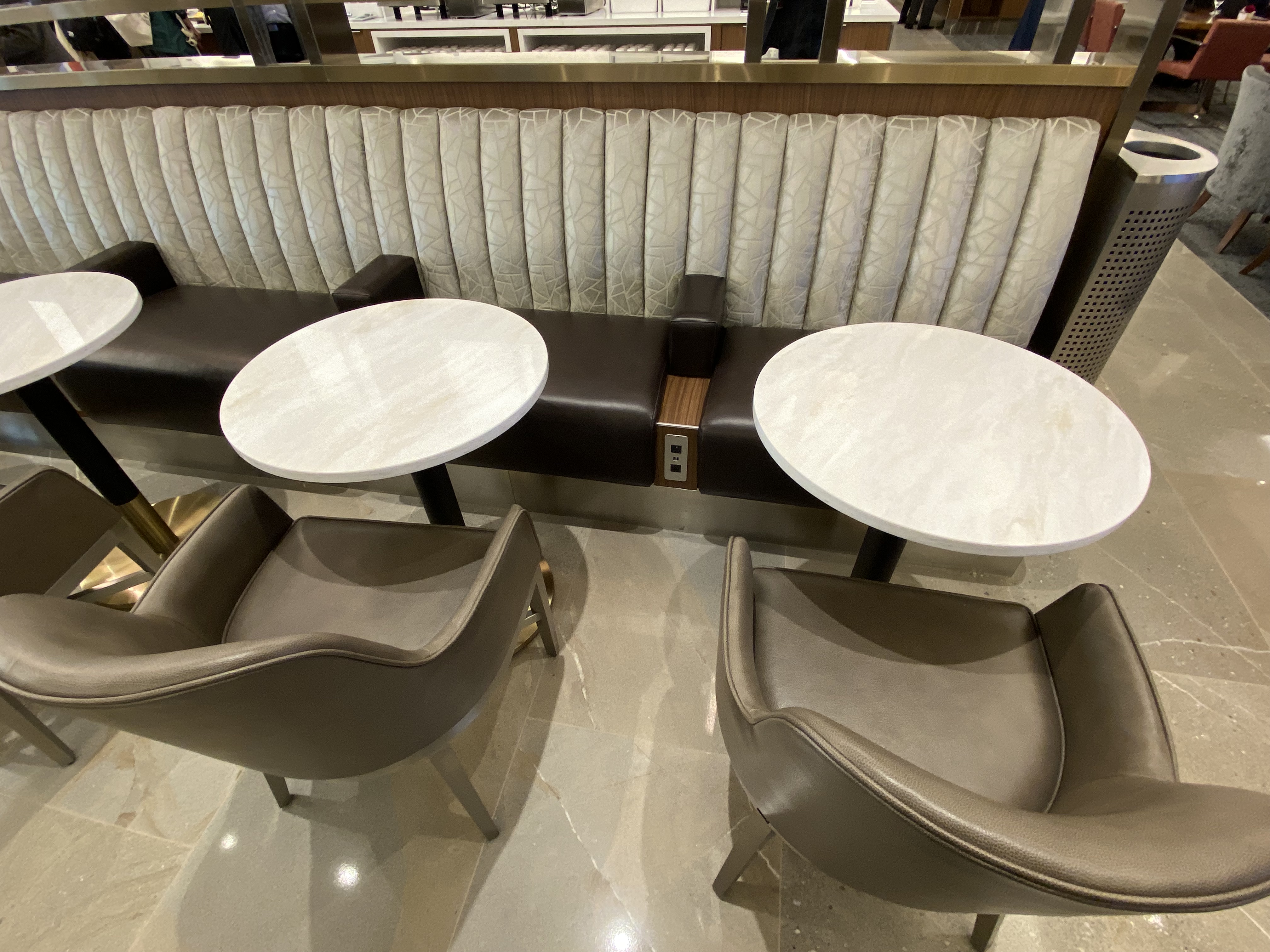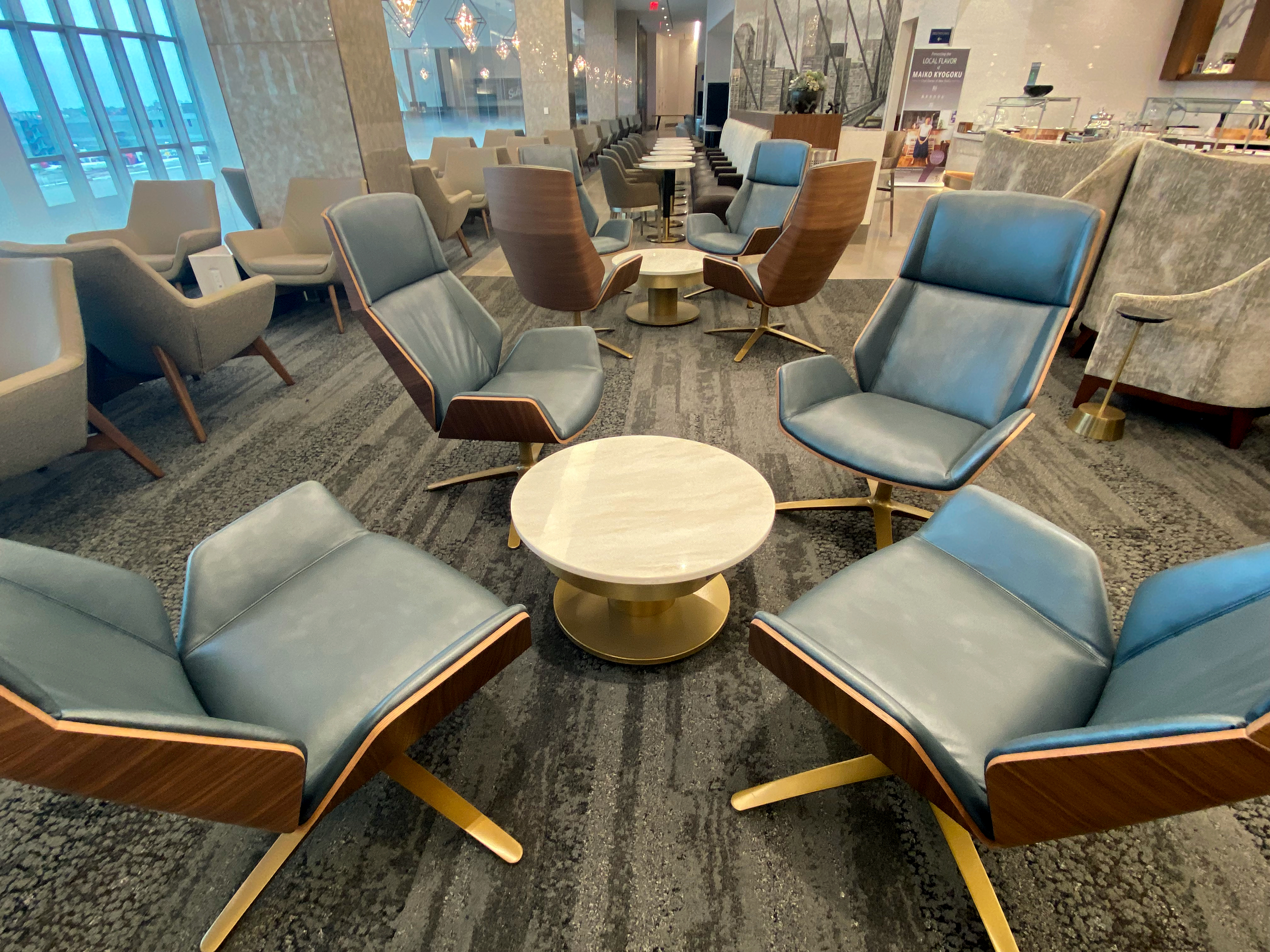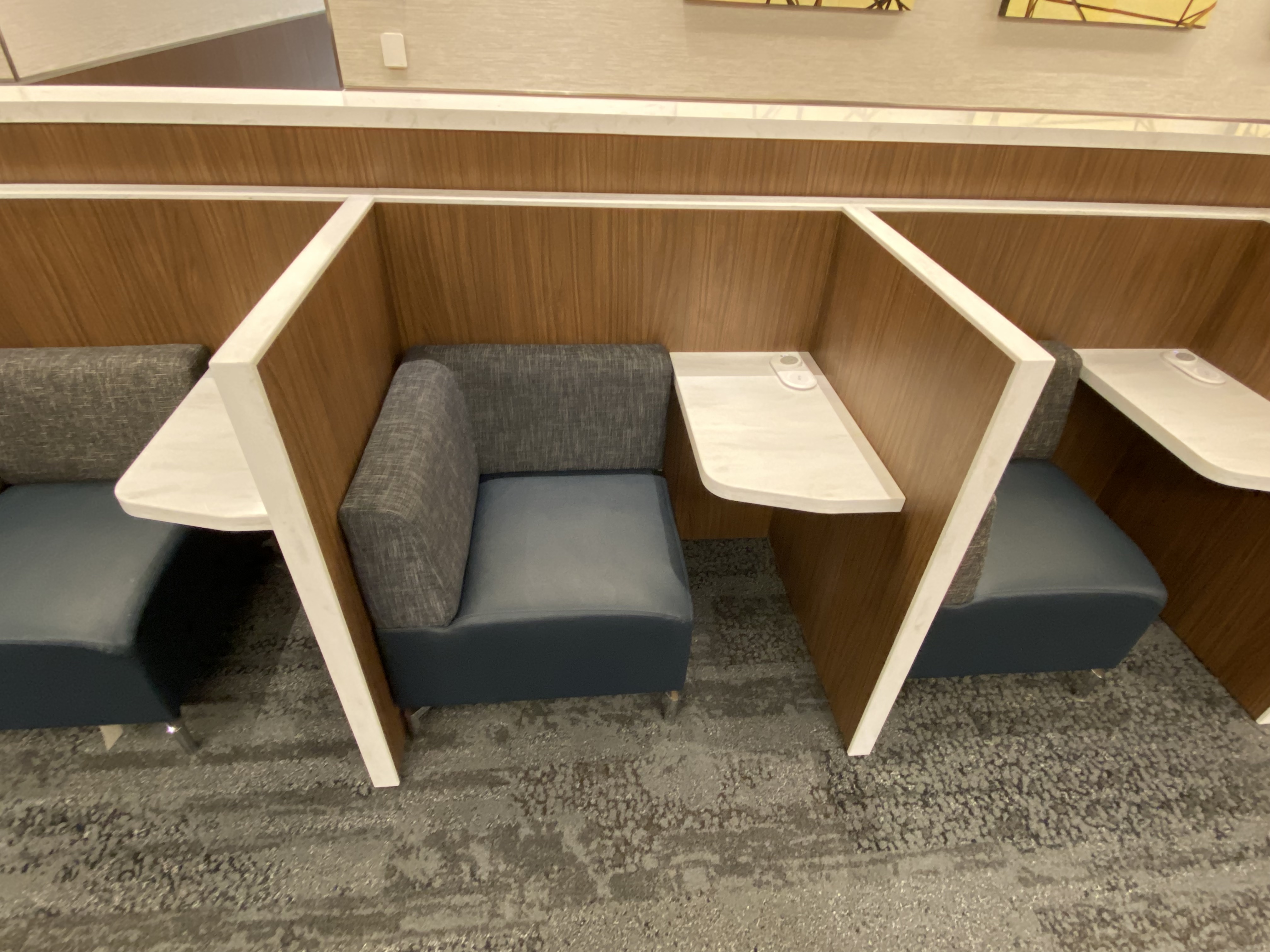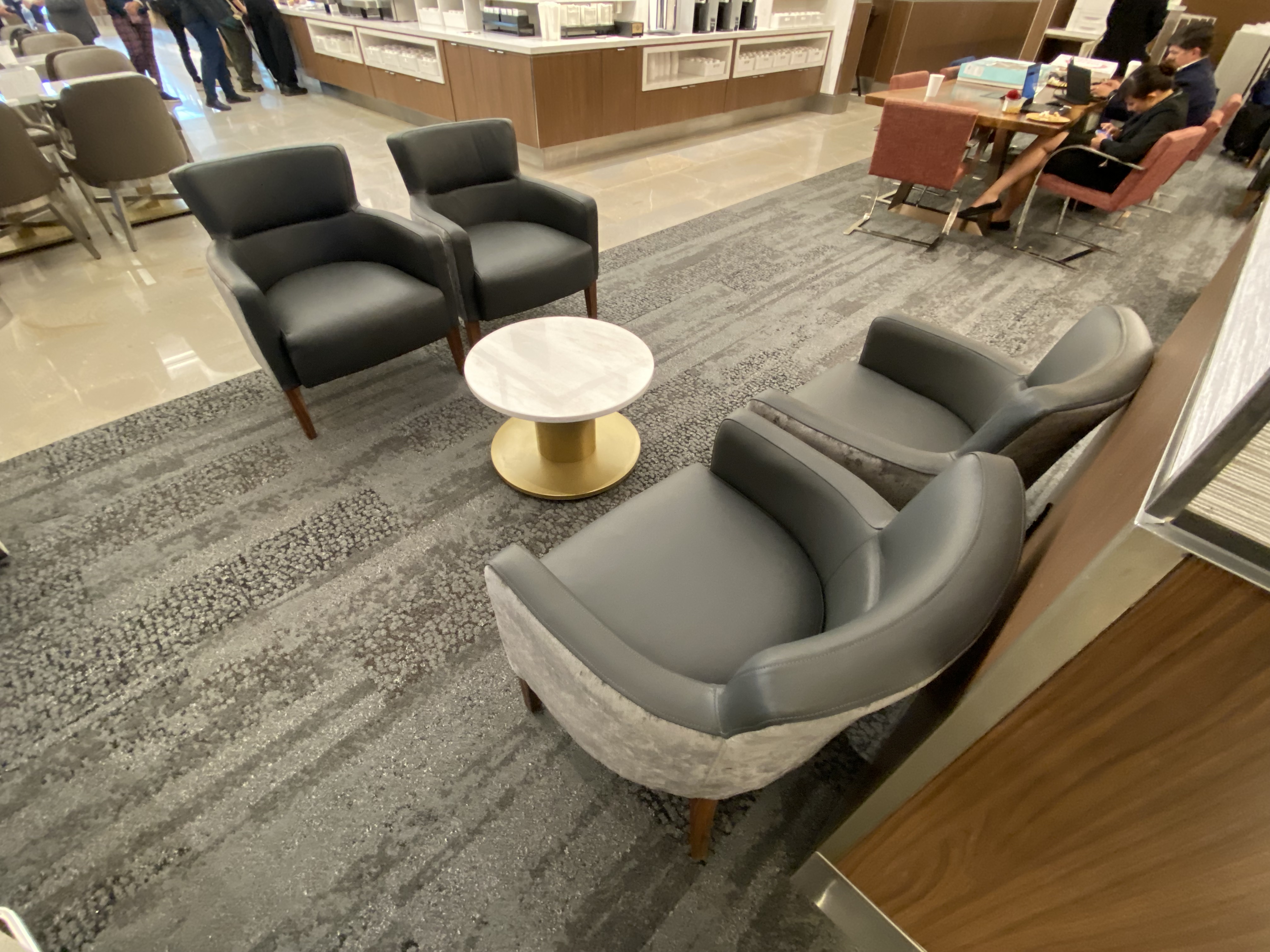 I don’t understand why the idiots who design these lounges continue using the mini-tables that are too low for computers and too low to eat from. Plus, they continue to design these seating areas with two chairs facing each other. Unless you’re traveling with three other people, who wants to sit and look directly at someone else? It’s nonsensical. What ends up happening is one or two people occupy a seating area designed for four people. Or you get one person who uses the chair next to them for their coat and carry-on bag. Then the two chairs across from them go empty because nobody wants to sit that close to someone.