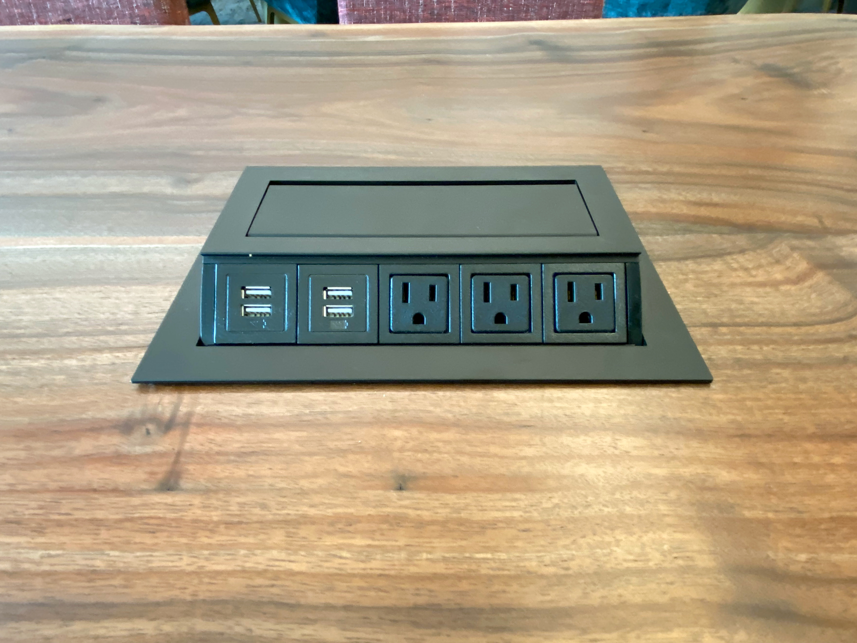 The communal tables all feature these power ports.