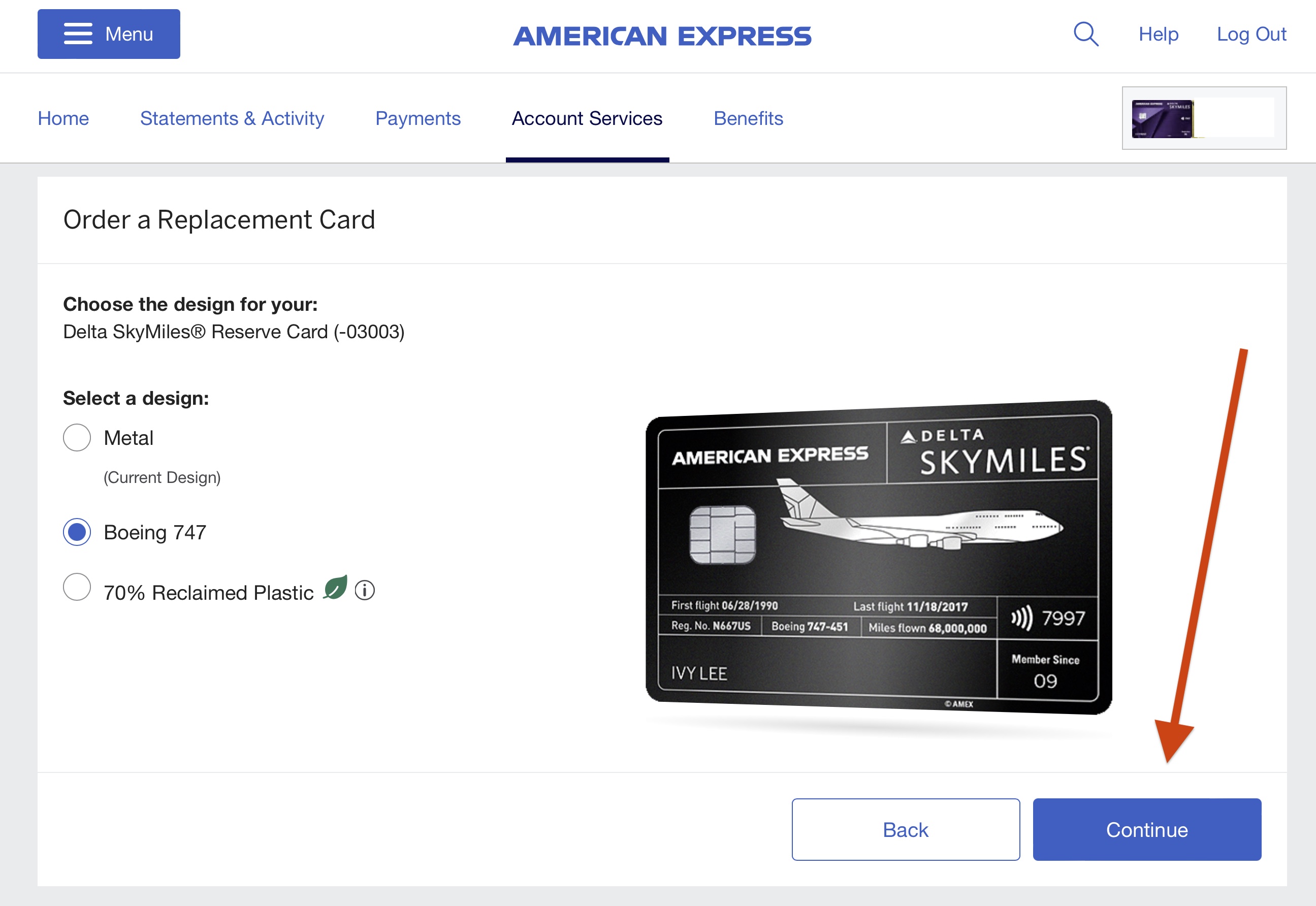 On the “Replace a Card” screen, tap your applicable Reserve card. Then you’ll see another screen. Tap “Continue to Replace Card.” Select “Change Card Design” as your reason for replacement and tap “Continue.”