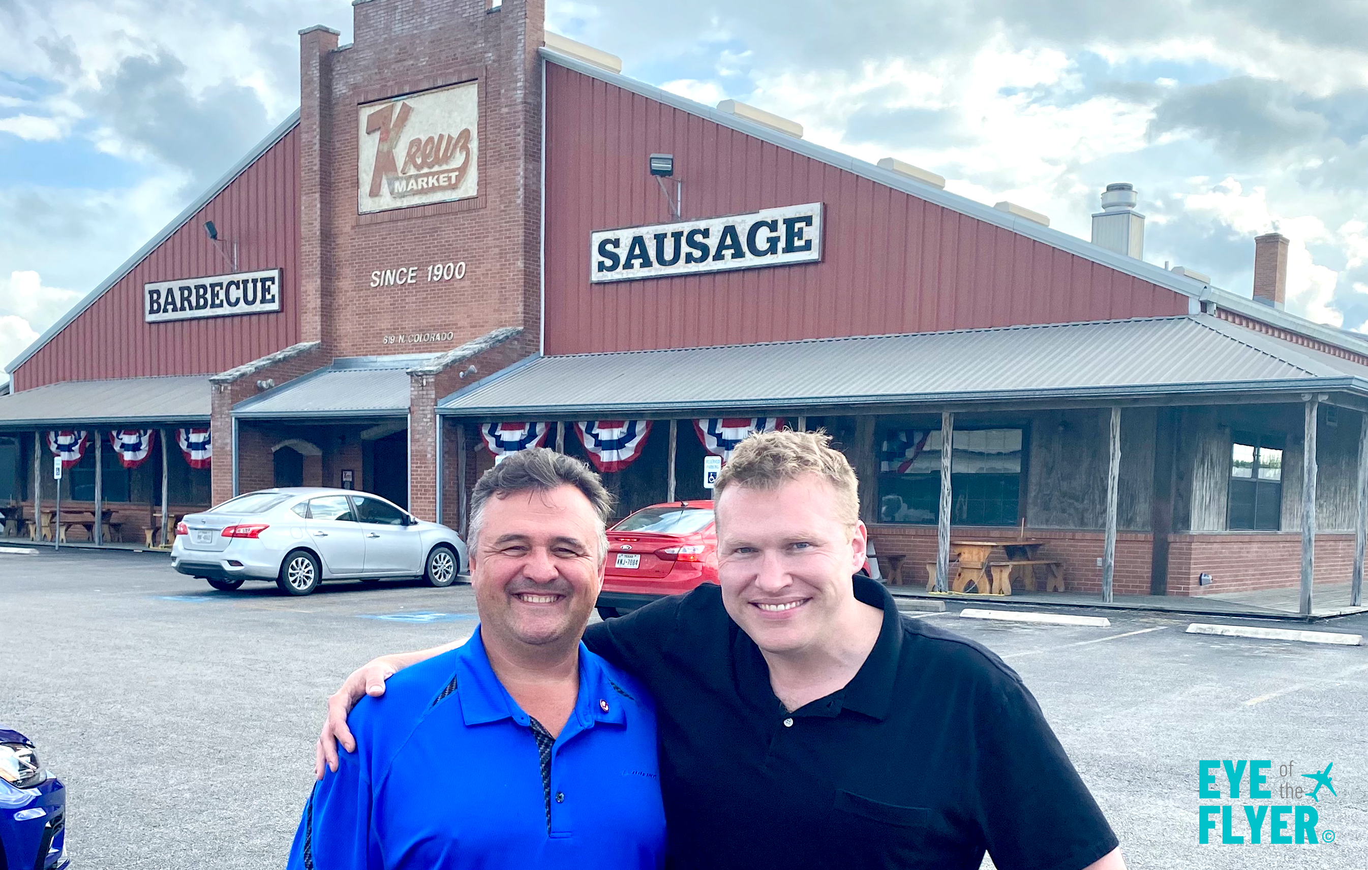 Are there any questions you’d like to ask one or both of us? Something about travel? Delta? Cruises? Points and miles? Credit cards? The blog? Aisle or window? Red or white? Texas-style BBQ vs. Kansas City-style? Why a sign says “SAUSAGE” above our heads in the picture below?