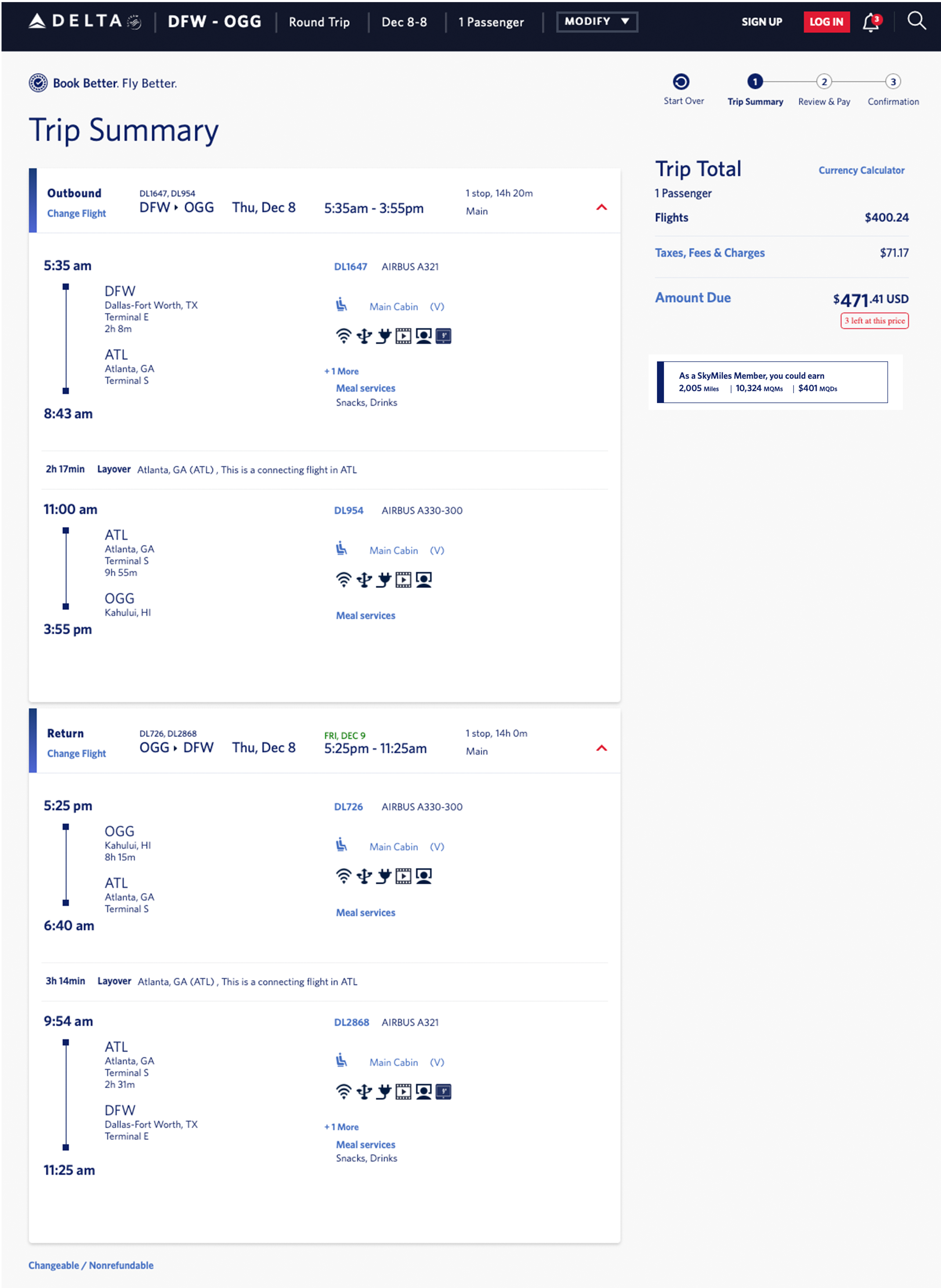 First things first: this is a Main Cabin run. It travels DFW-Atlanta-OGG-ATL-DFW.