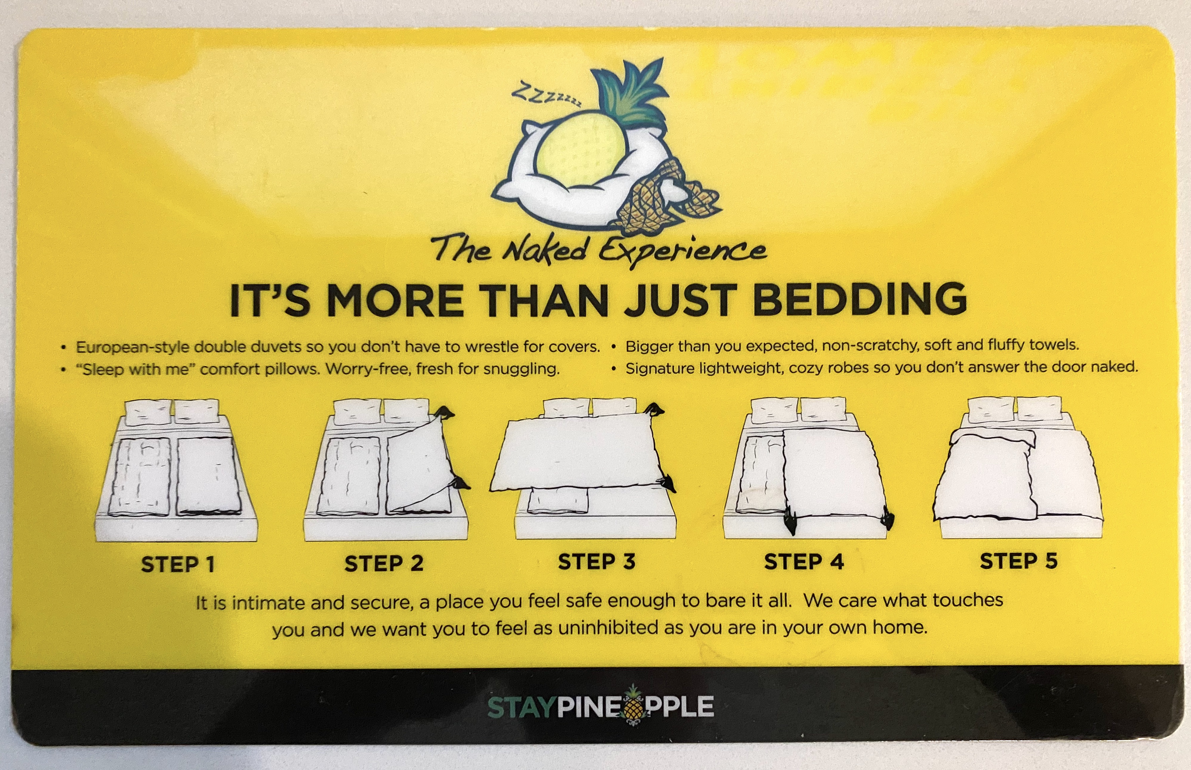 Don’t worry. It’s not a nudist hotel or anything. The property’s website says, “The Naked Experience, featuring cloud-like European-style individual duvets, cozy robes, and big thirsty towels, is easily the most comfortable you will ever be in a hotel. And it’s all crazy clean. So go ahead, get naked.”
