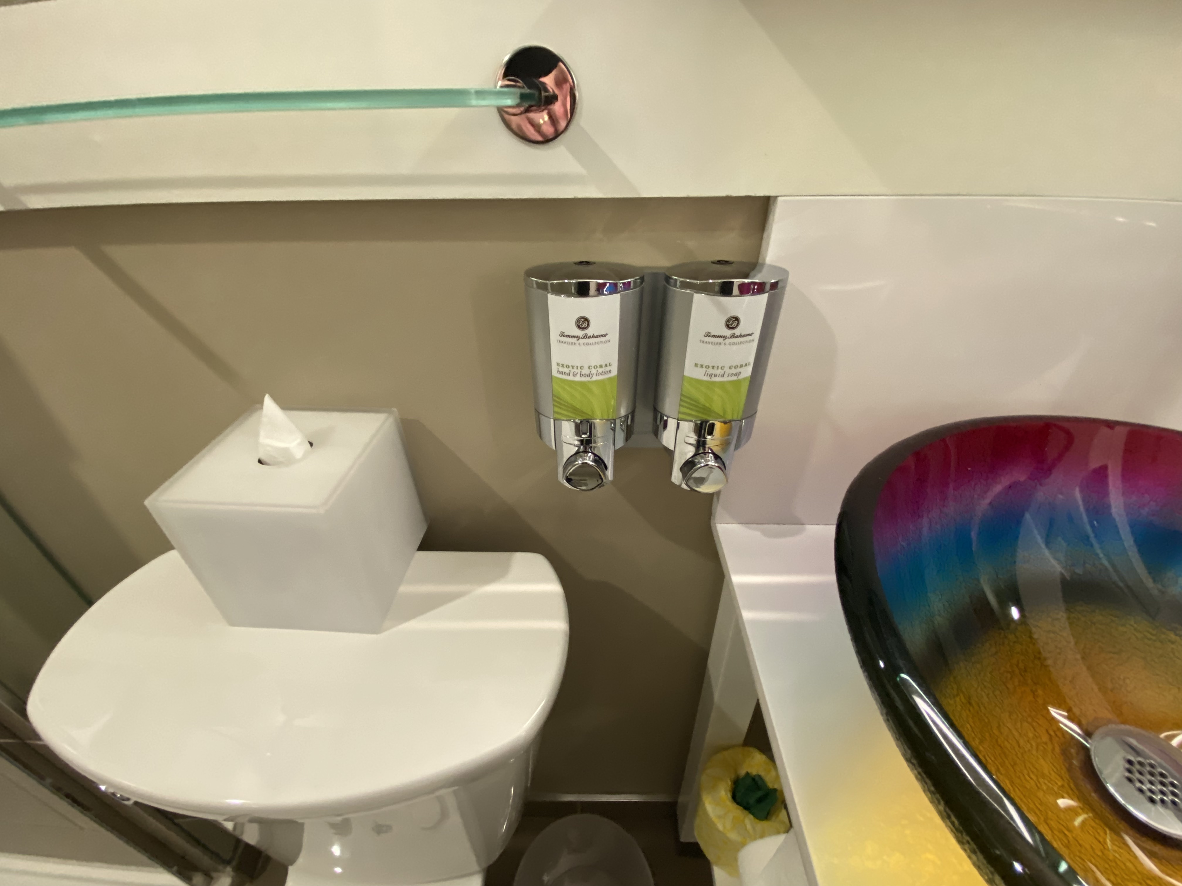 The shower’s water pressure was great — but make sure to bring your own toiletries. The shower gel and shampoo are wall-mounted.