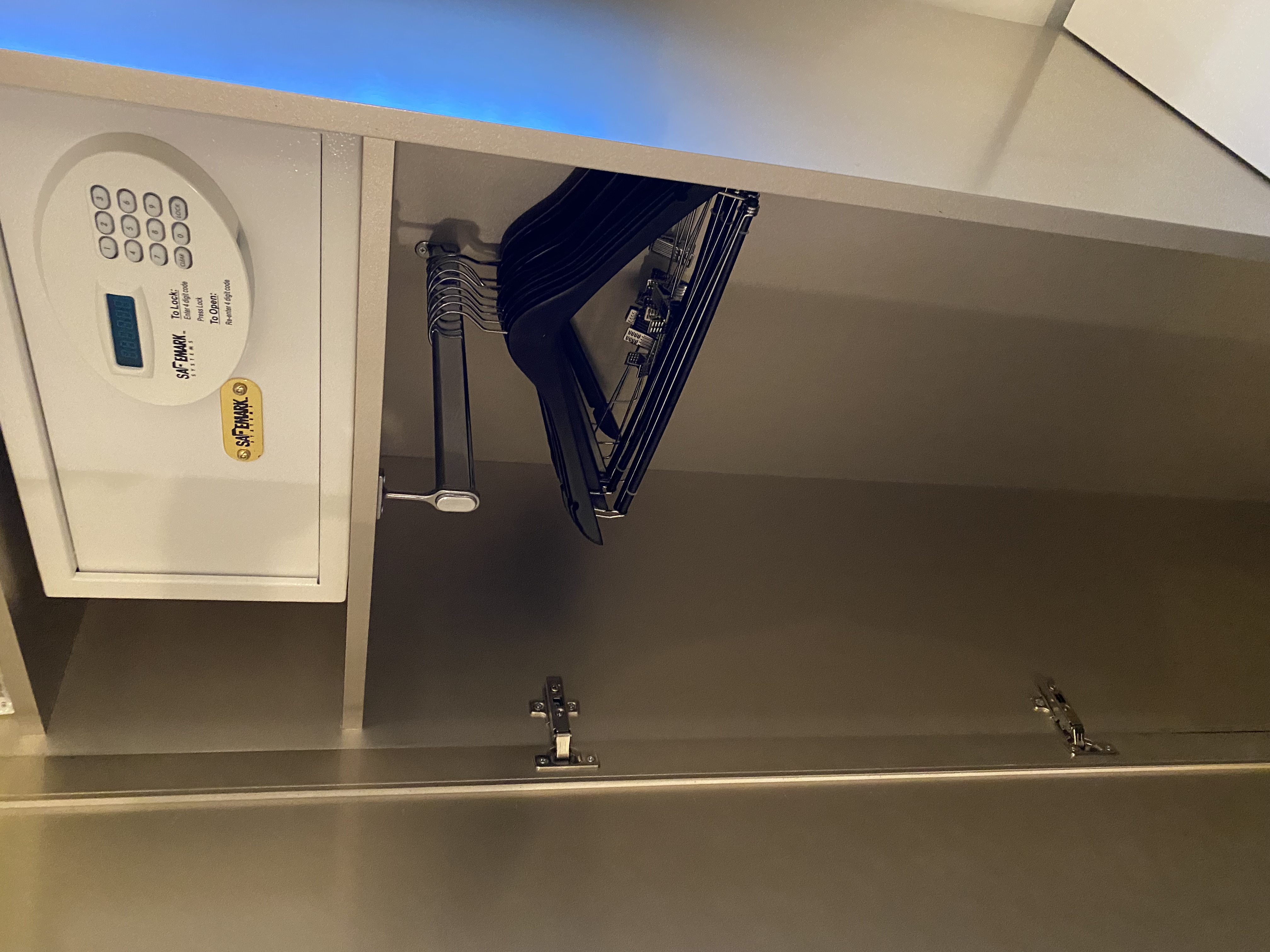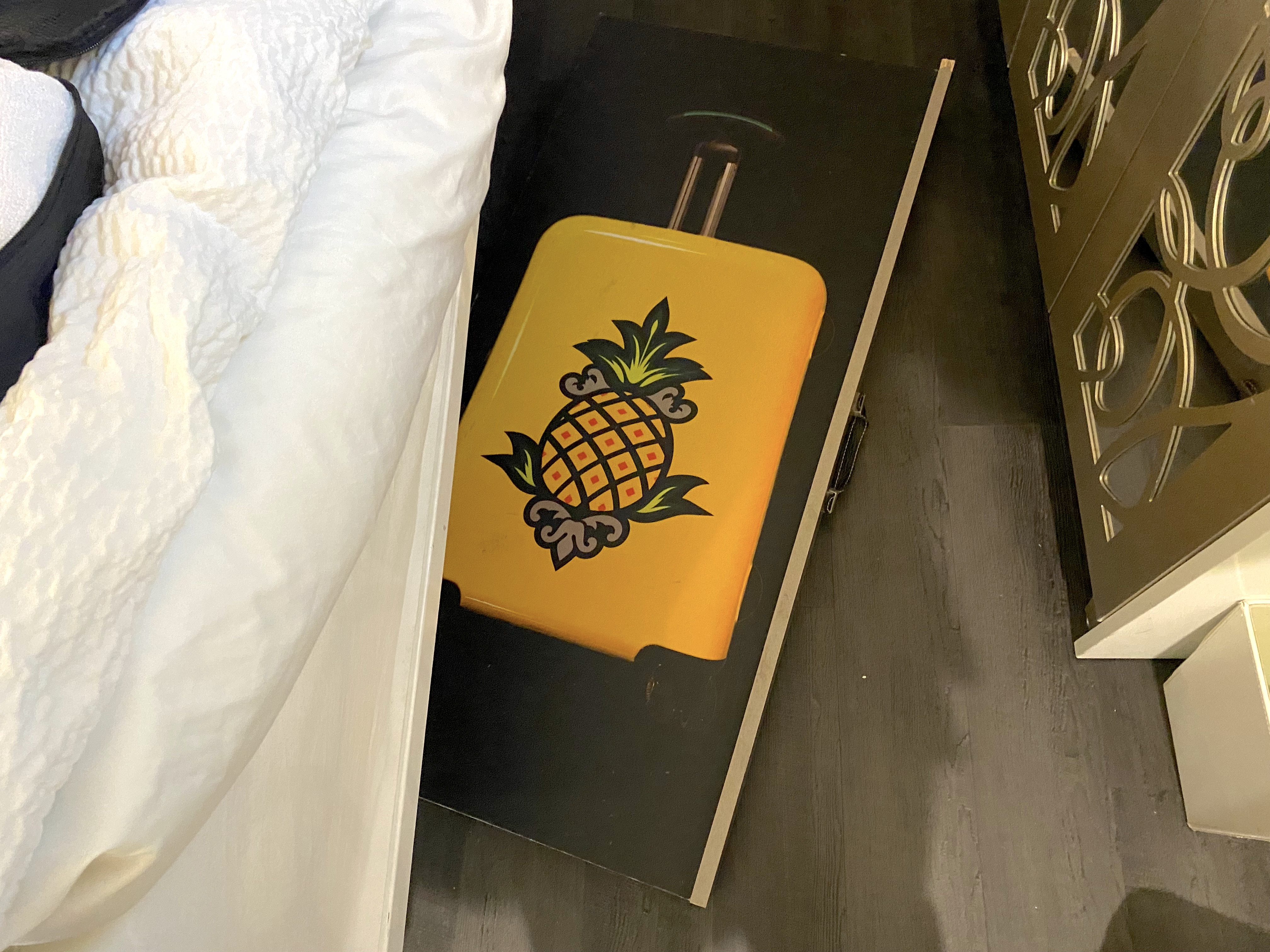 Because there’s not a large amount of room, you can put your luggage on this little under-bed trolly and slide it back!