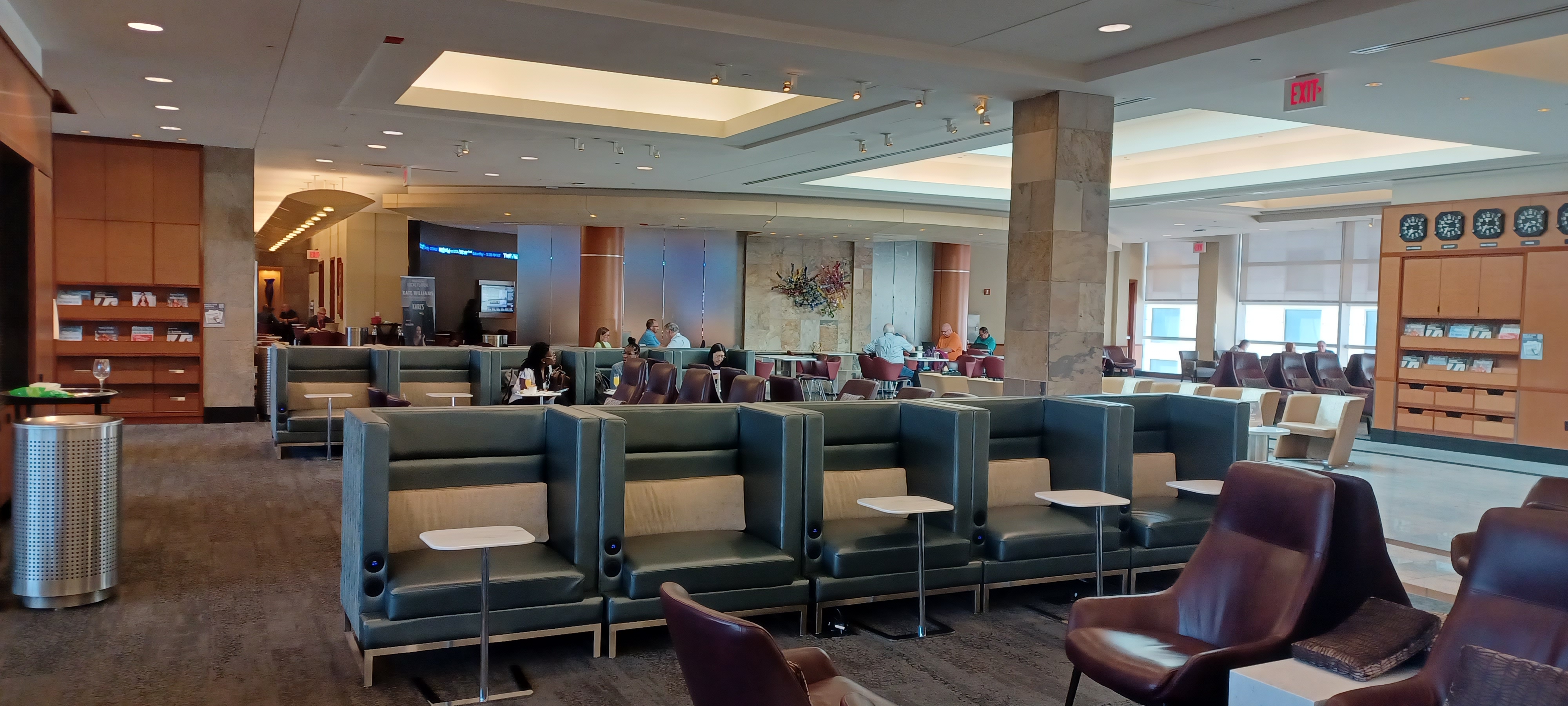 One of my favorite spots to get away from crowds in the club is back behind the showers and lavatories and they have even installed a Centurion-like large conference table and some quirky individual pod seats (they did not look very comfortable watching some use them).