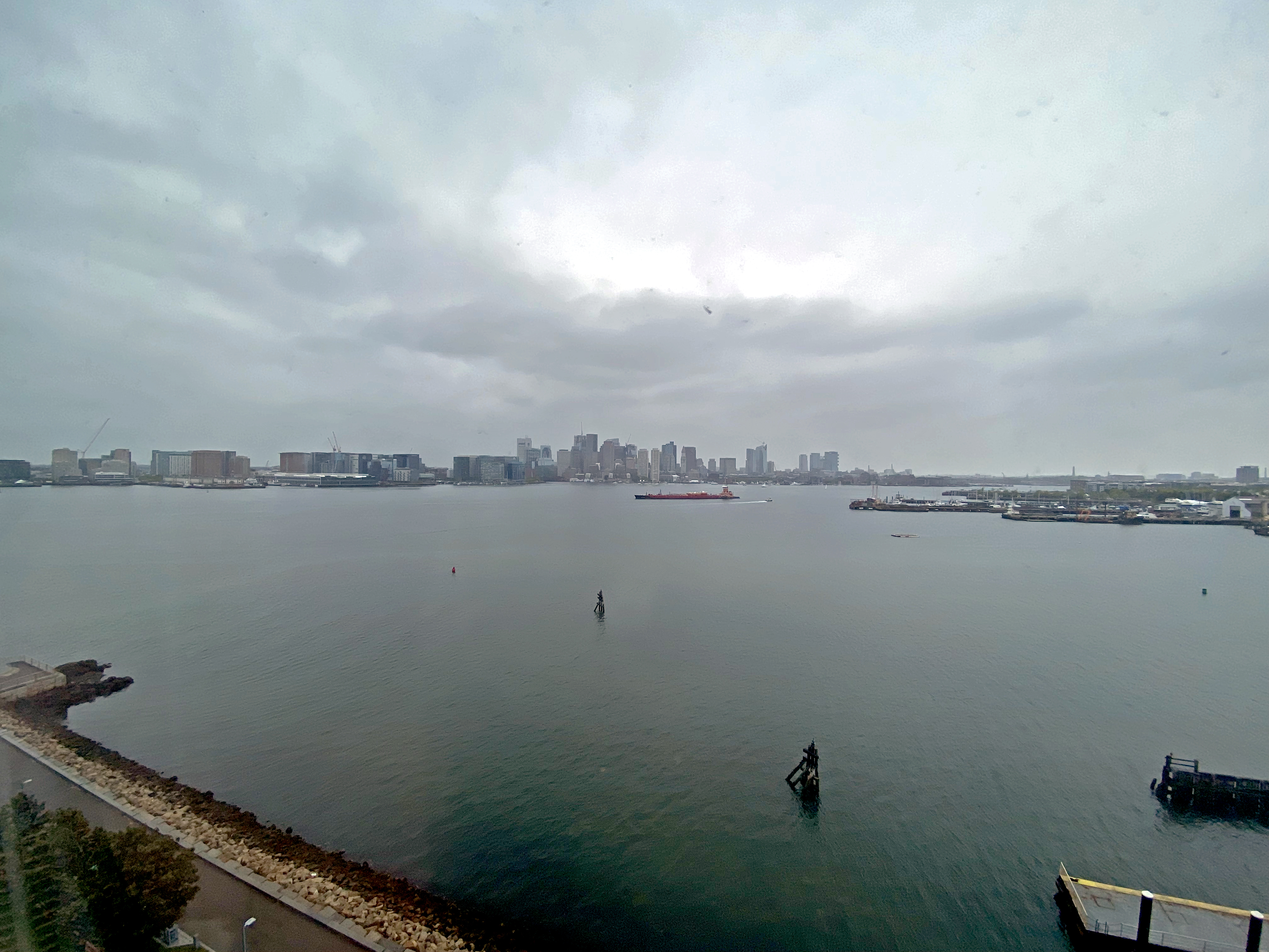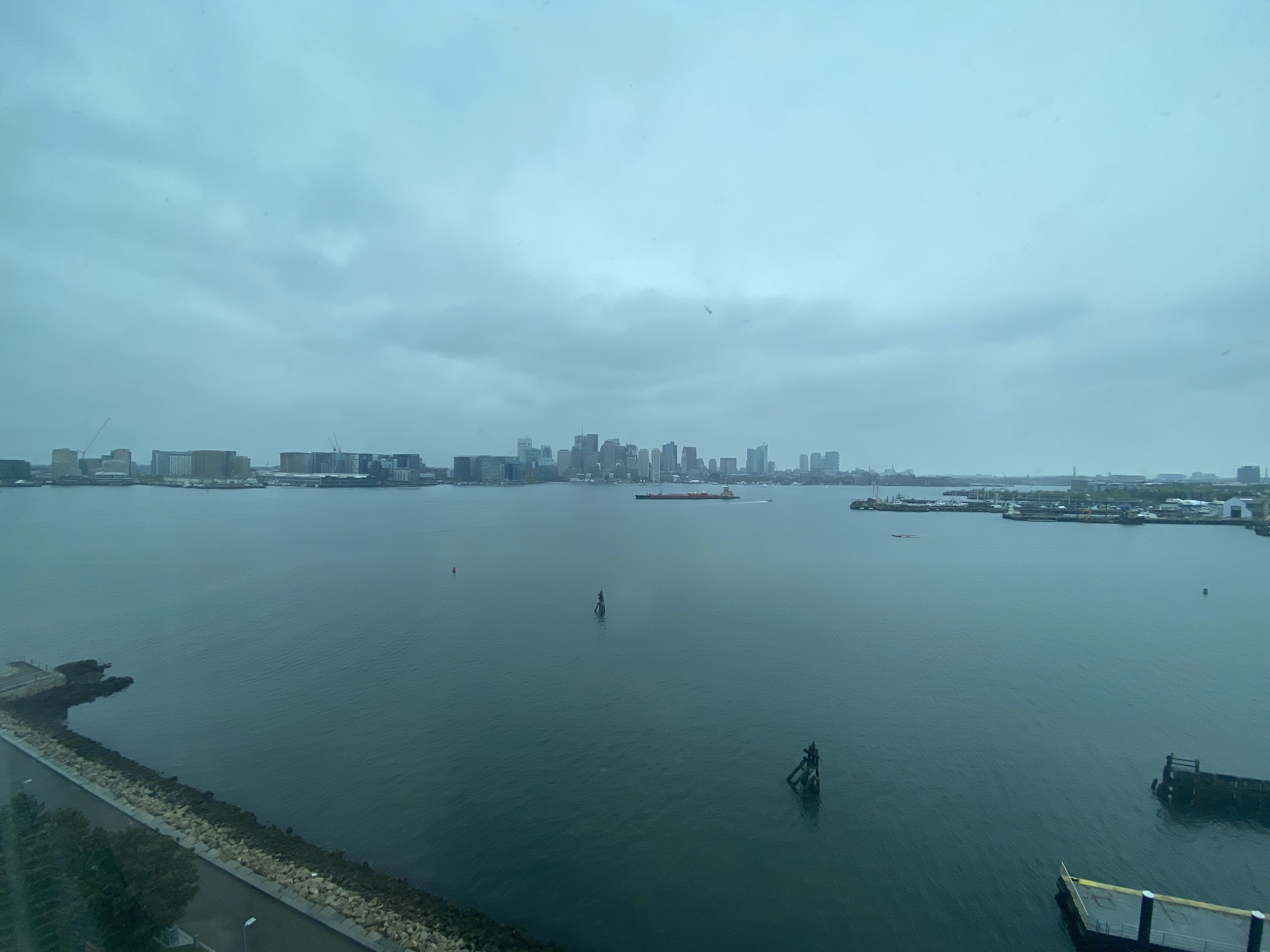 The windows have sort of a blue tint to them. Here’s the view I had of Boston Harbor on the cloudy, damp morning I departed.