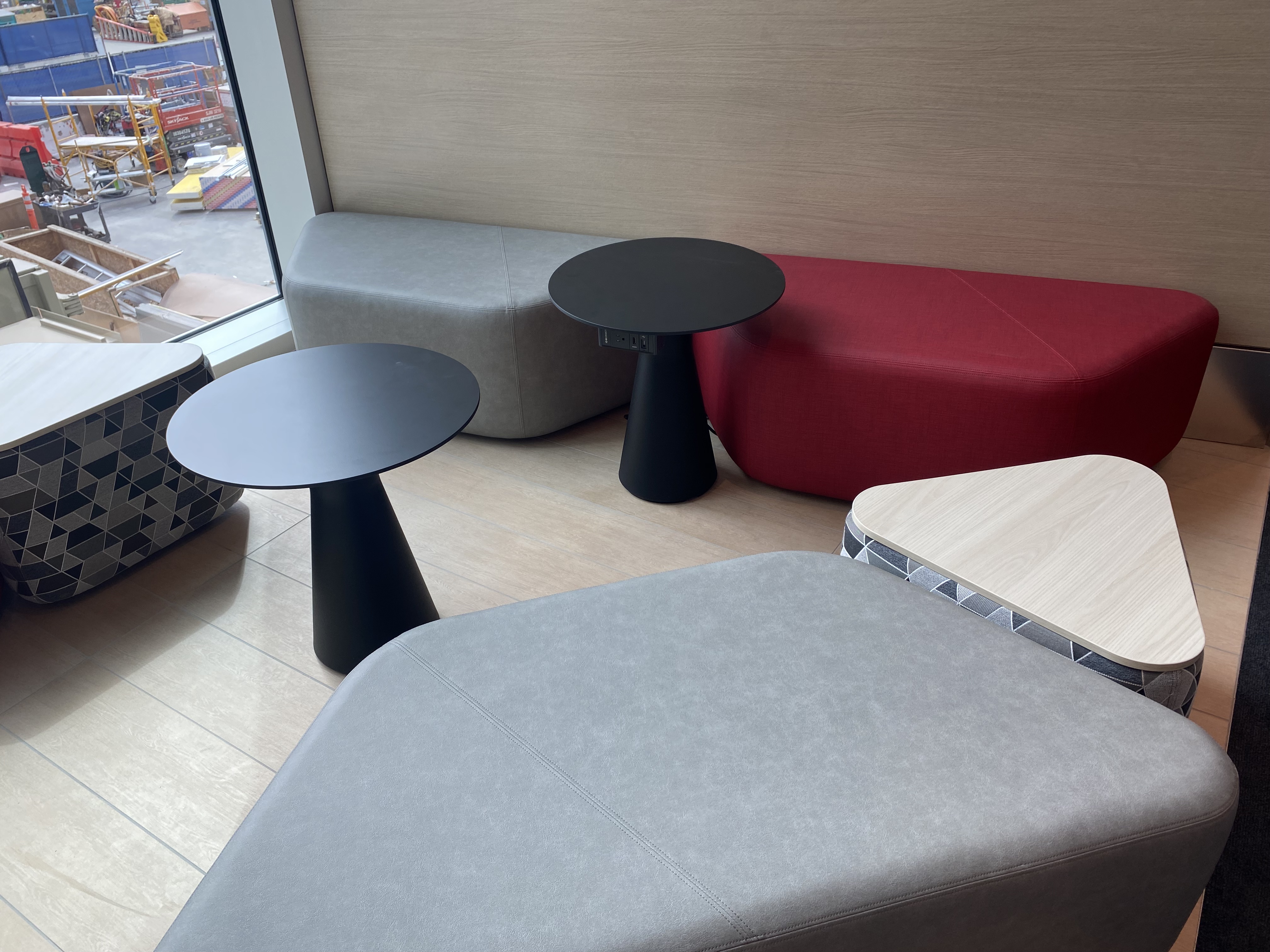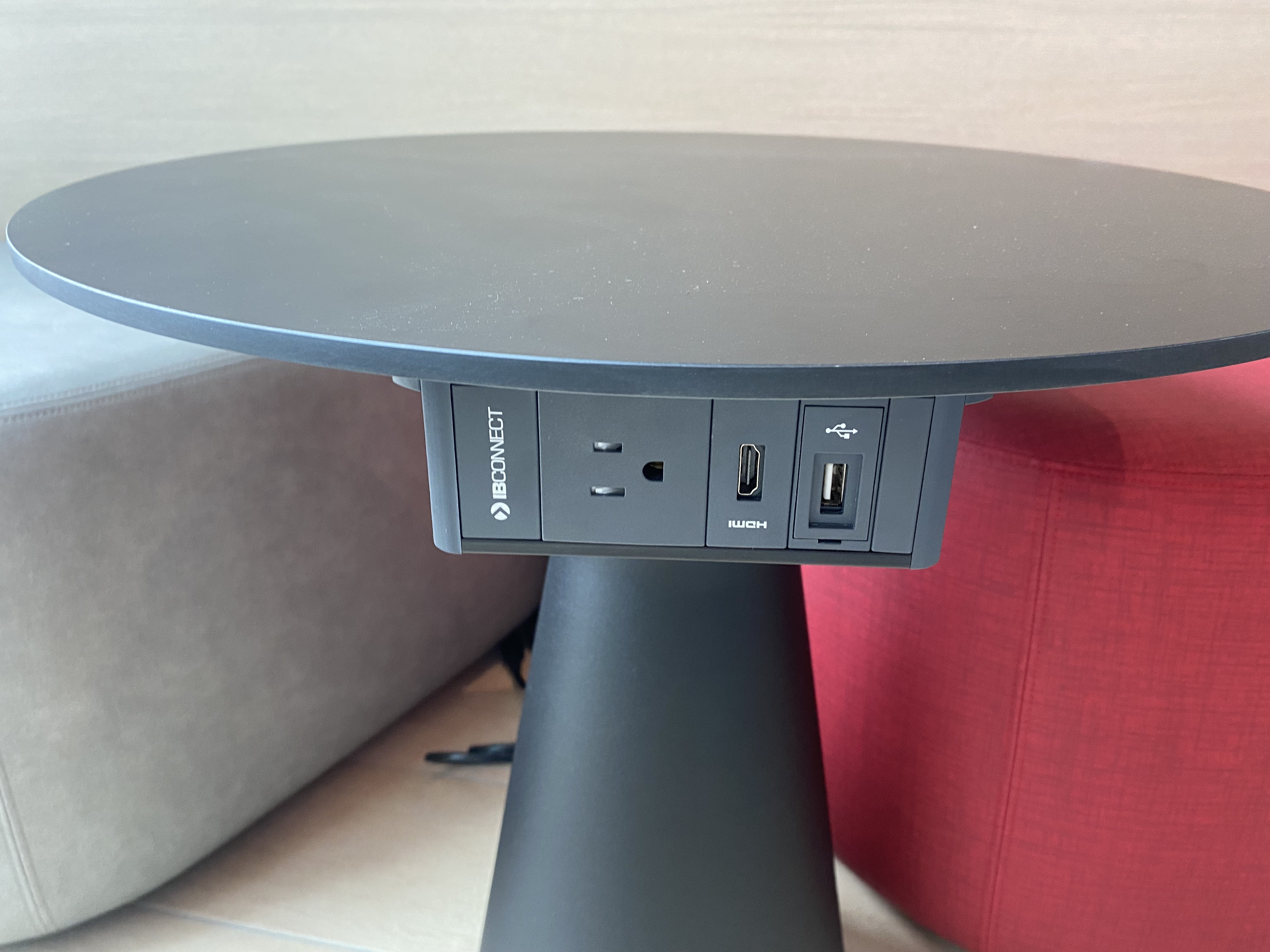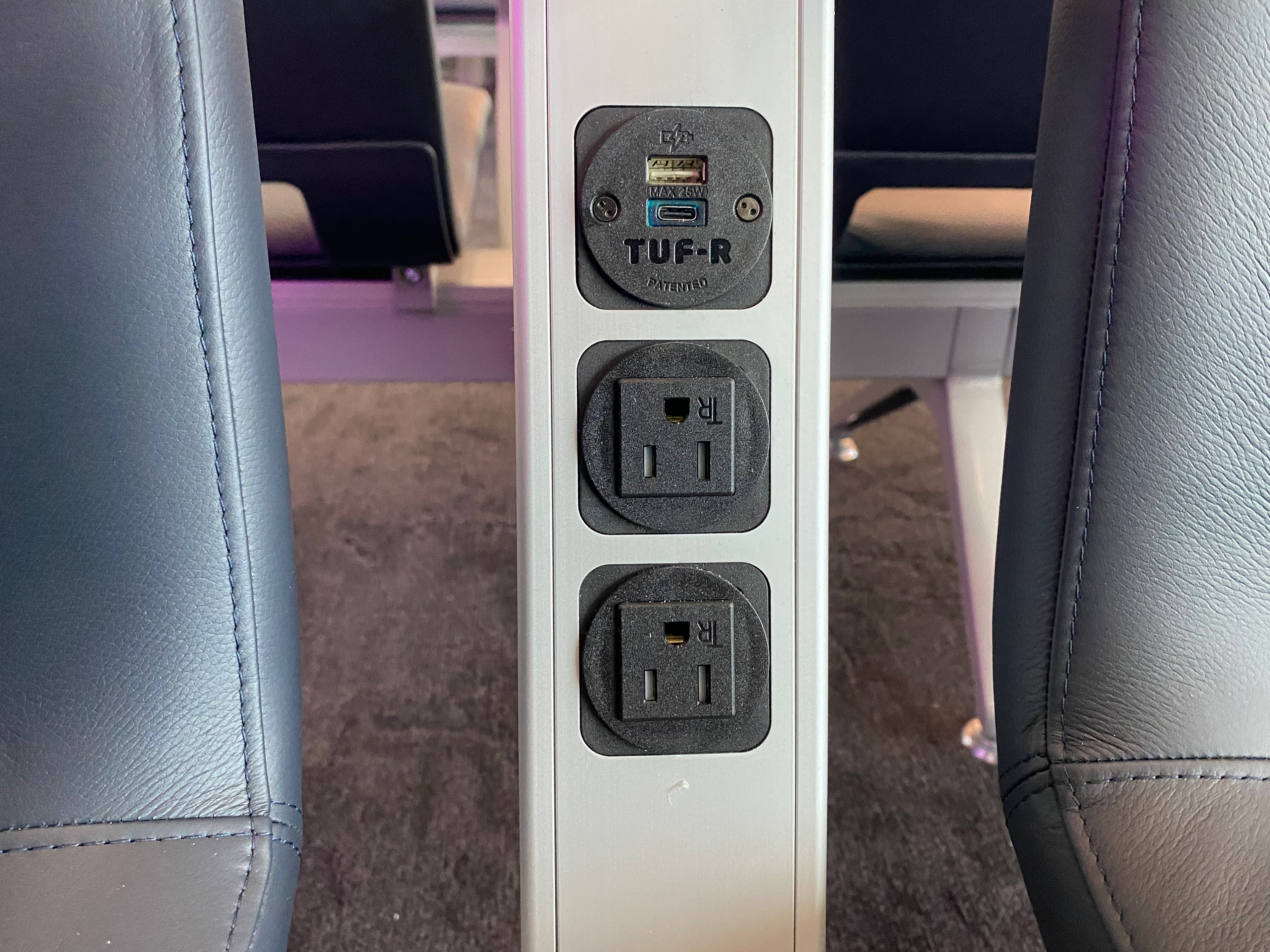 Between each seat are two electrical outlets, a USB-A port, and a USB-C port.