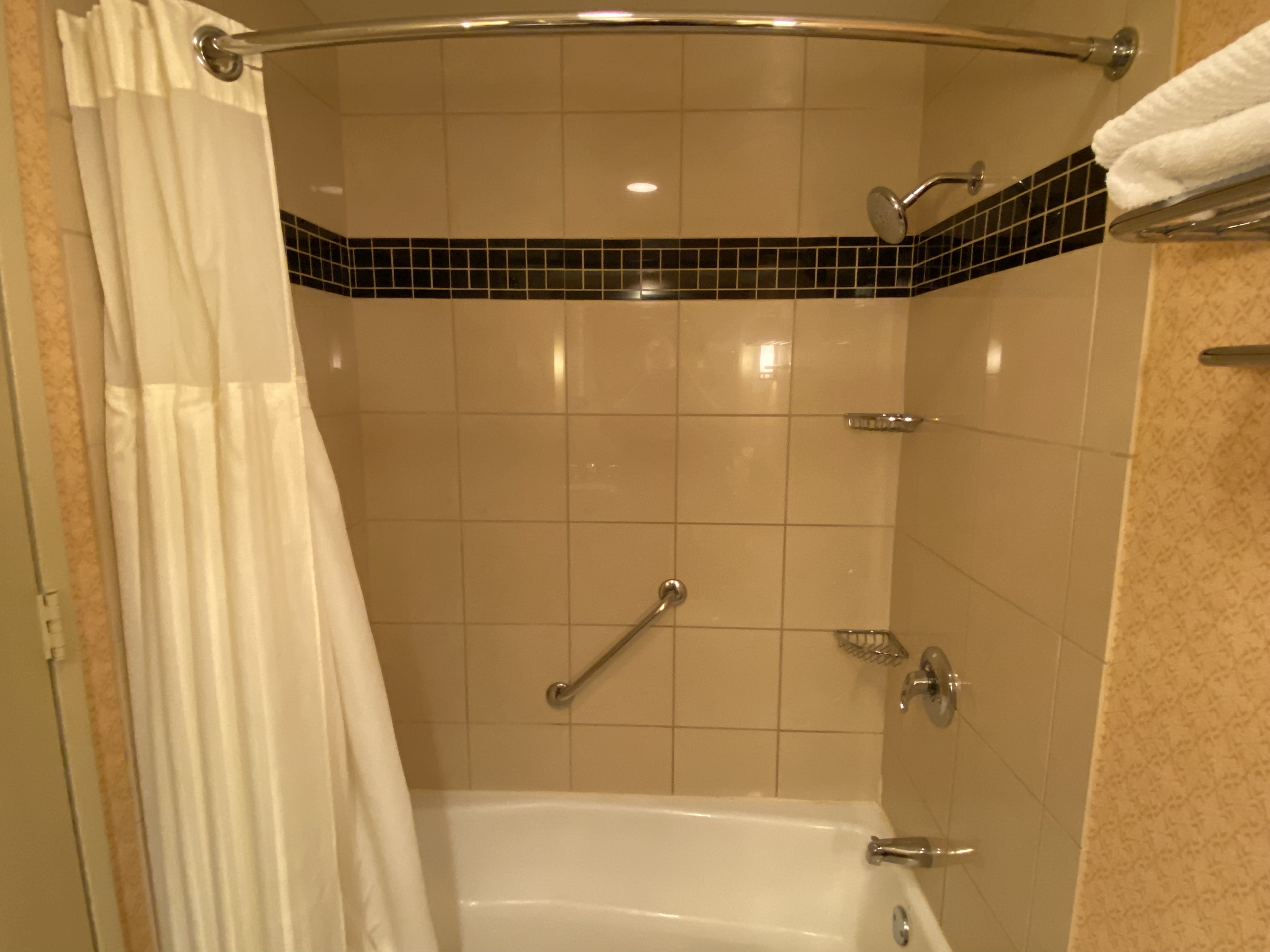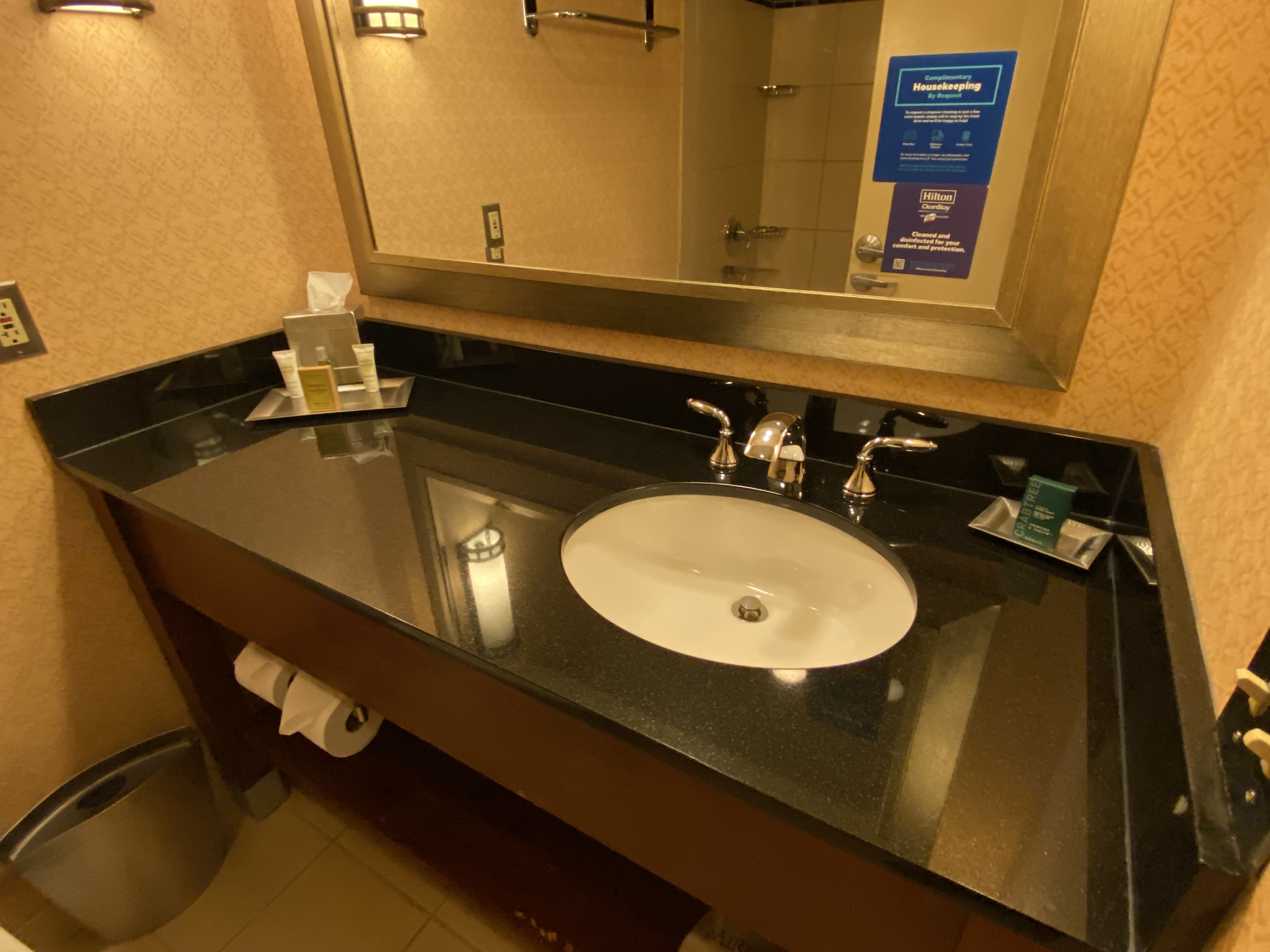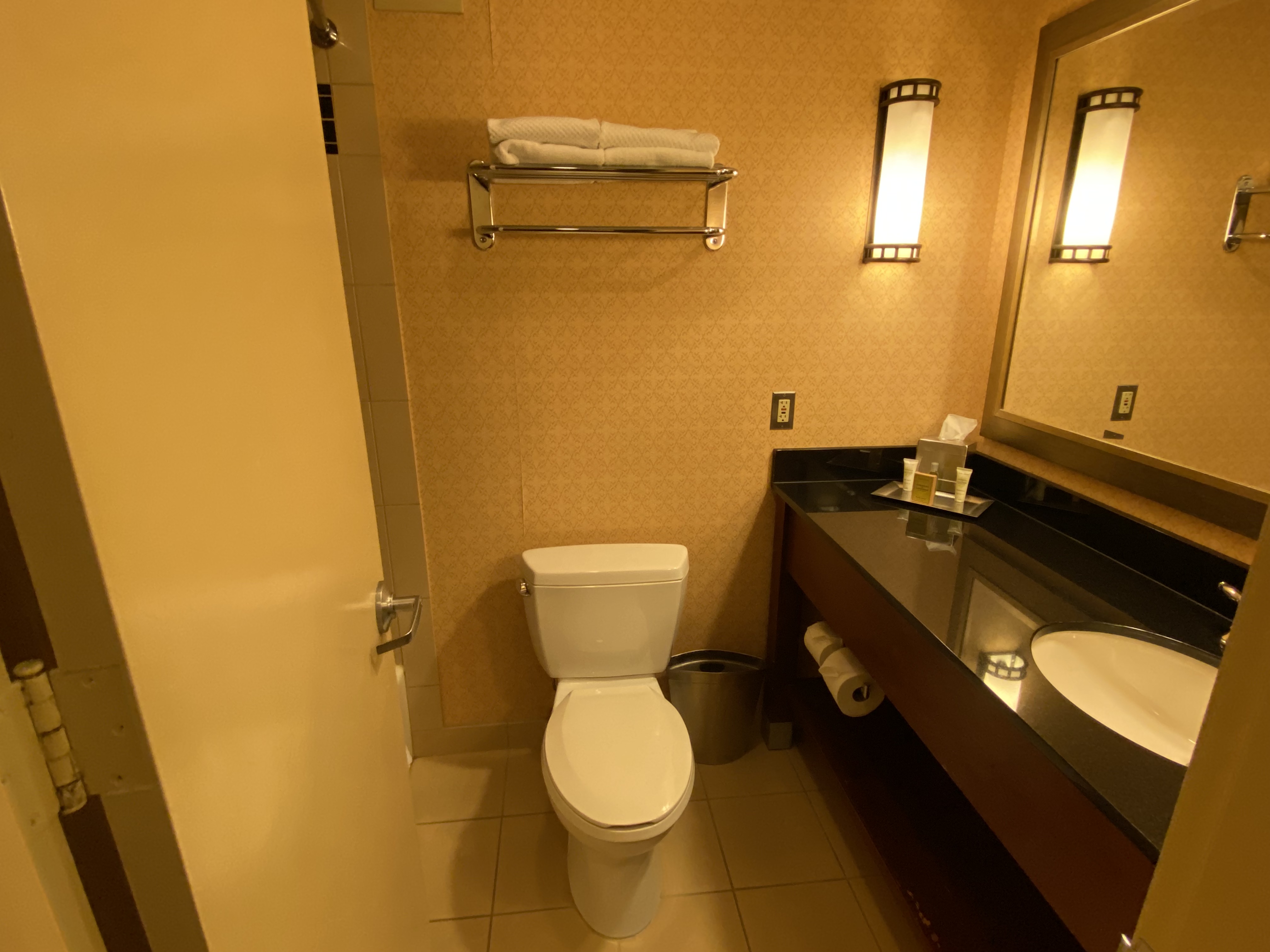 There weren’t any hand towels or washcloths — just two bath towels. Given I was the only room’s only occupant and there for one night, that certainly wasn’t a big deal. Again, it seems like Hilton knows you’re there only for the location. So, why bother with anything too fancy — like hand towels?