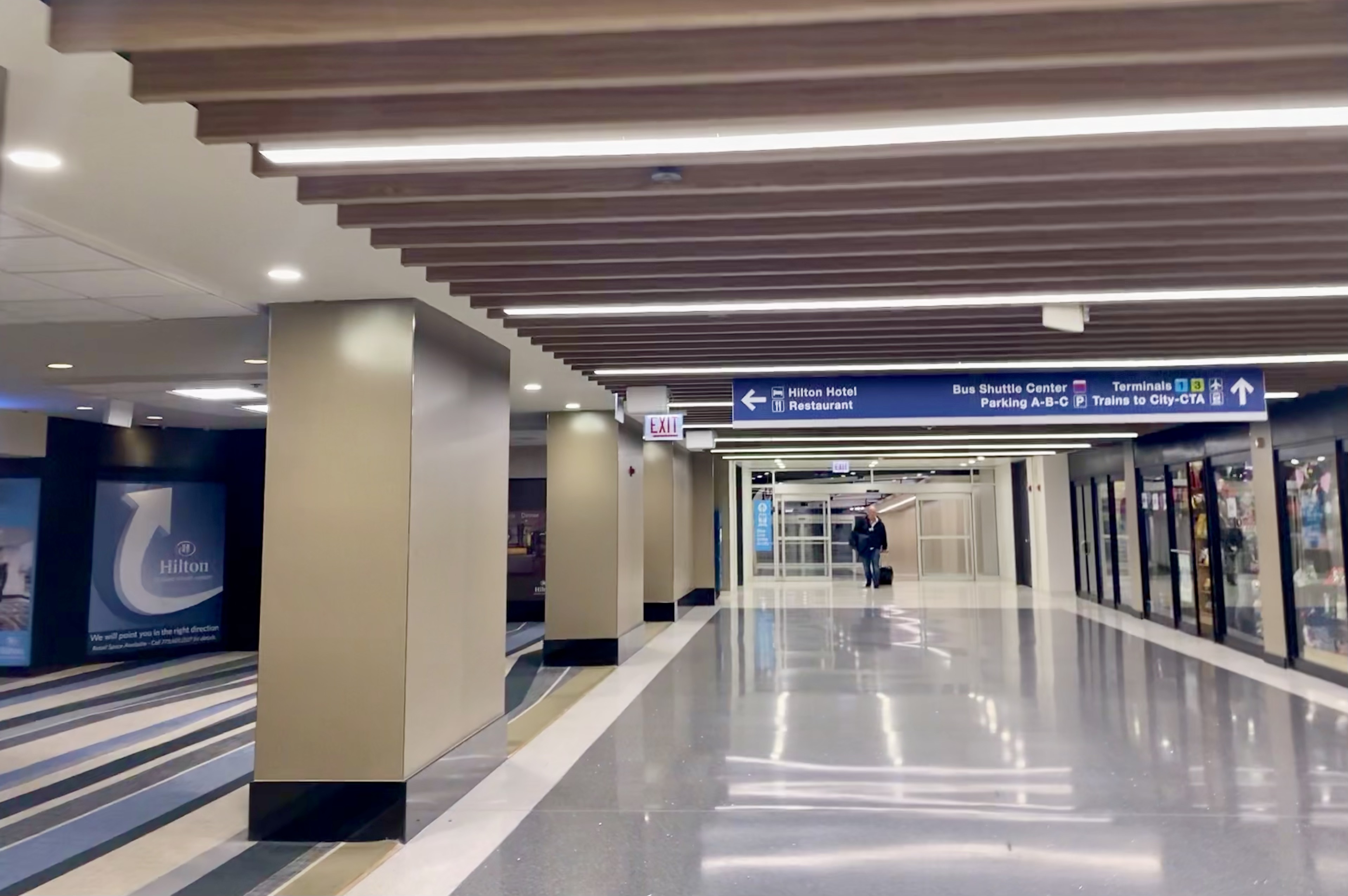 The Hilton Chicago O’Hare Airport Hotel is about a 5-minute walk from Terminal 2. And it’s around 5-7 minutes (depending on your route) to the Airport Transit System (ATS) tram that takes passengers to/from Terminals 1, 3, and 5, and the Multi-Modal Facility (rental cars, economy parking, etc.).