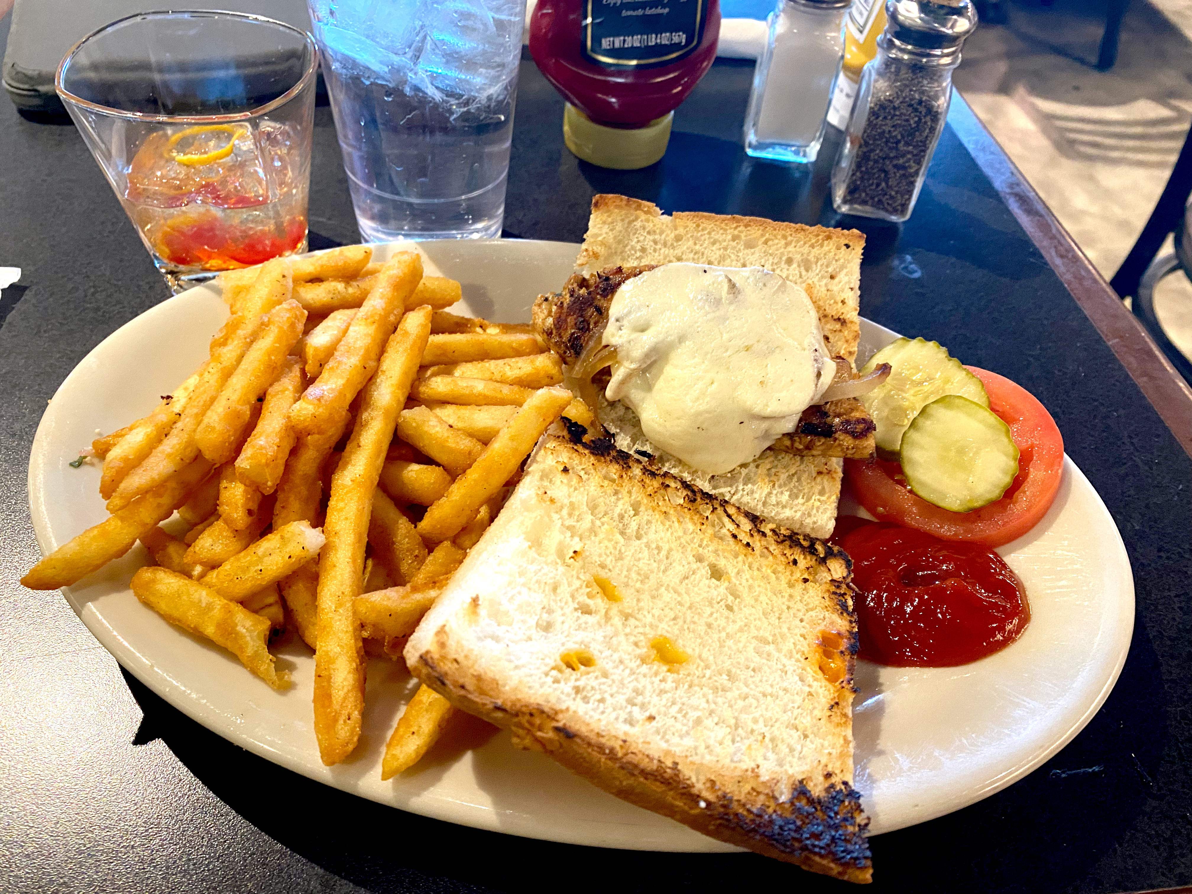 I ordered a Buffalo Trace Old Fashioned to wet my whistle. It was fine — but a little sweet, thanks to the muddled maraschino cherries and oranges. (I’m not a fan of muddled fruit in my Old Fashioneds. I’ll order a fruit salad if I want one. 🙂 ).