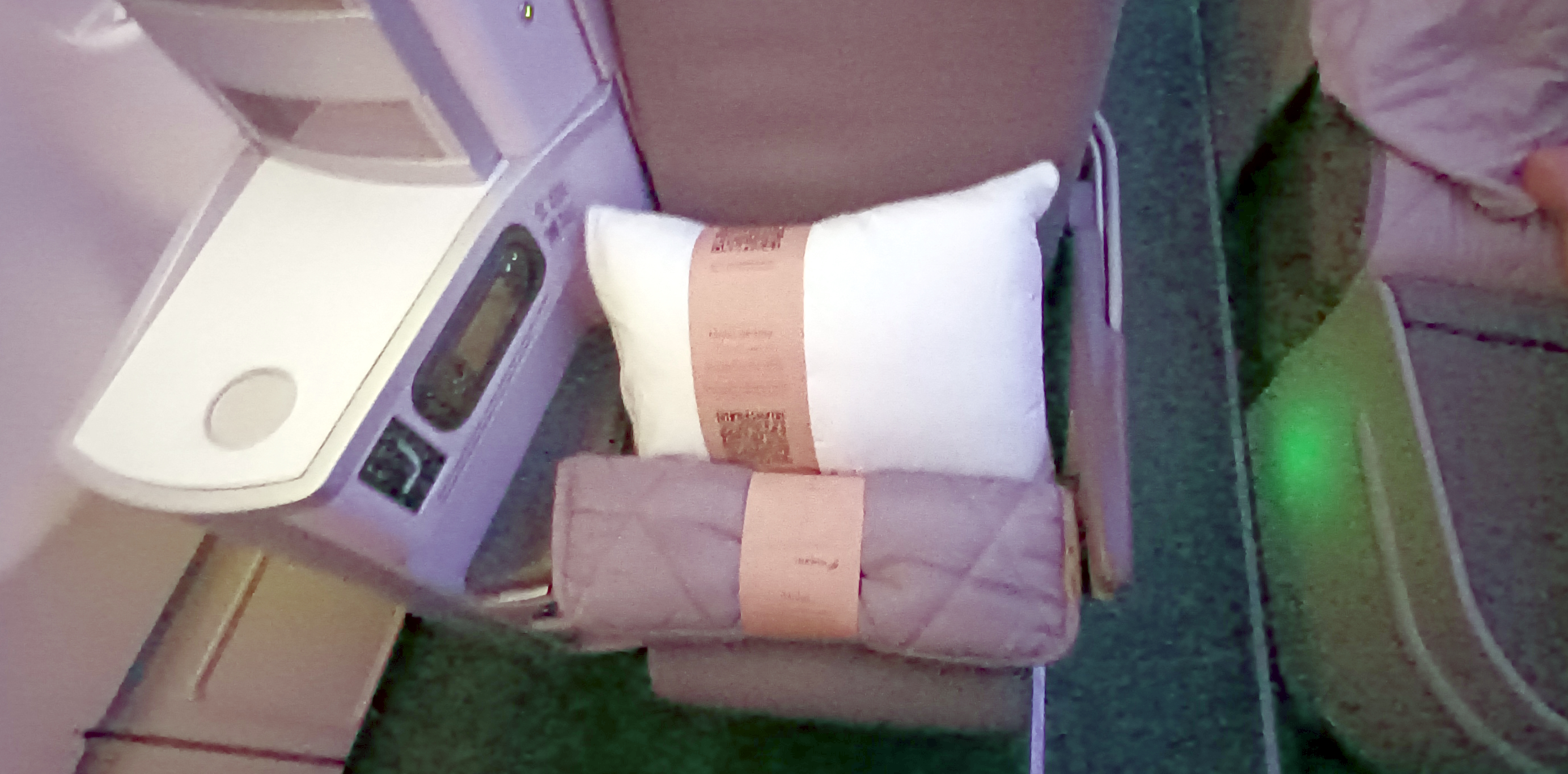With these seats very dated I appreciated the rolled up cover that went completely over your seat / bed. A nice touch with the pillow and blanket that were both comfortable. But there was one big issue.