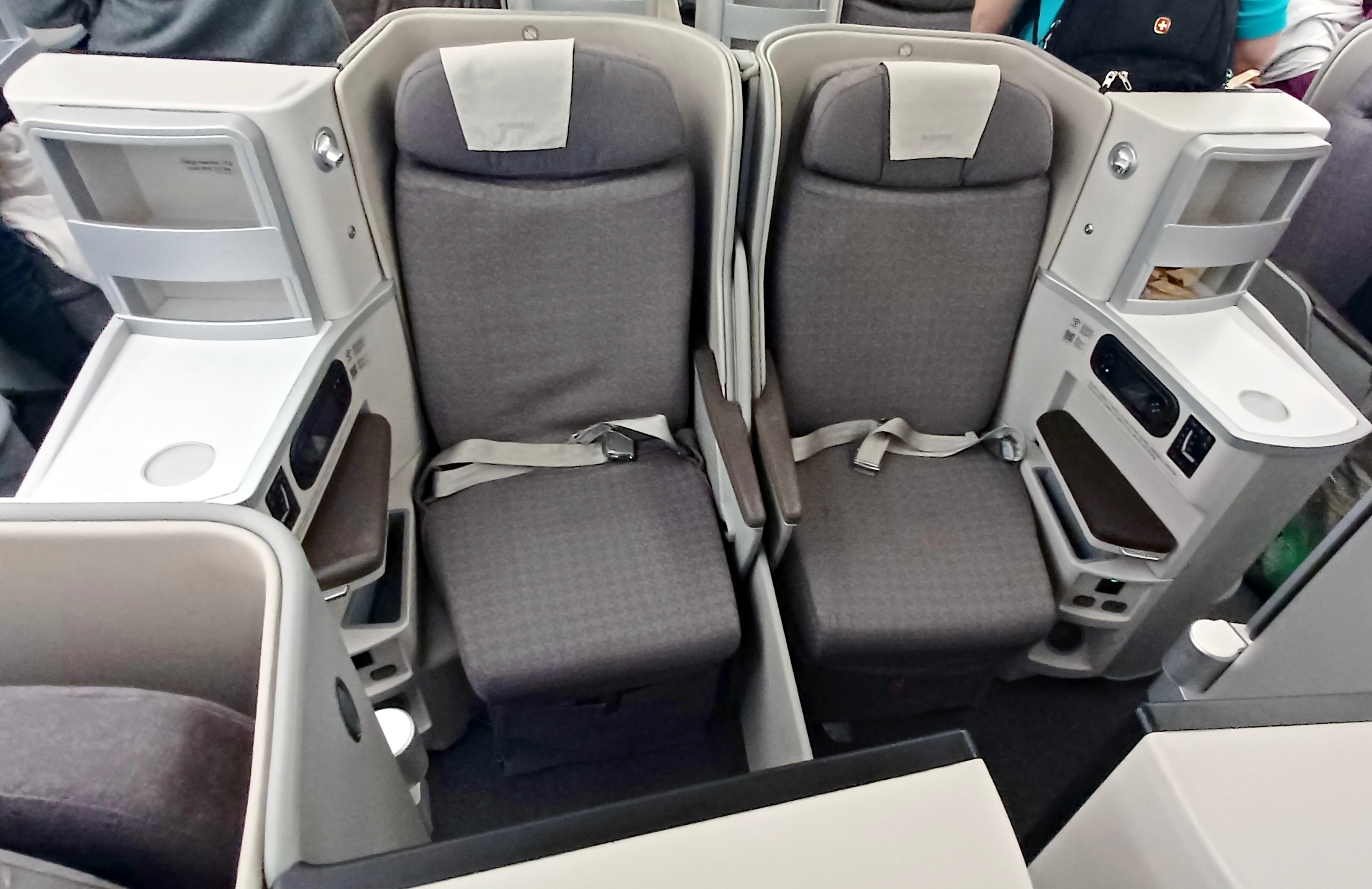 We had chosen, in the middle of the cabin, the “honeymoon suites” as many call them, that is, you are sitting VERY close to your seat mate. Closer than any seat I have ever flown (well in business or first class that is). In fact my wife, who tends to sleep on her side, encroached a bit with her knee in my seat (but that’s OK).