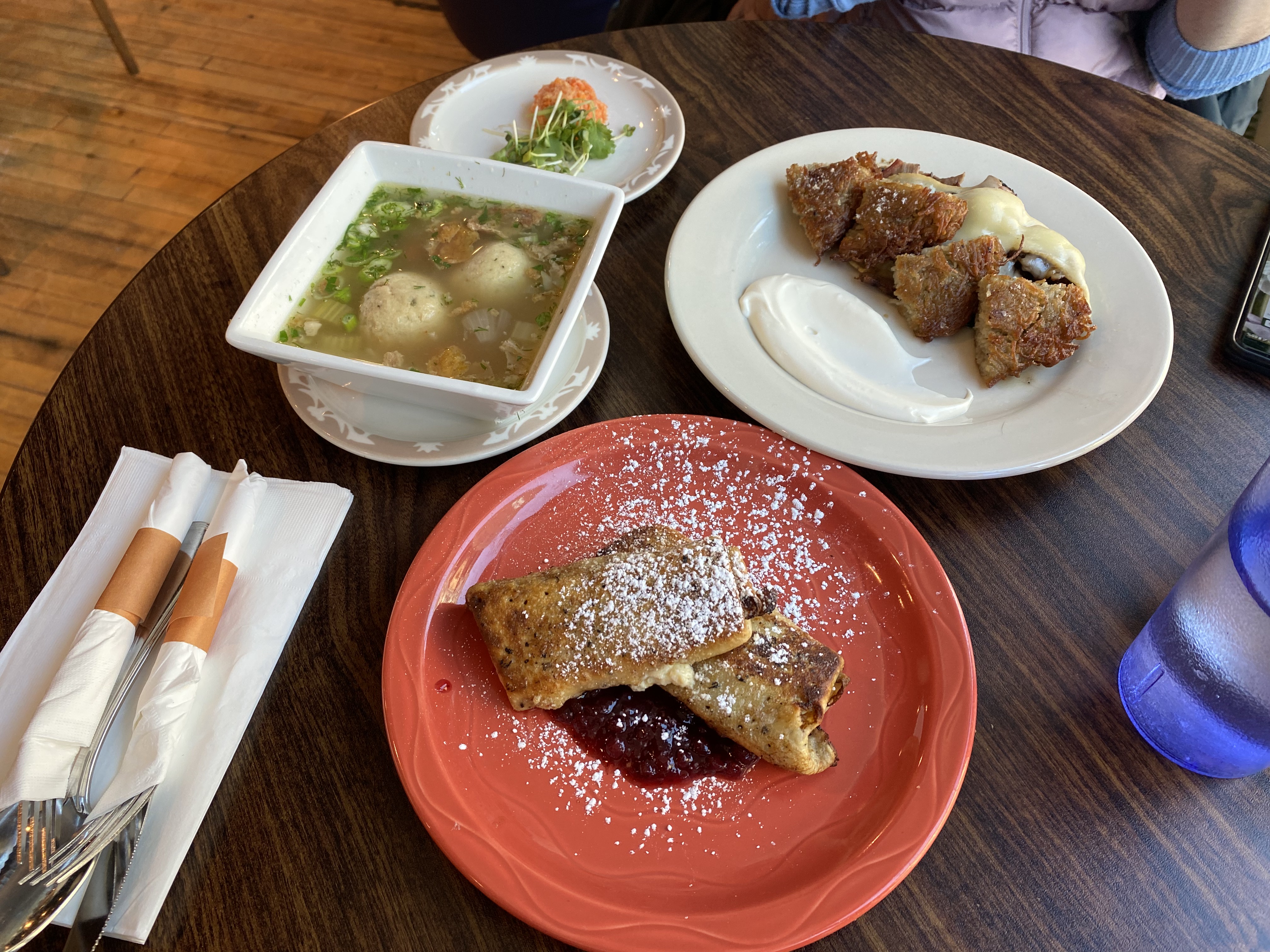 We ordered the Latke + Brisket, Sarah’s Blintzes, and Myron’s Chicken Matzo Ball Soup.