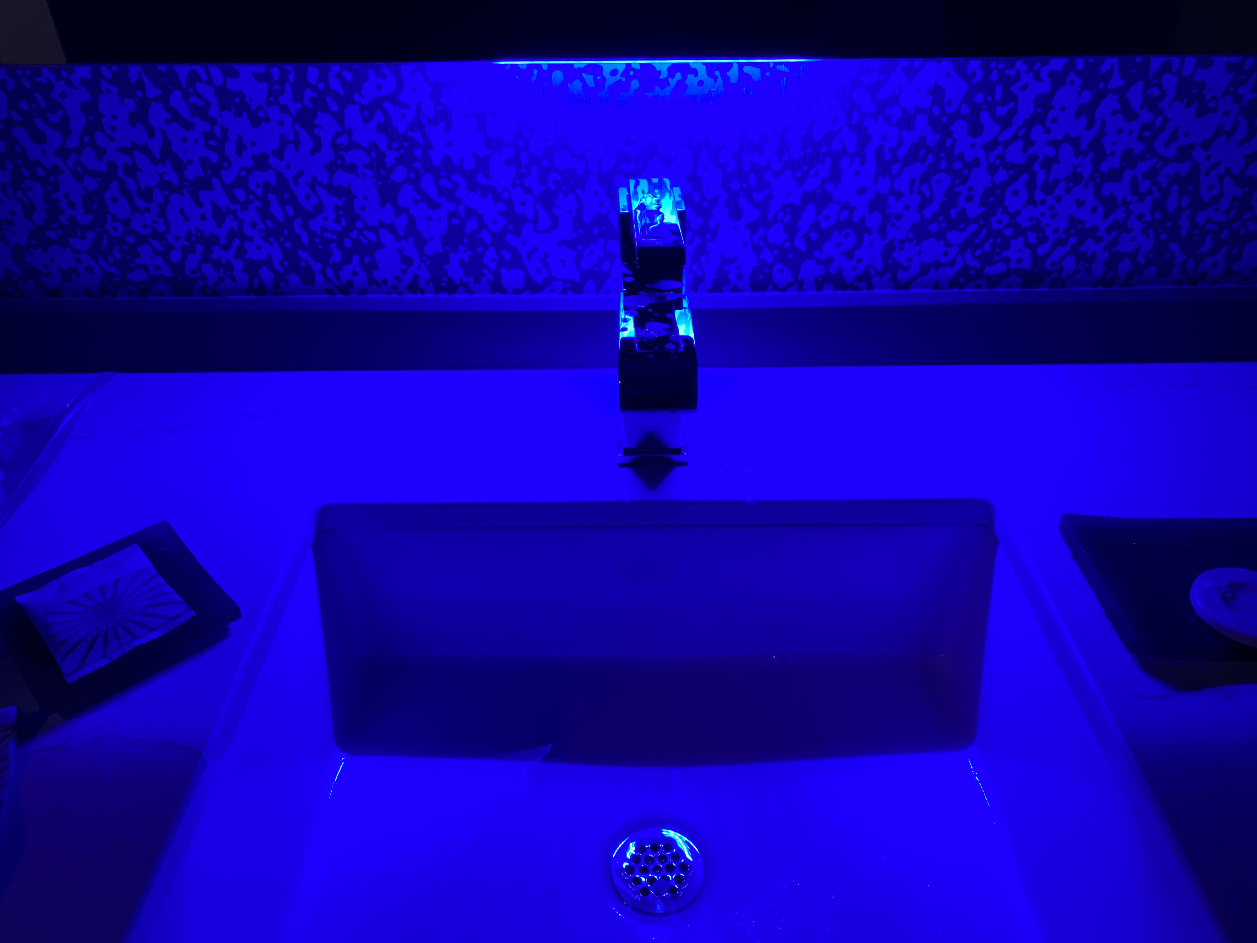At night, this blue light comes on above the sink.