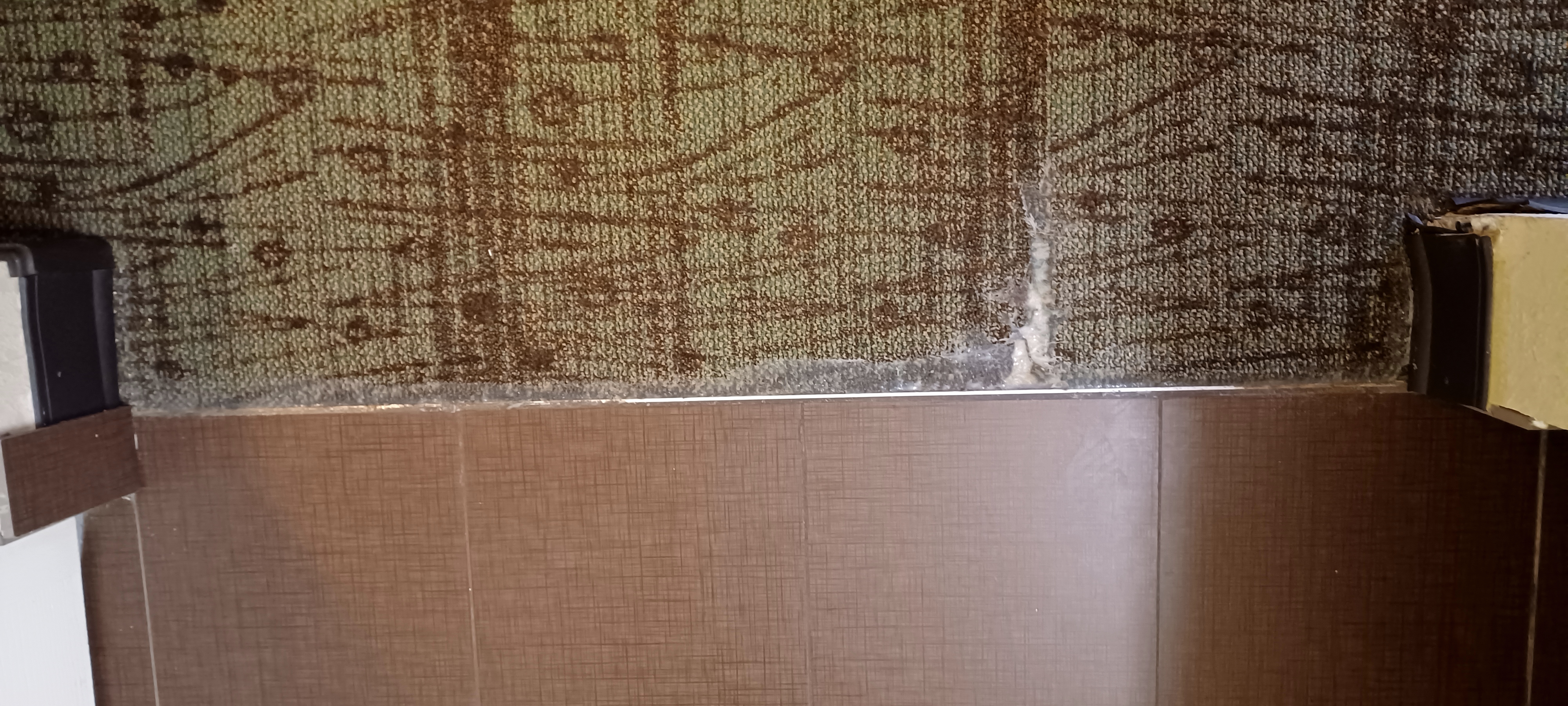 The carpet was gone in the hallway outside our “suite”. That kinda was a good thing because the rest of the carpet in the hallways was disgusting. Oh and then the carpet in our room was…