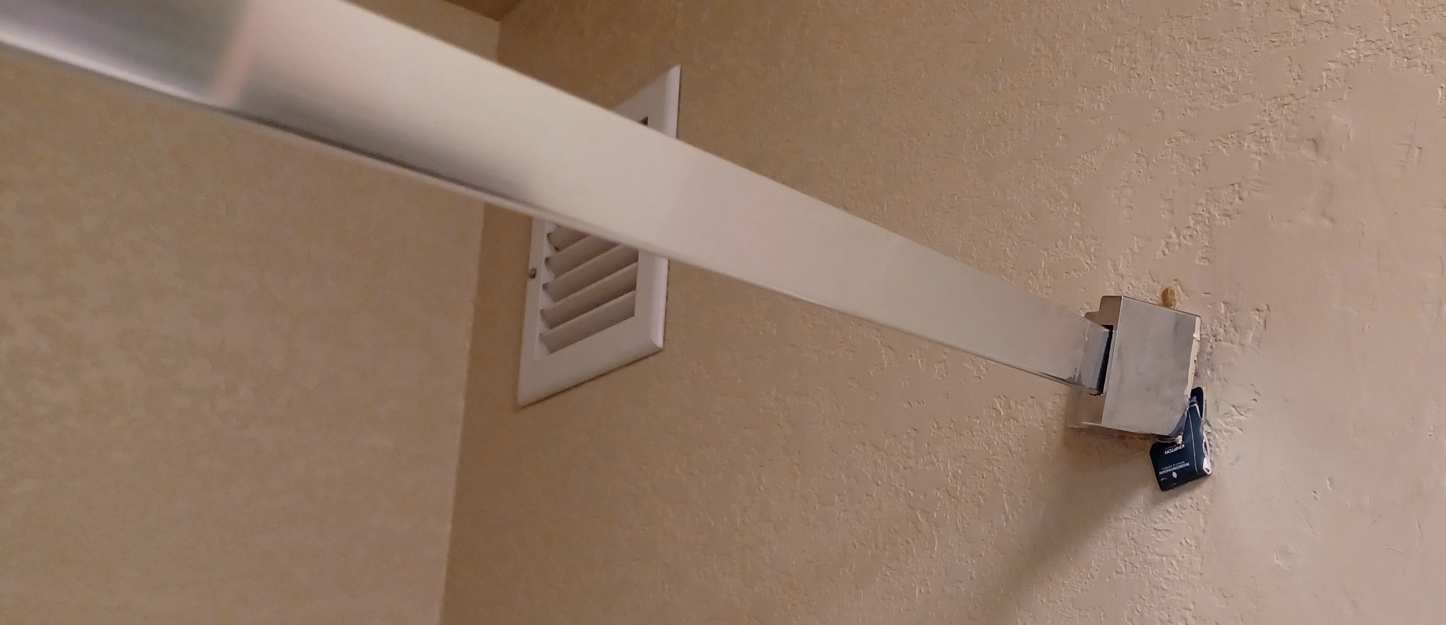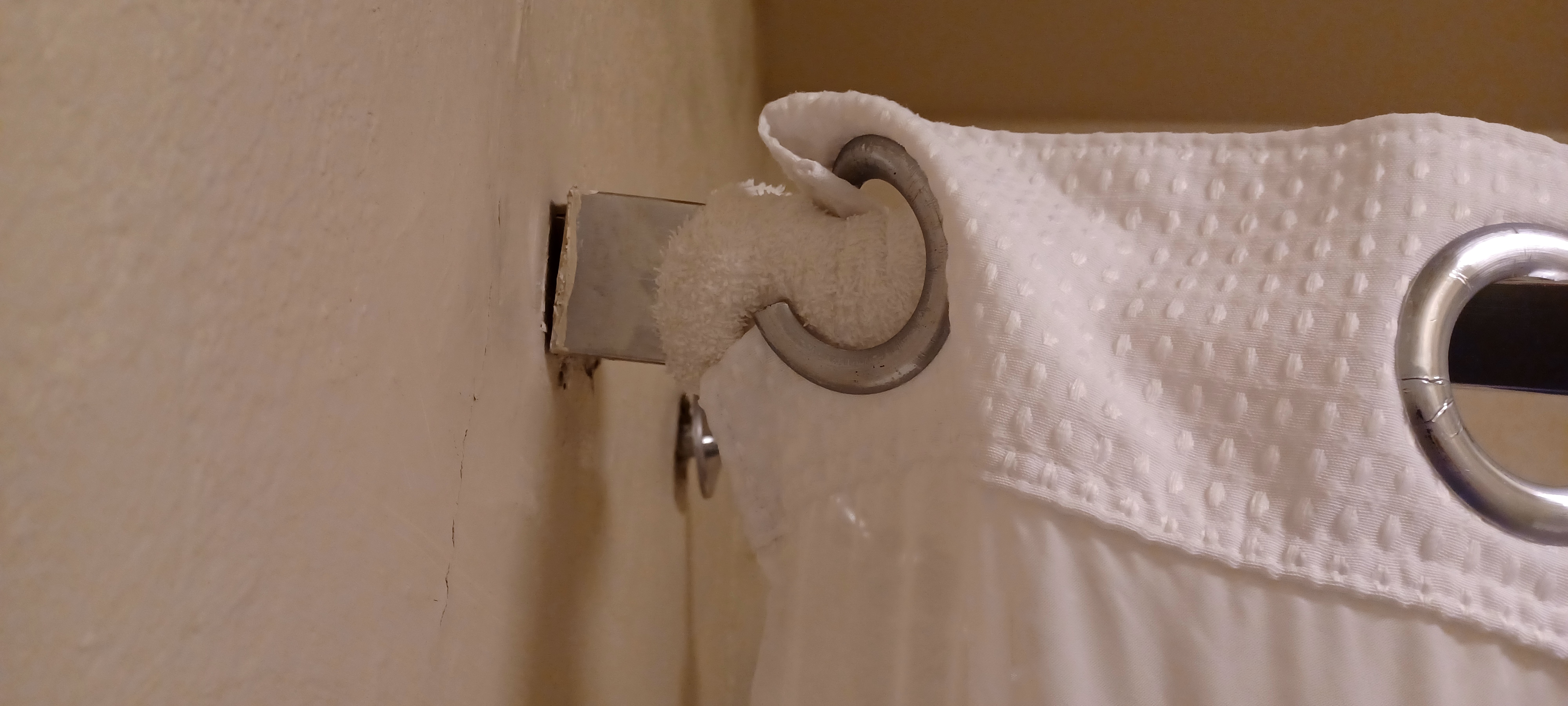 The only way we could get the curtain to not slide completely towards the middle was to wrap towels at either end and “clamp” the curtain in place. Oh it gets worse.