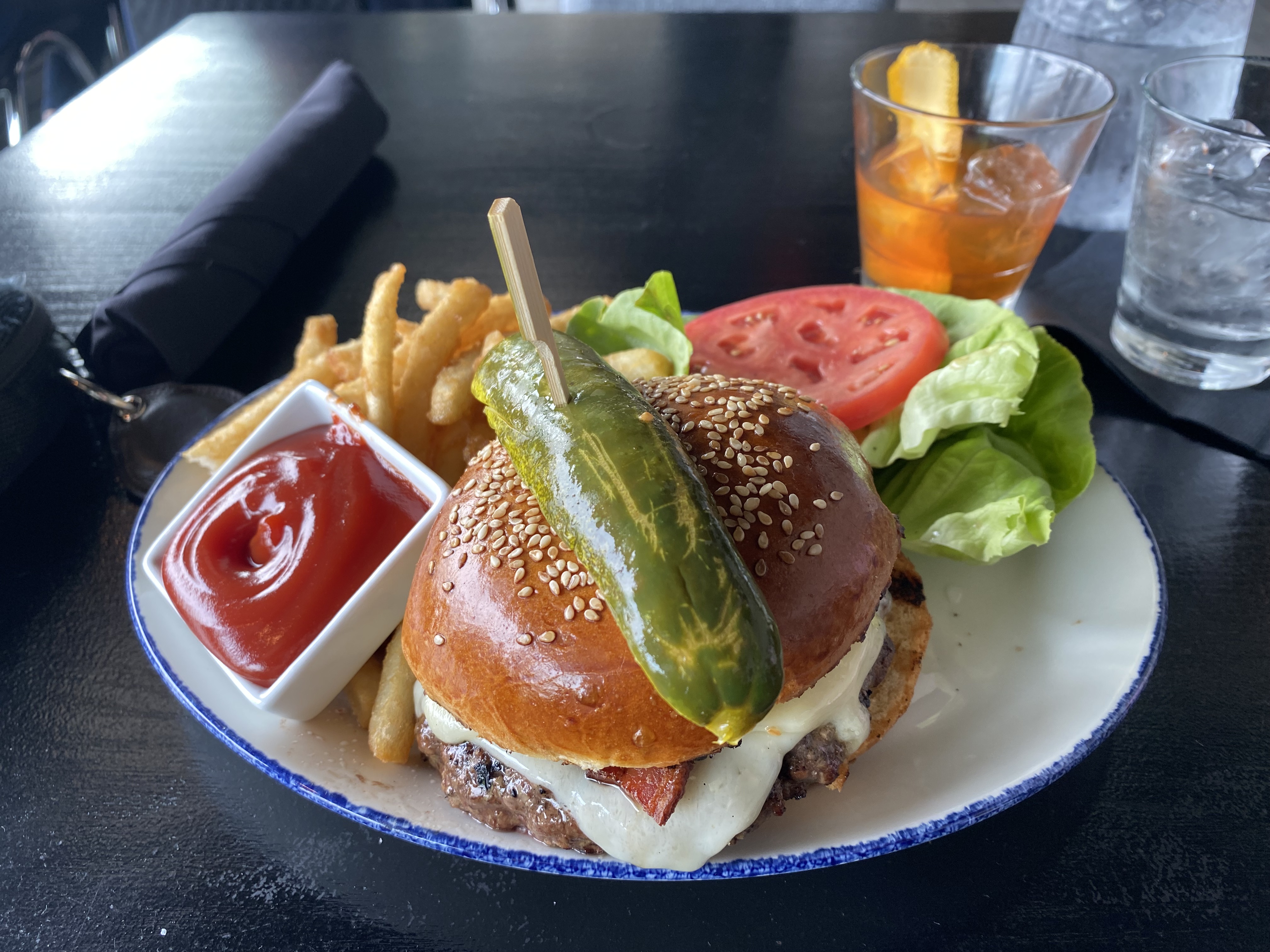Regular readers of this blog also won’t be surprised that I ordered a hamburger. The Vue Burger comes with truffle mayo, bacon, gouda, onion jam, lettuce, oyster mushroom, and pickles. (I asked for the mayo on the side.)