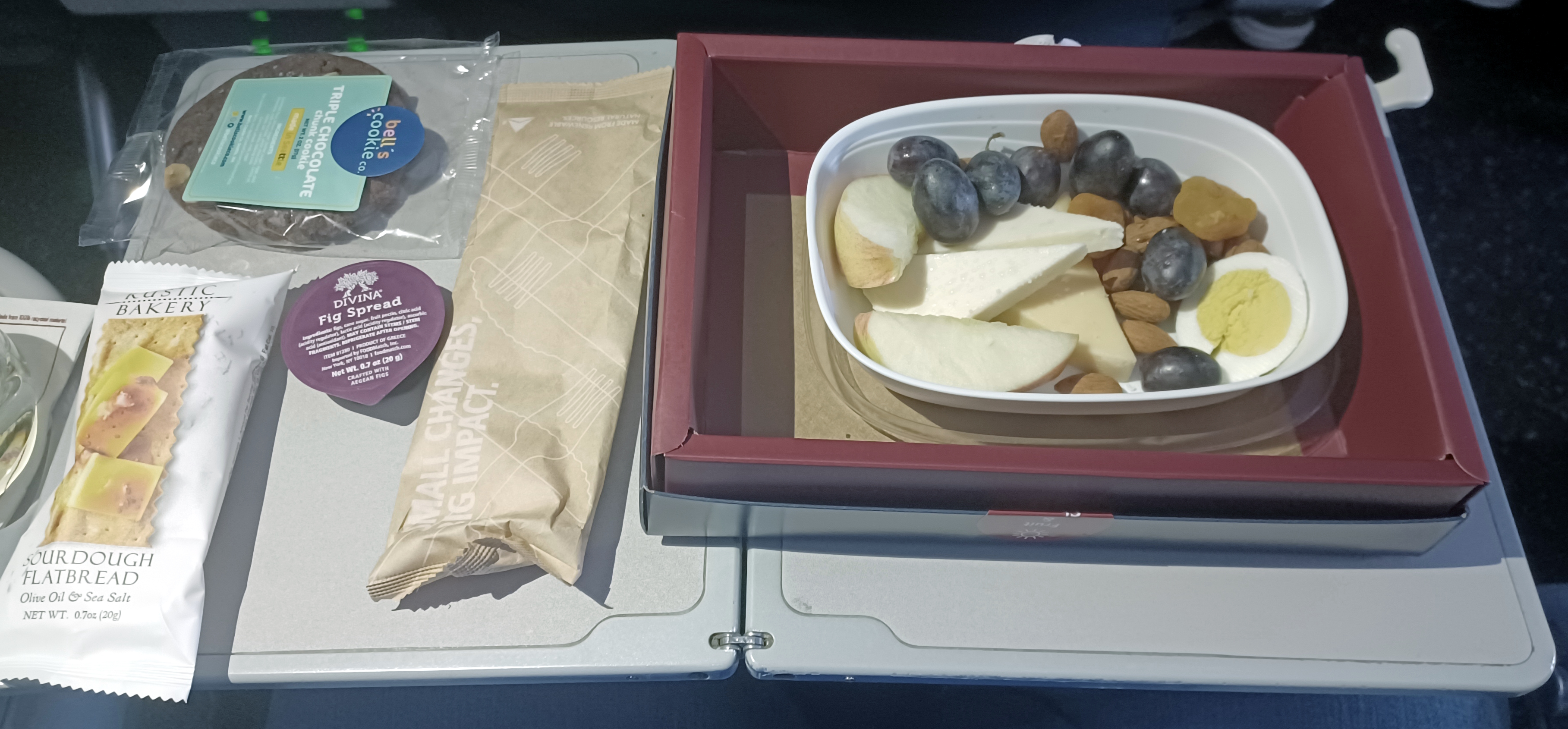 There’s no way the fruit & cheese box has been sitting around for a year. It’s made fresh daily and boarded on the previous leg. If you fly out of a spoke, there’s a decent chance you’ll get one of the boxes.