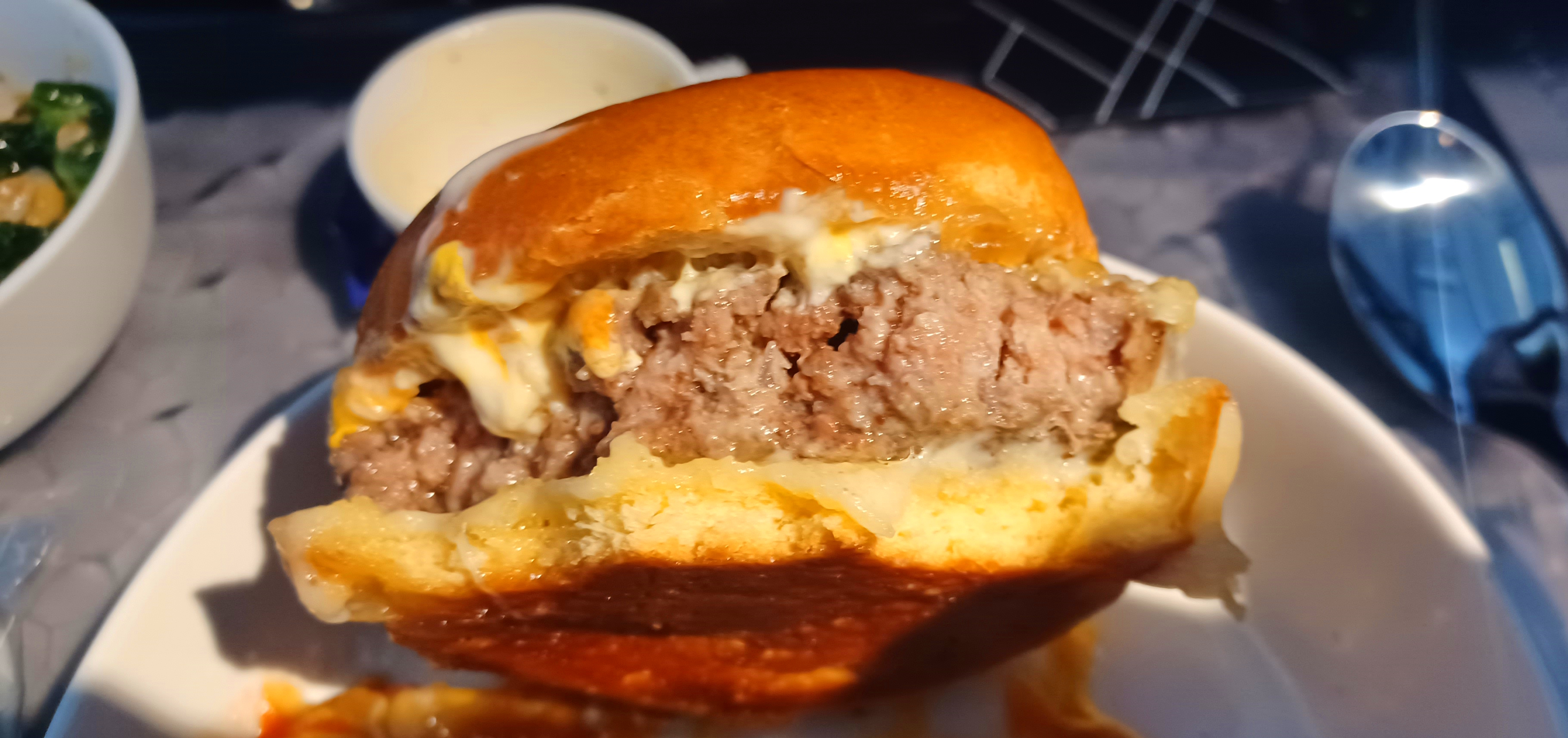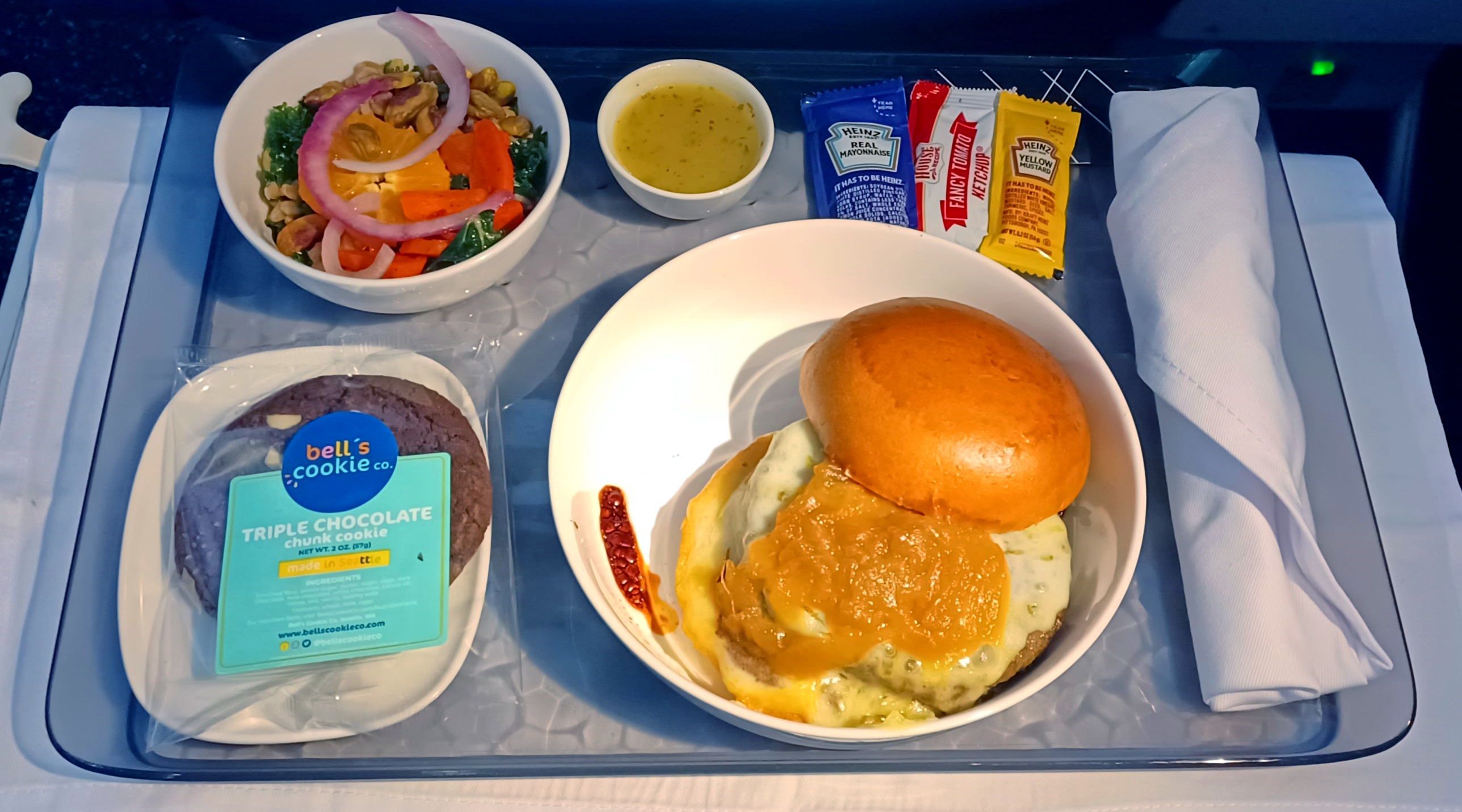 Yeah, it was also perfect and juicy and I ate every bite. Other than missing a piece of cheese (and maybe a strip or two of bacon), this is so impressive for a burger at 30,000 feet.