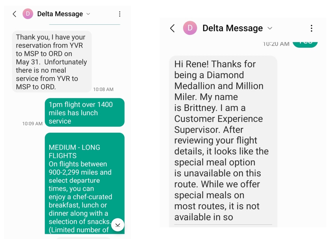 My return flight from Vancouver departing at 1:00 PM was also listed as a lunch flight. But at the 7-day mark, the Fly Delta App did not alert me to make a meal choice. I decided, even with the failure from the outbound flight, to try to message Delta.