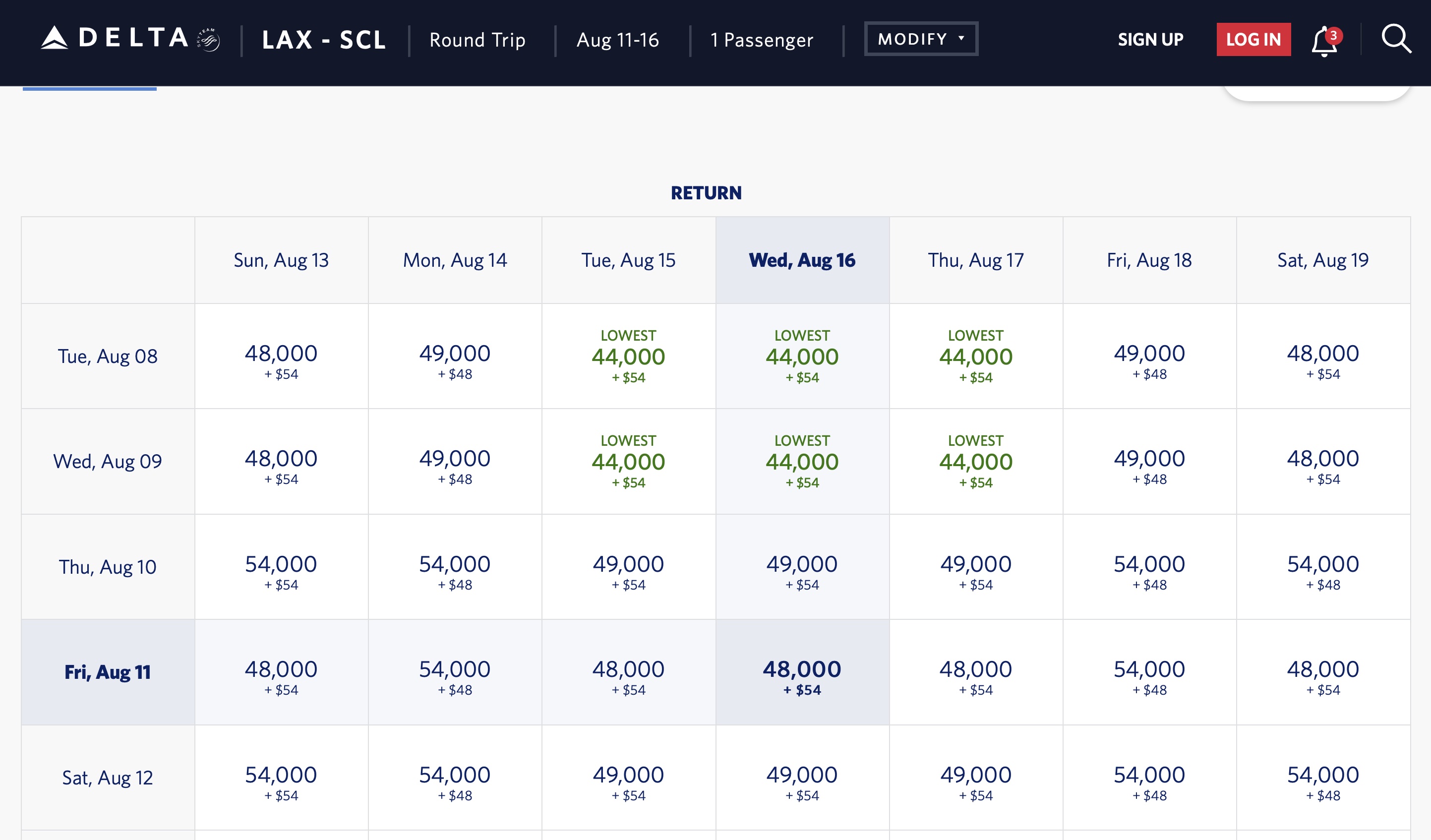 This one is for roundtrips to Santiago, Chile (SCL). And like last week’s barnburner, award prices start at 44,000 SkyMiles — before an applicable Takeoff 15 discount.