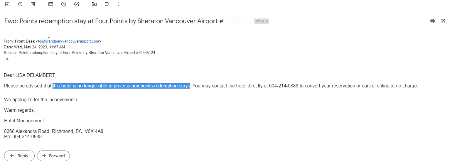 It seems that this hotel had chosen to depart from the Marriott family, and thus my prepaid stay on points would not be honored. I’d be on my own, as my stay was canceled. It is now called the “Grand Park Vancouver Airport Hotel” and not sure how “grand” a Four Points can ever be nor a “gateway to comfort”! 🙁