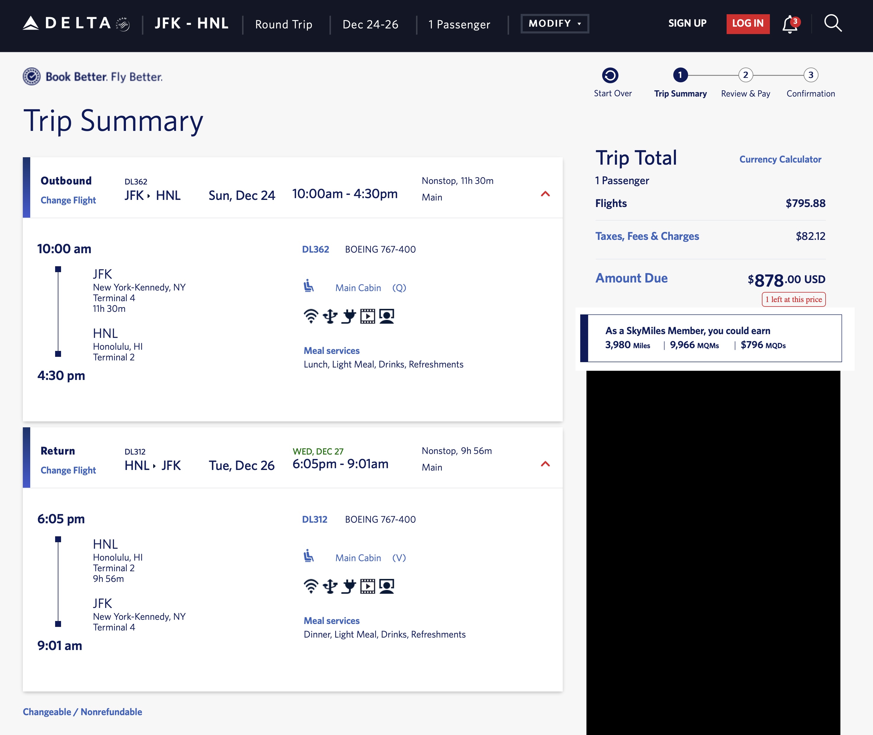 If you (really think you) need some MQM (9,966, to be precise) and want to jet off to the Hawaiian islands December 24-26, then Santa Eye of the Flyer is here with your present. The airfare costs $878. That comes out to 8.8 cents per MQM. And it’s a Main Cabin trip there and back. (The trip is aboard a 767-400 offering Delta One and Premium Select. So, if you have Regional or Global Upgrade certificates to burn, this might be a good opportunity.)