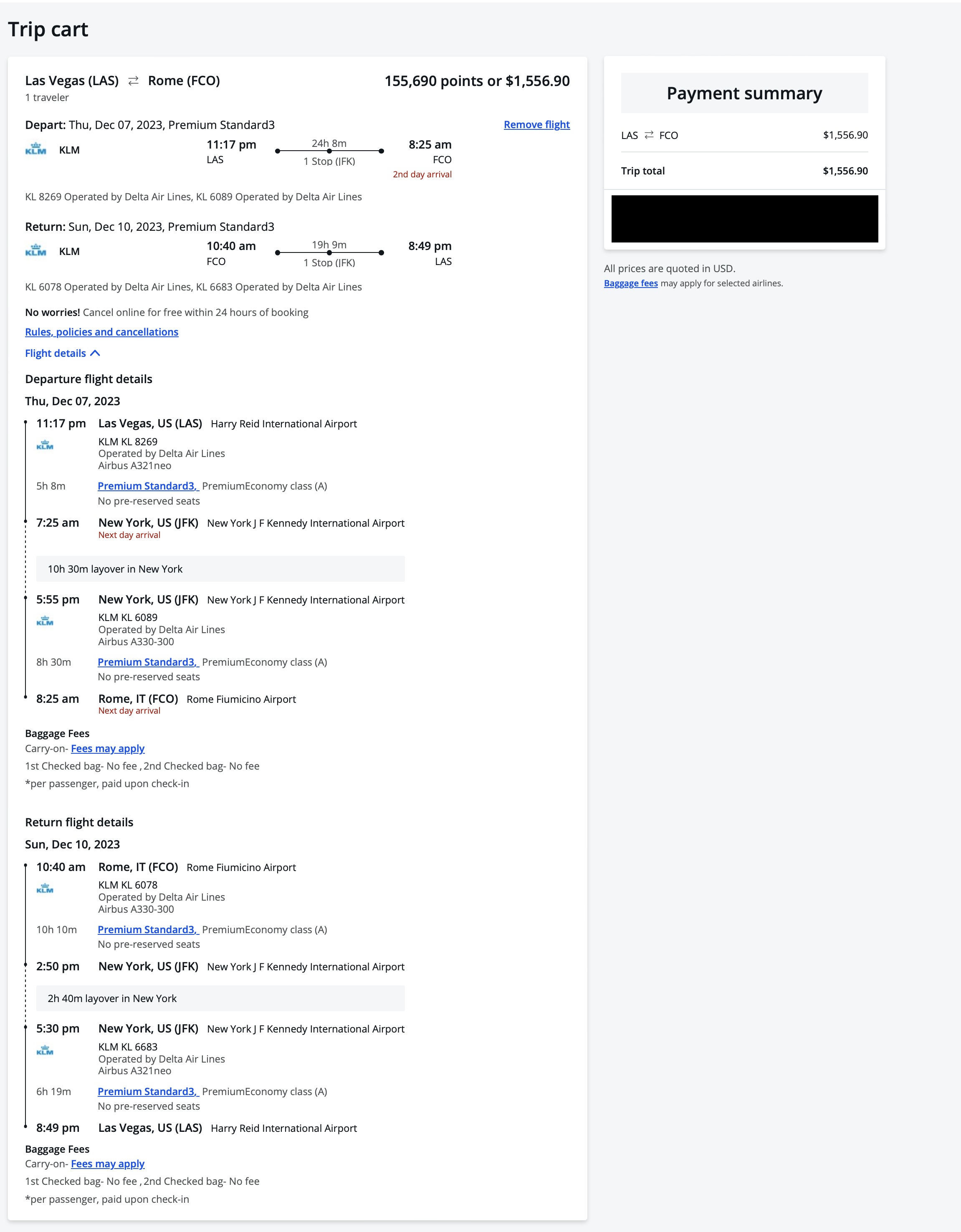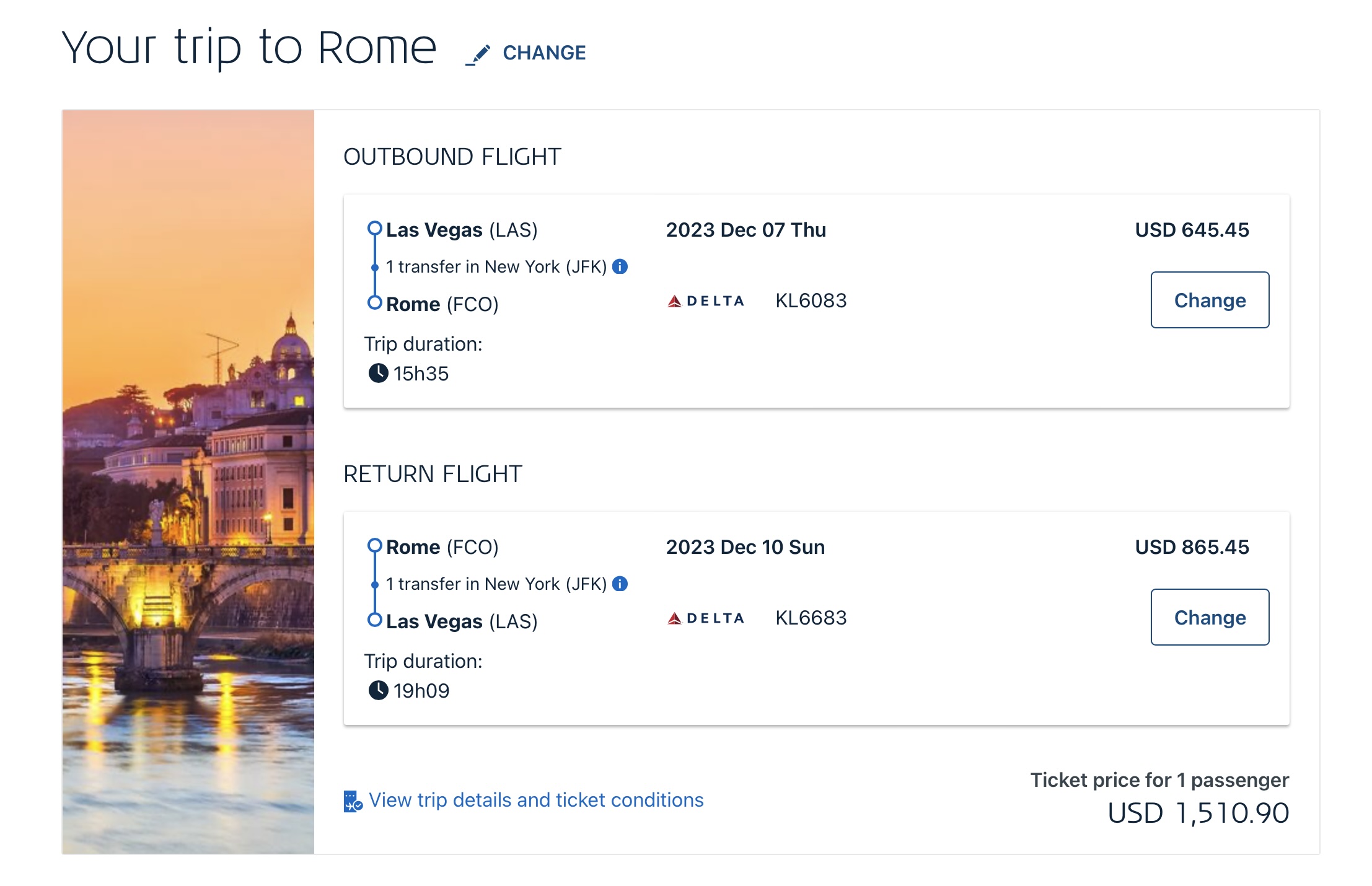 The trip flies LAS-New York (JFK)-FCO there and FCO-JFK-LAS on the way back.
