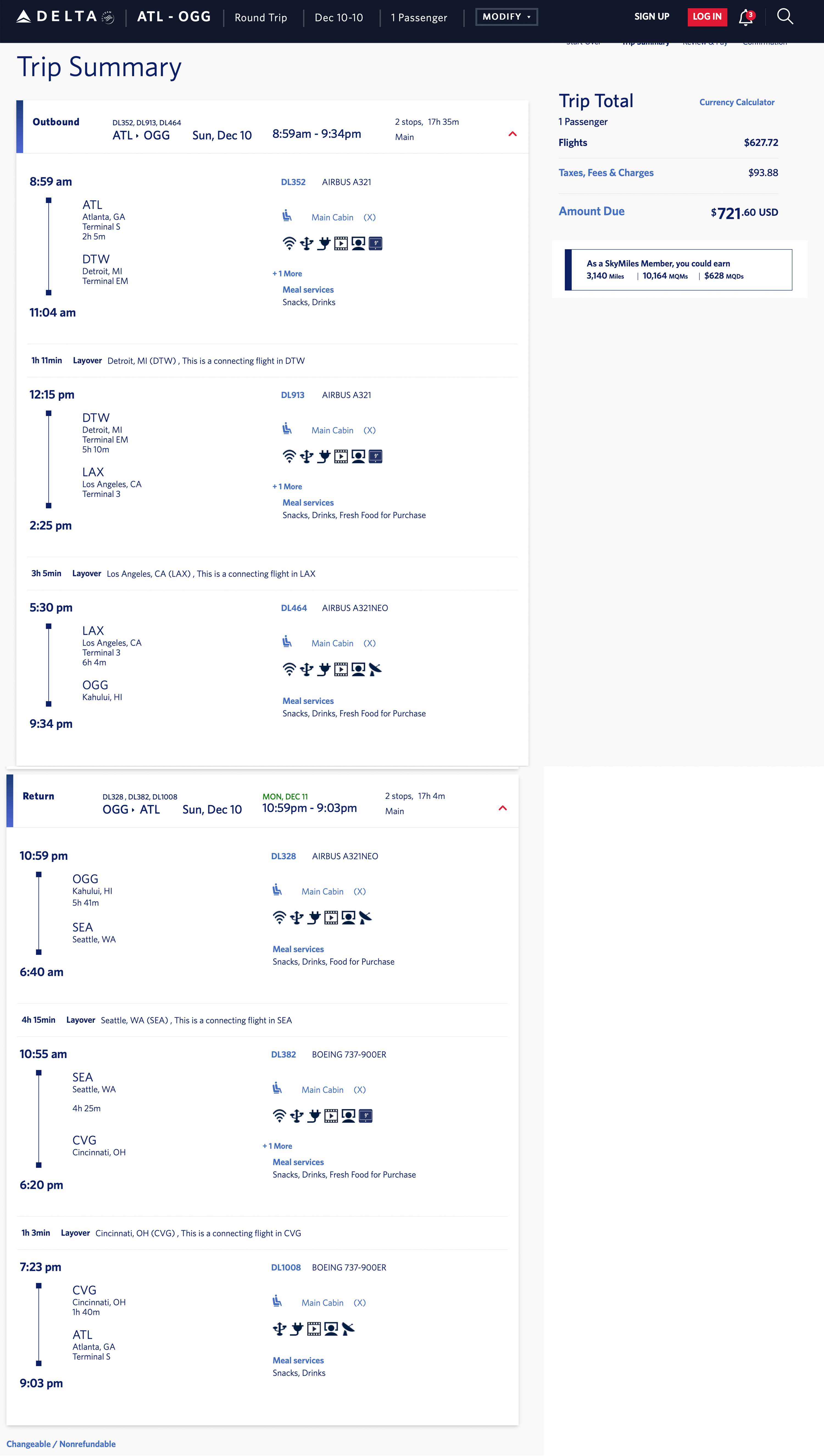 The trip earns 10,164 MQM for $721.40. It’s a long trip with plenty of Sky Club appreciation time (assuming you have a membership or eligible Amex card).