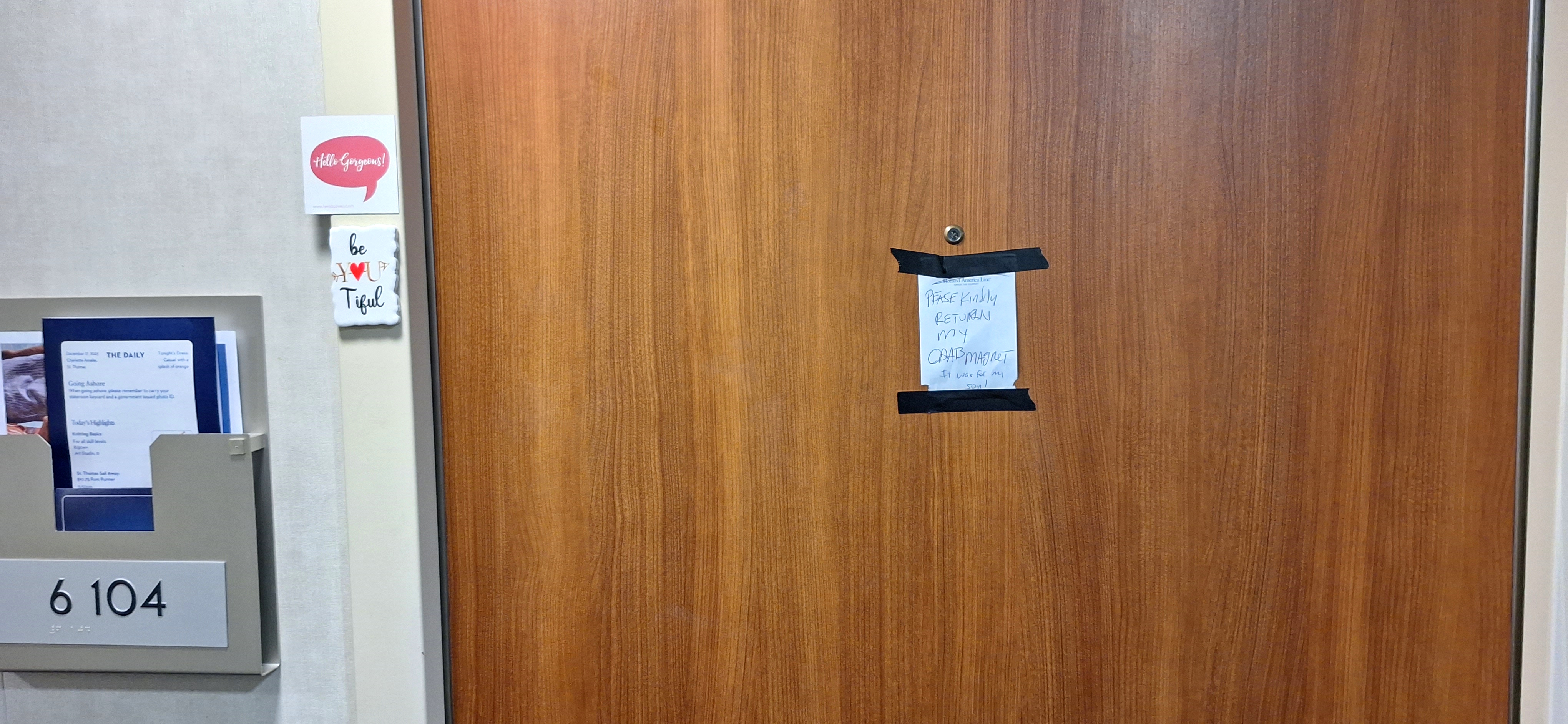 One of the doors we passed had a really funny magnet. It was a red crab magnet (sorta like this one) and I smiled each time I walked past it that was until one day when it was gone and halfway through the cruise.