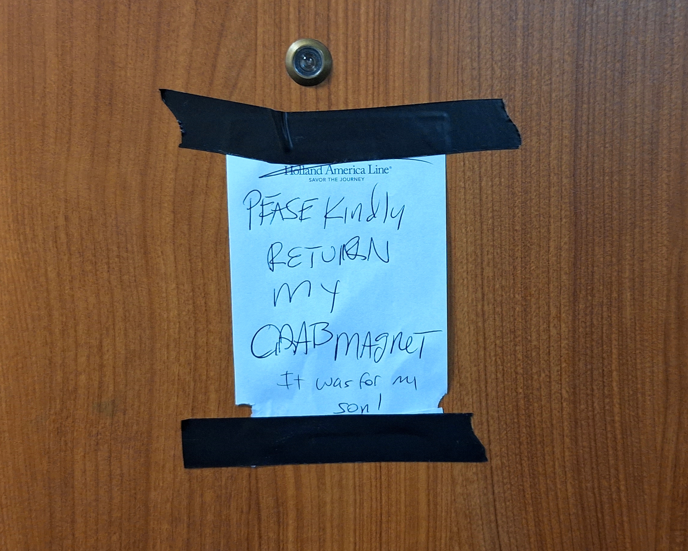 What replaced it for the rest of the cruise was this sad note taped to the door. How very pathetic that someone would steal a guest’s door decoration.