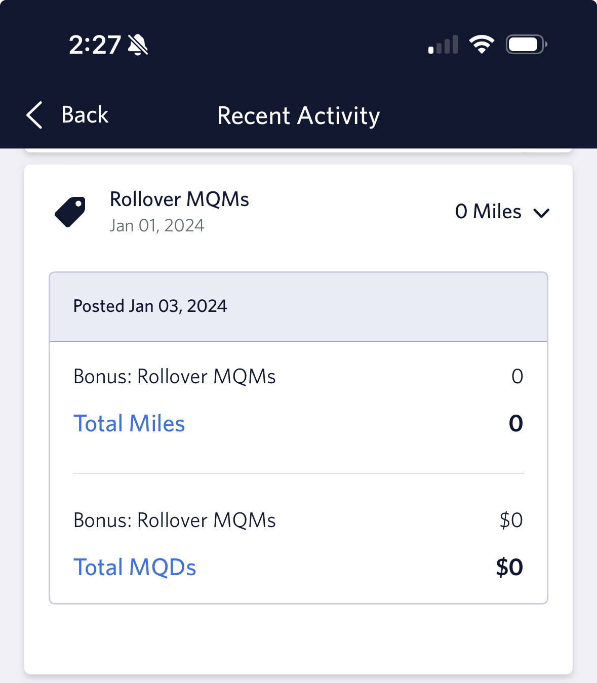 You’ll see a list of any recent SkyMiles and Medallion® Qualification Dollars (MQD) earnings. Scroll down to January 1, 2024. Click the arrow on the box that says “Rollover MQMs.”