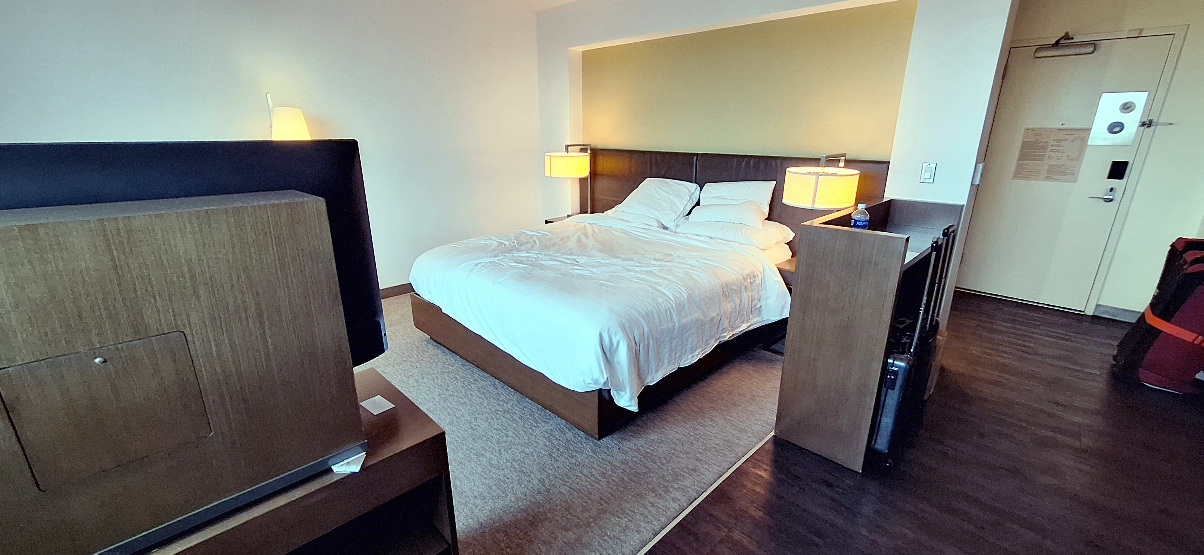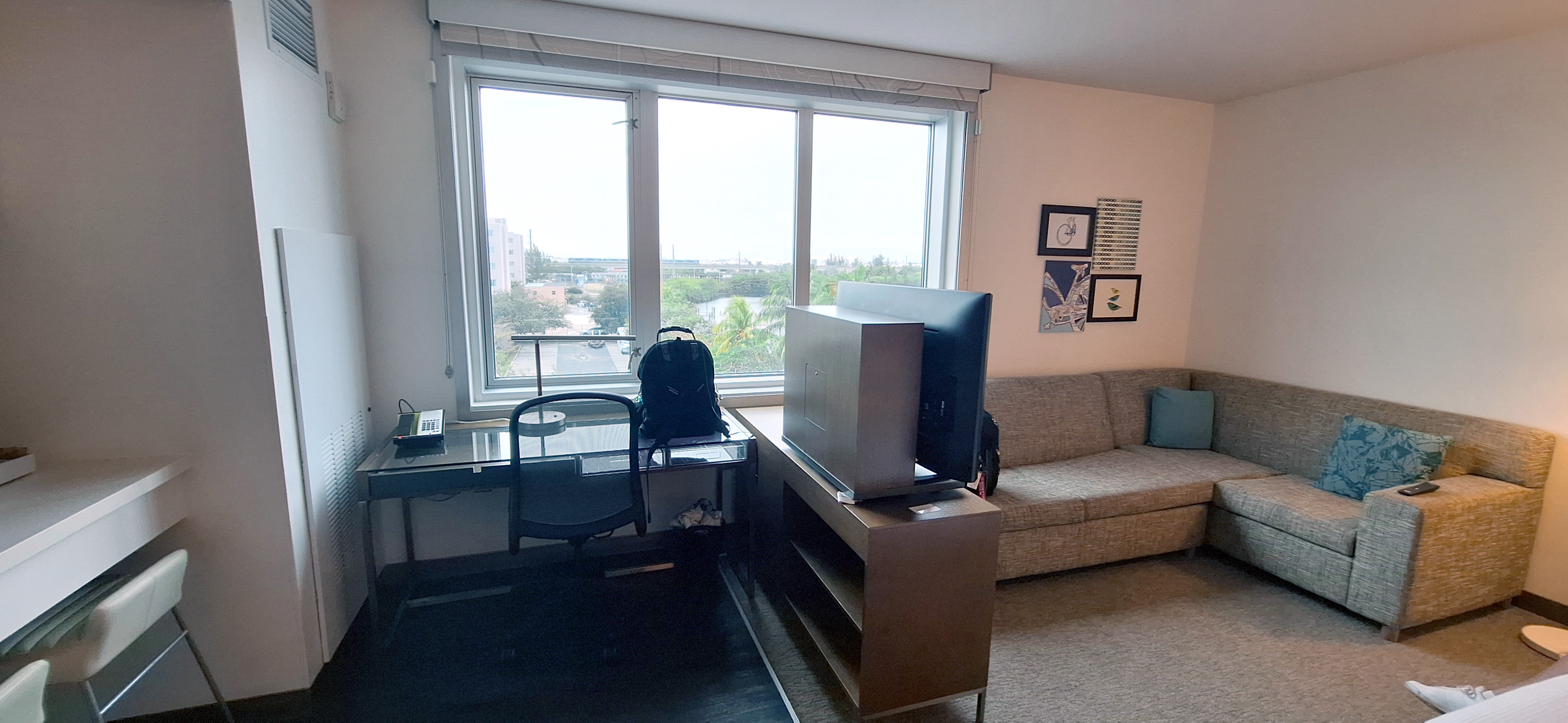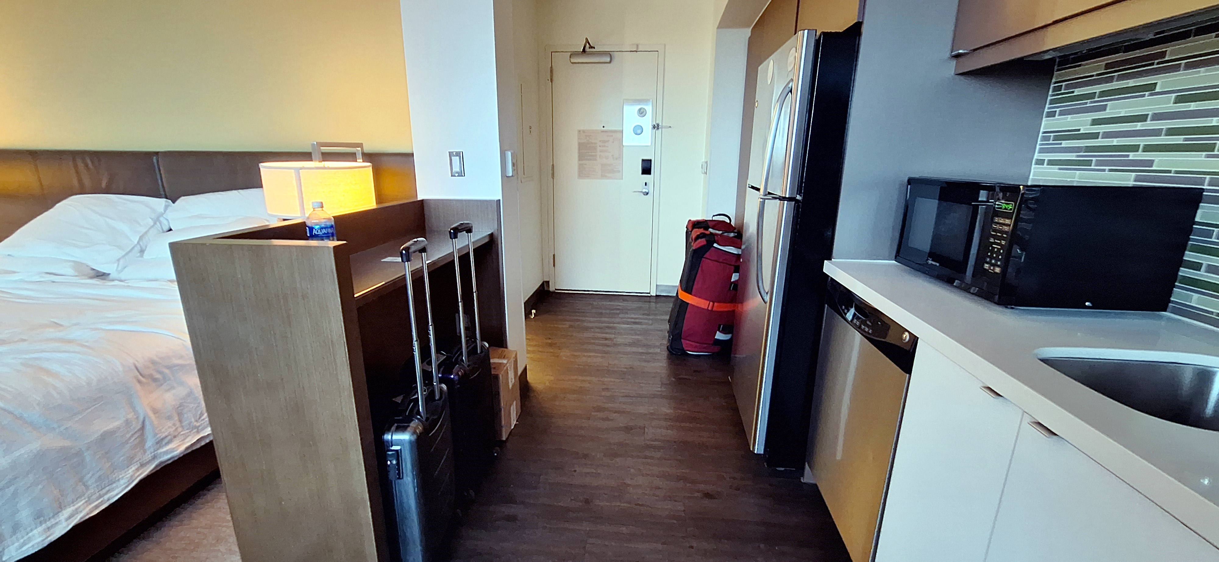At first glance this looks decent for a budget hotel with lots of space. I will say everything in the room worked that is the dishwasher, refrigerator and TV other than the fact that you had to use a wedge to keep the TV from rotating when sitting in the sofa.