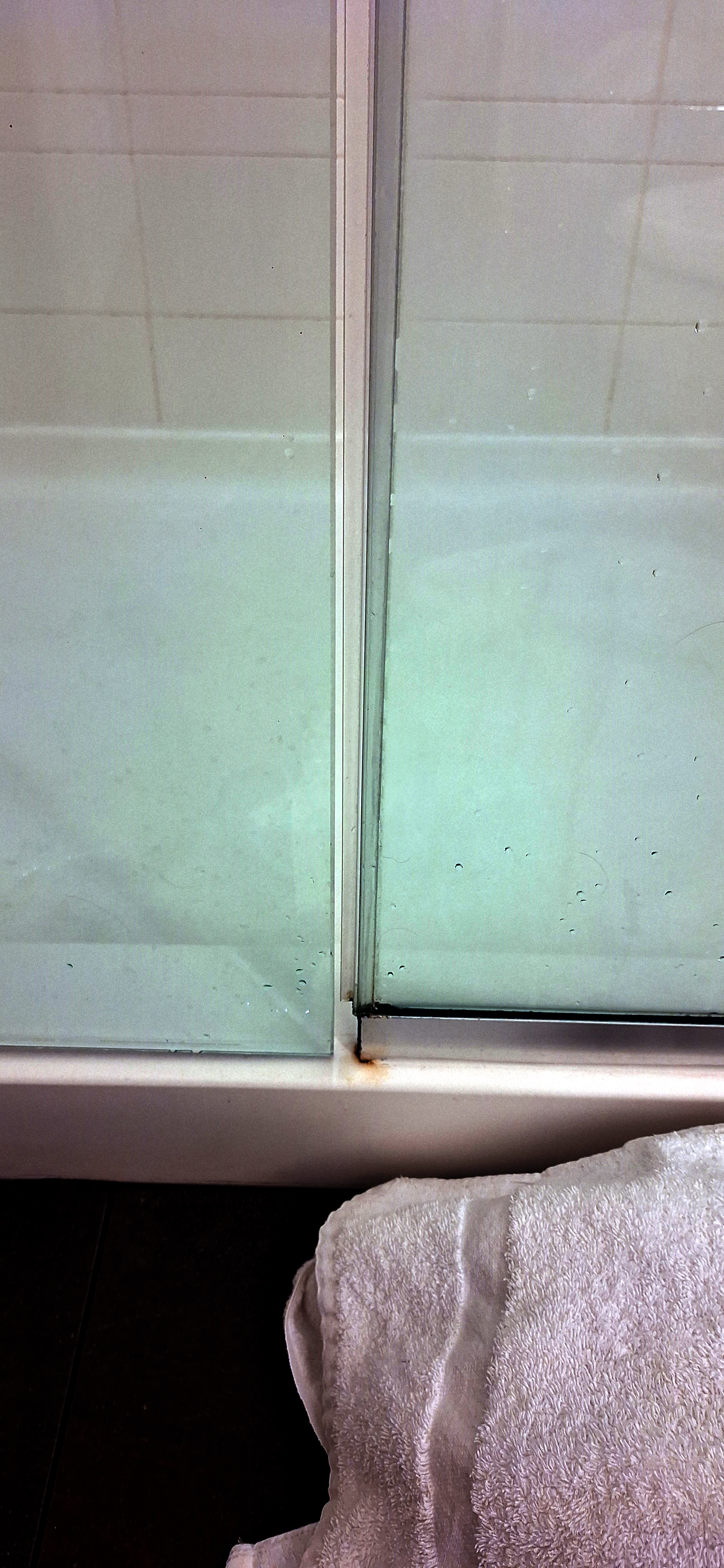 The glass doors do not meet at all and the attempt to use a plastic sweep did not work so water pours onto the floors outside when you shower unless you very carefully direct the water flow at the back wall of the show and then do what you can to keep the water away from the doors. Also there were no shelves in the shower for your own items.