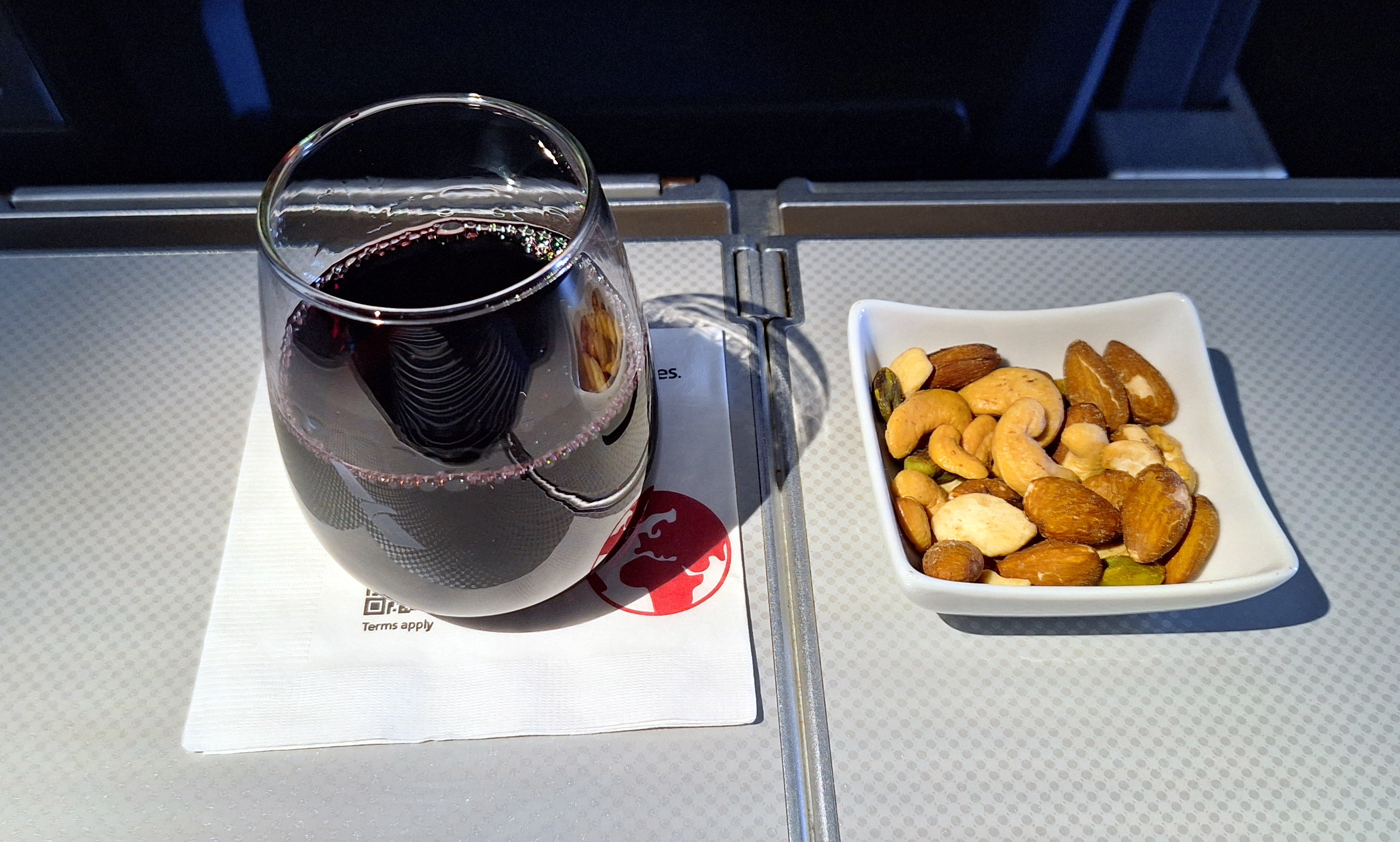 One nice thing AA does is a pre-meal service of hot-ish nuts and drinks before lunch. The flight attendants did their jobs but not much else. Let me illustrate.