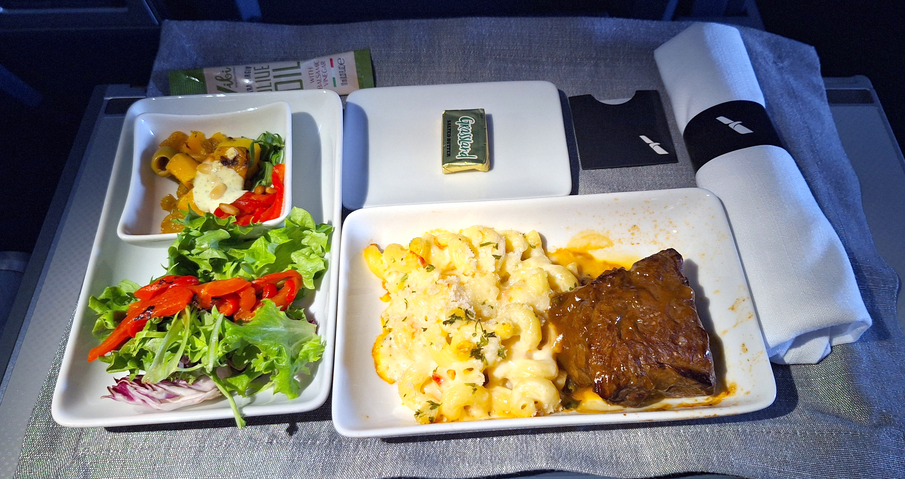 We pre-ordered the beef short rib. It was dull and unremarkable and nothing compared to the similar meal that Delta offers. Plus we did not get any bread or was the butter for something else? After lunch, the flight attendants did this: