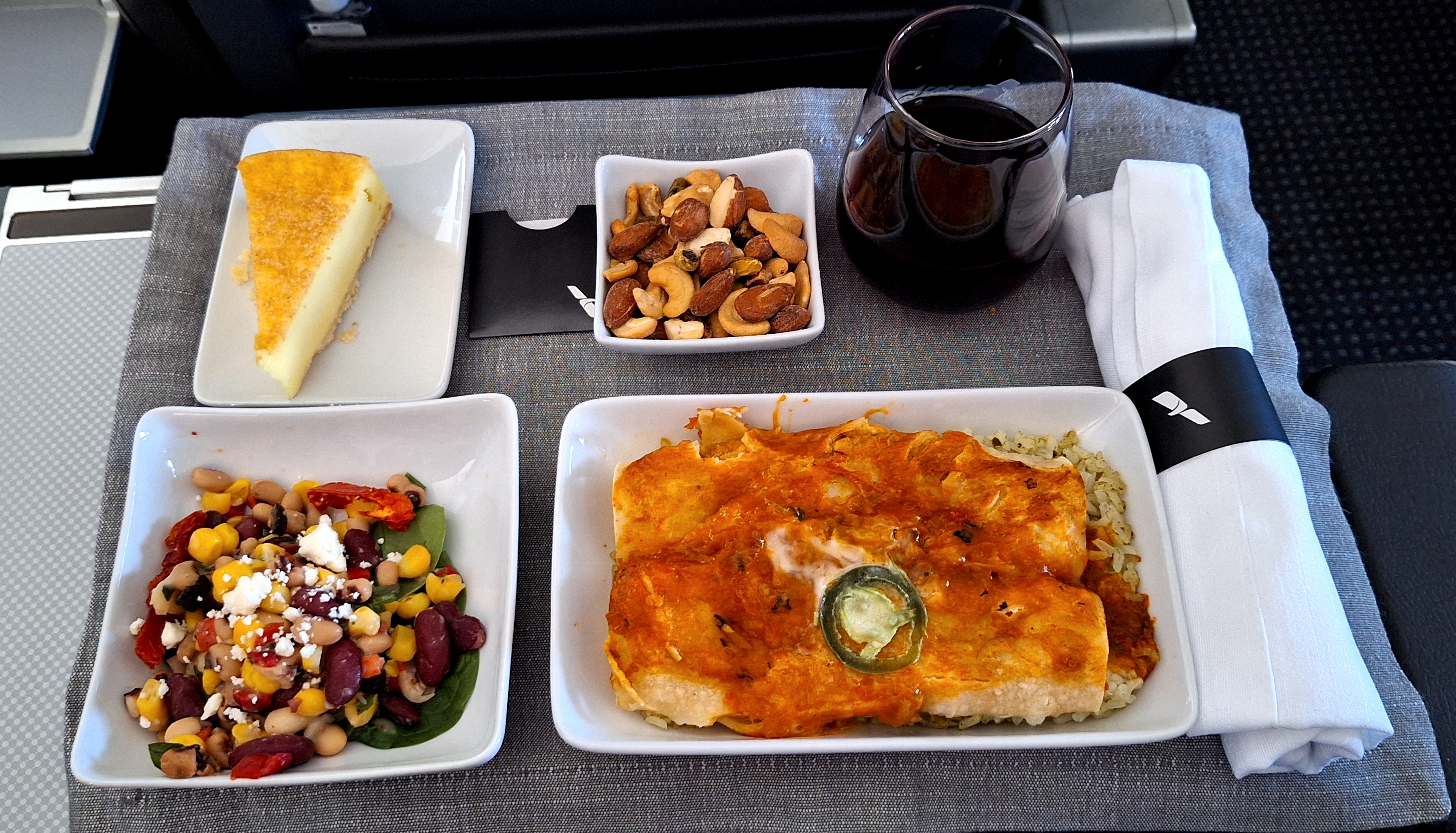 This crew seemed not to want to be friendly or helpful. The warm nuts were sorta-kinda warm and served at the same time as the meal. We were given a tiny splash of wine and had chosen the chicken burritos this time and they were equally as uninspiring as the short ribs on the way down. When my wife, after finishing her meal, asked for a refill on her wine the flight attendant seemed upset at the request. OK, then…
