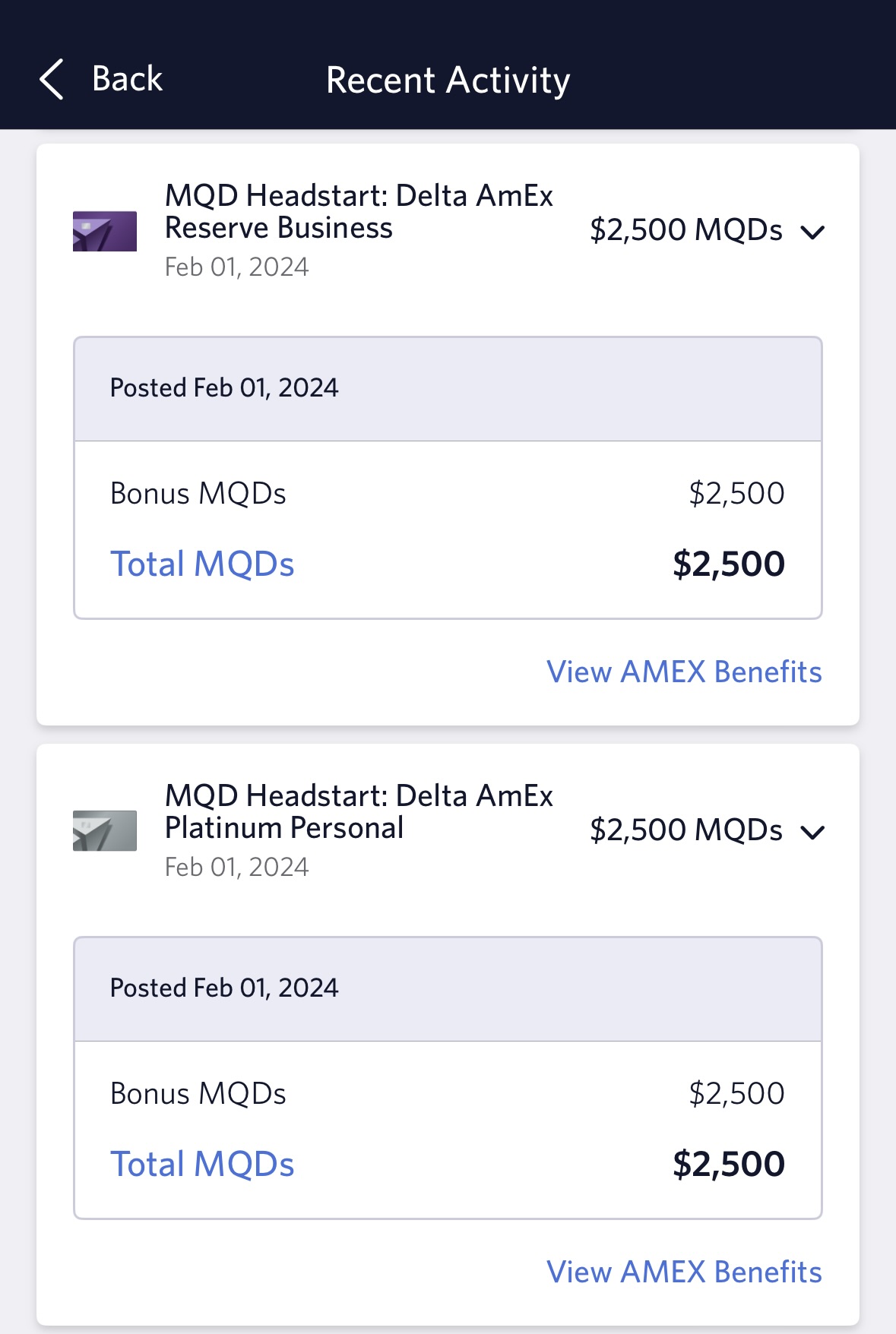 I have a Delta Amex Business Reserve Card and a personal Delta Platinum Amex. Here’s a screenshot of my SkyMiles account reflecting that I earned $5,000 MQD from the two cards.