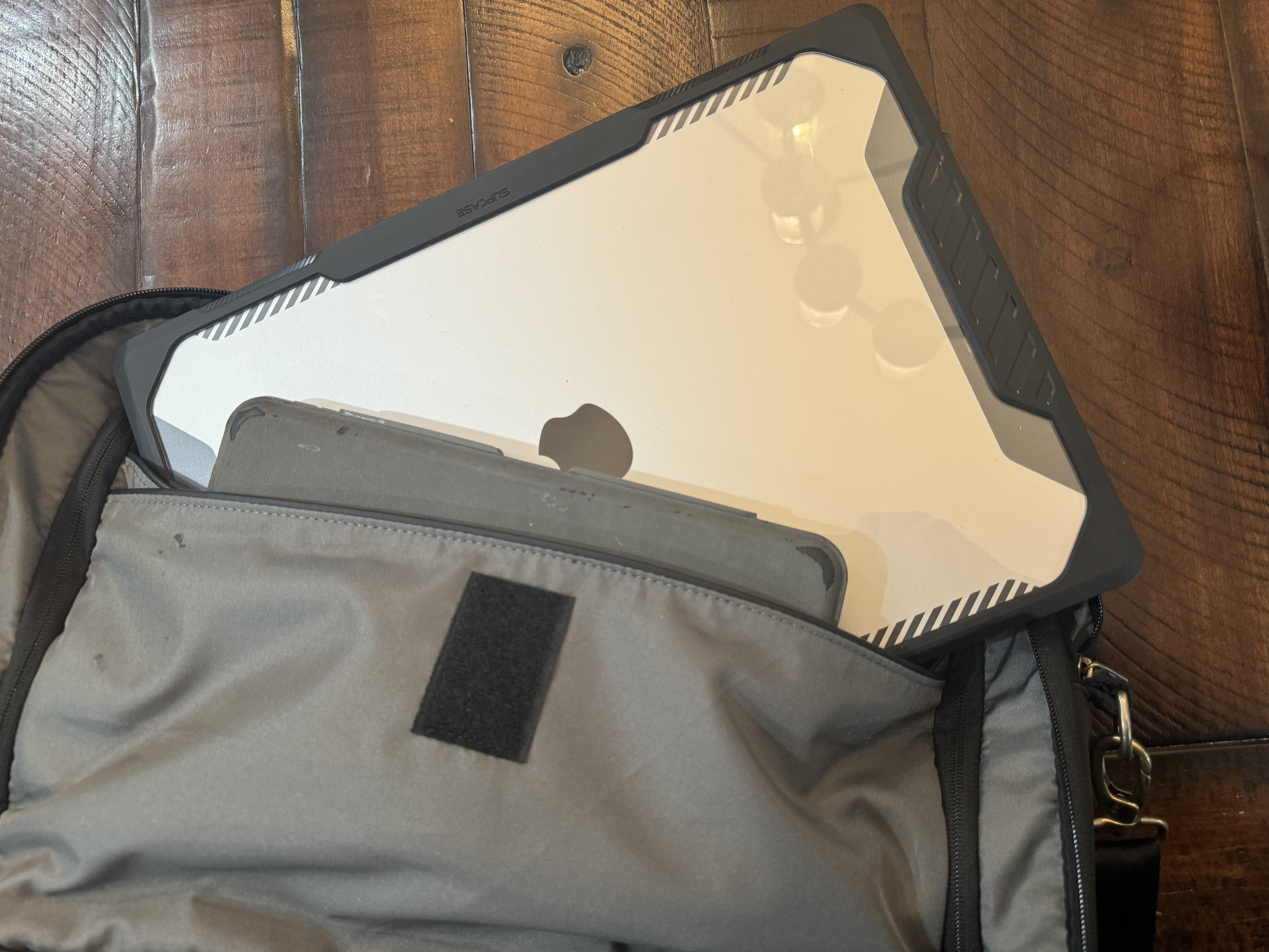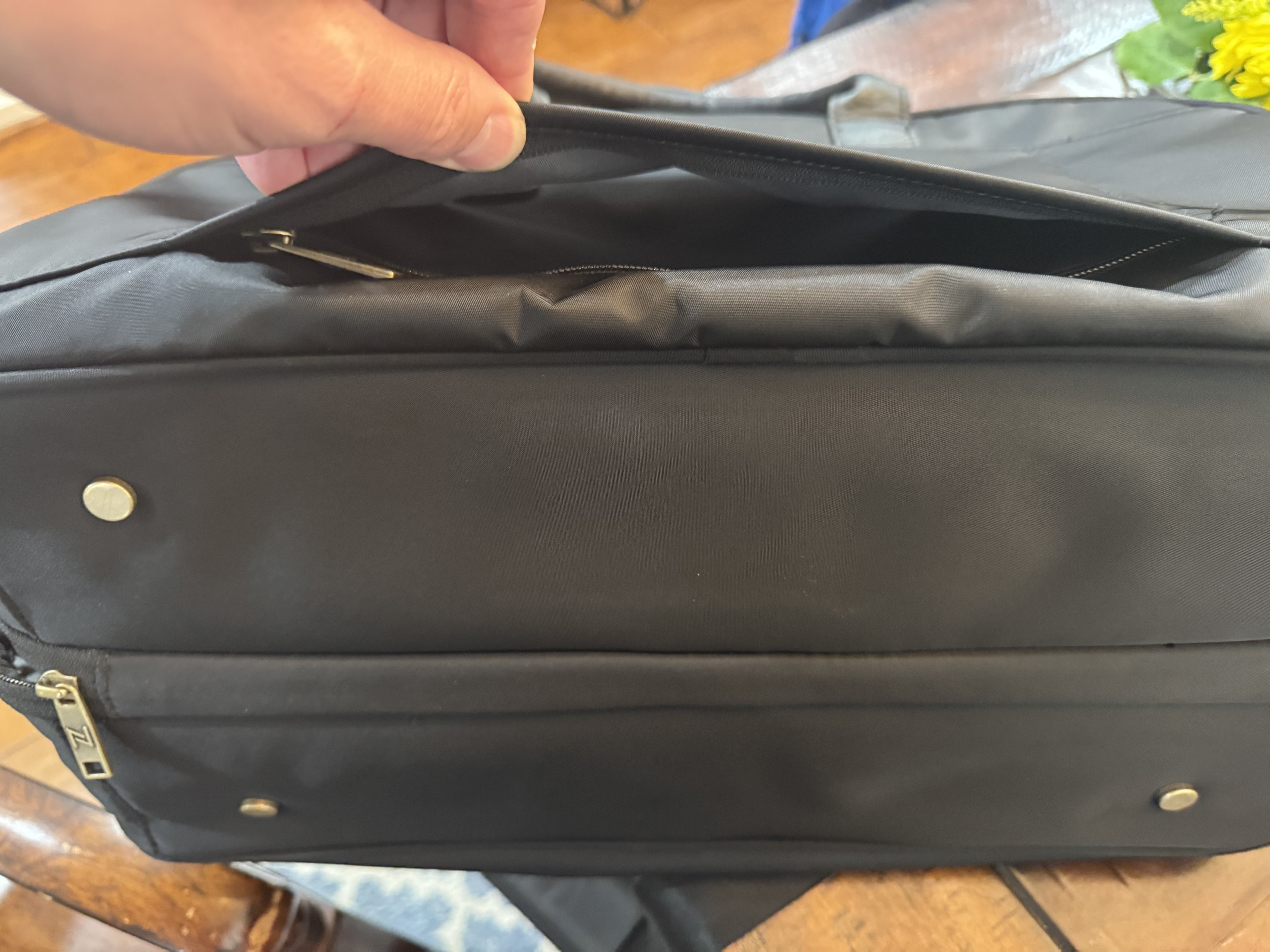 Mr. Visnani told me the computer sleeve should hold a 16″ laptop. However, my 16″ MacBook Pro doesn’t fit in there — because it’s in a case adding just a little too much real estate to an already big computer.