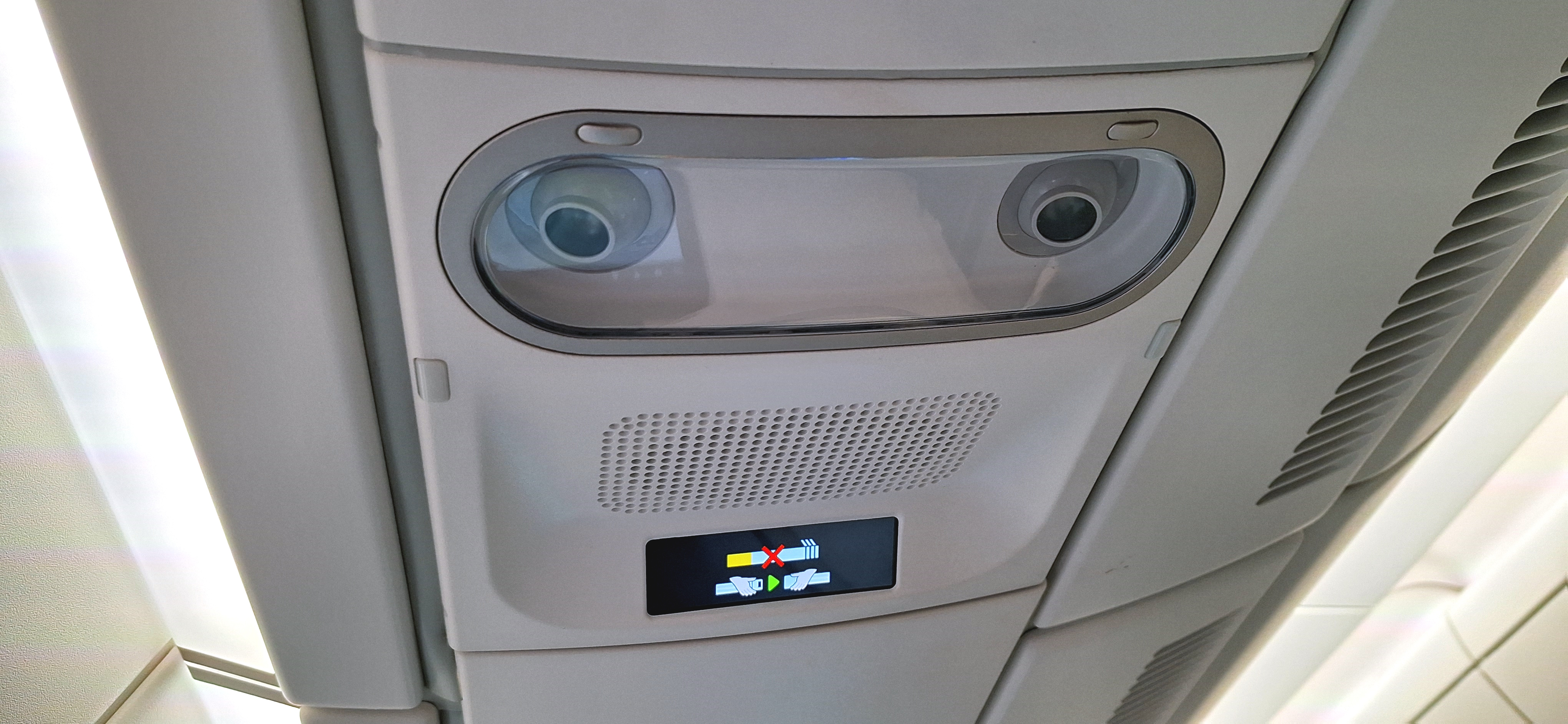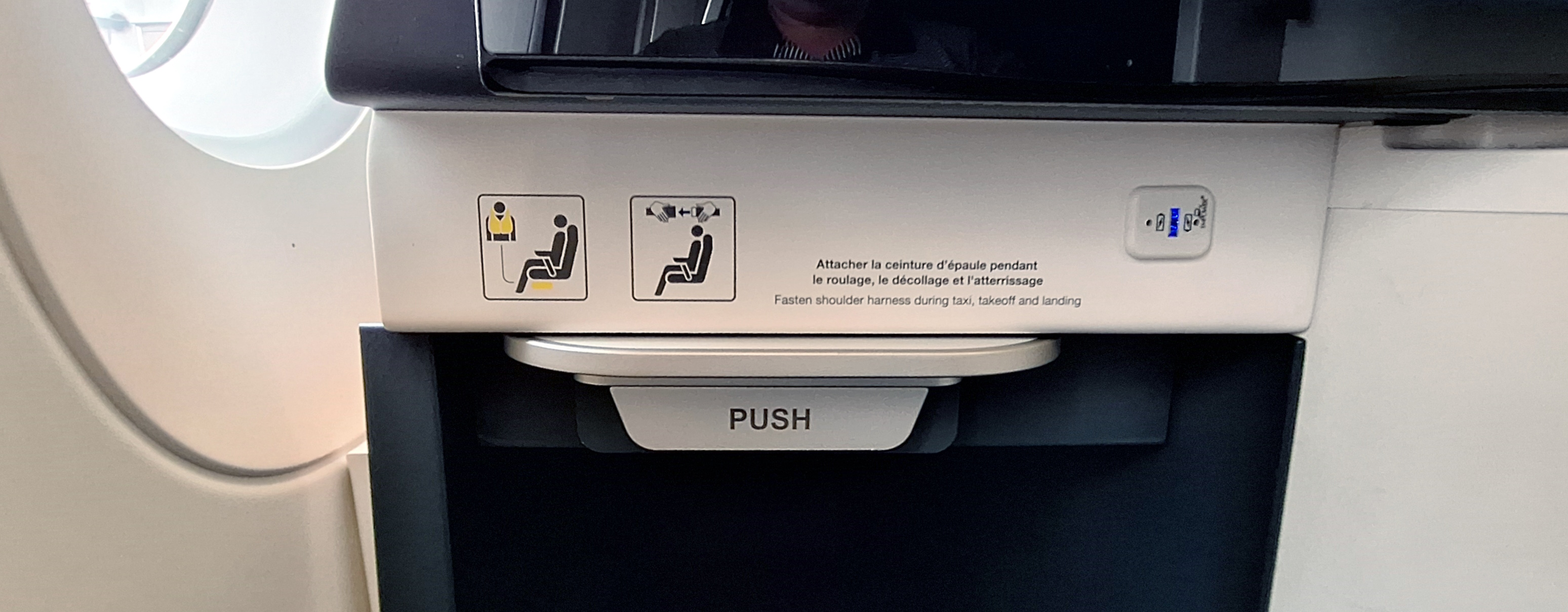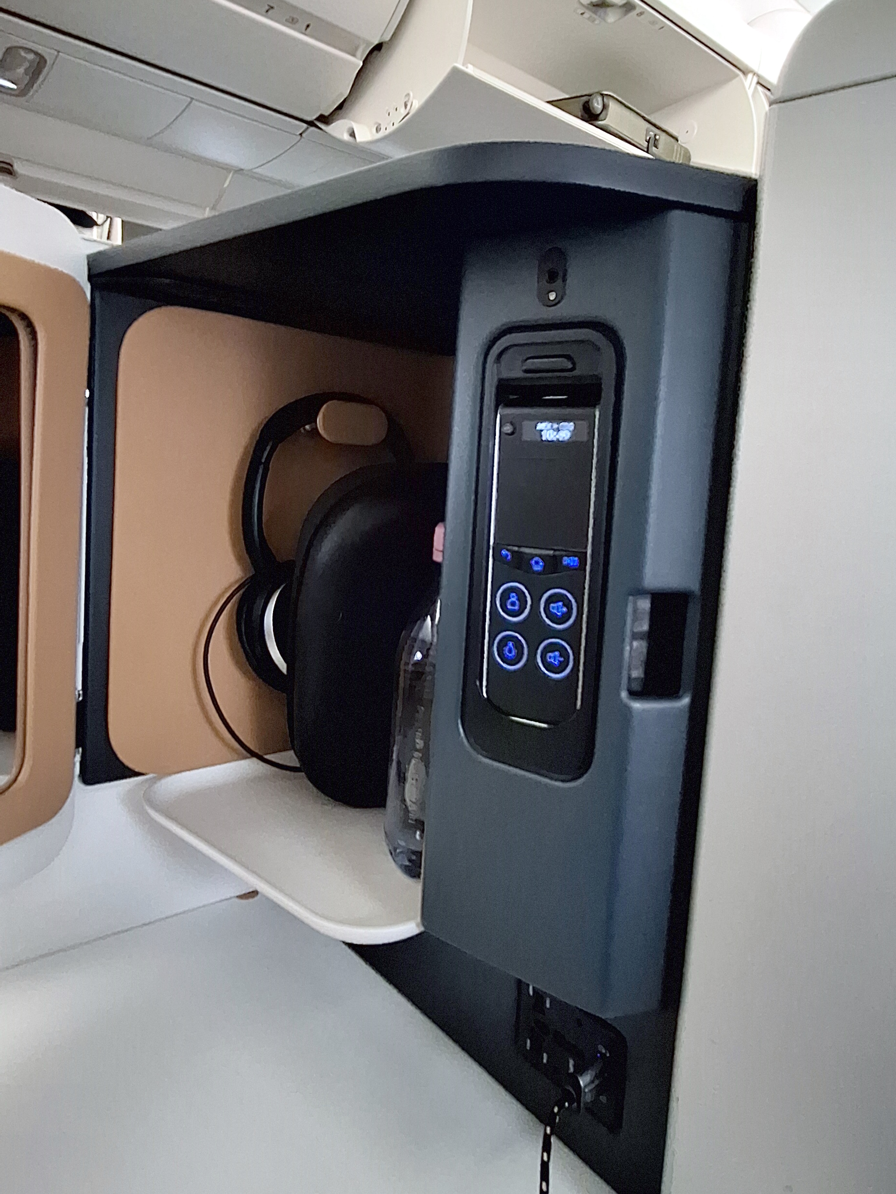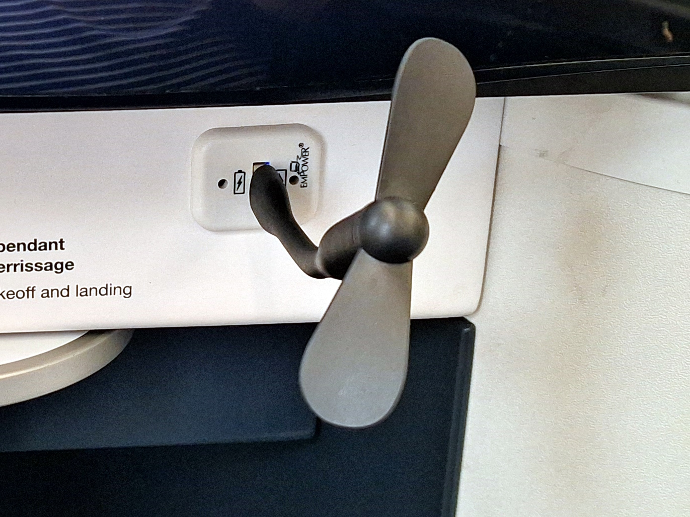 There is one big issue with this jet – you have NO overhead air vents even on the single seat side of the jet and it was rather warm on the flight. Thankfully just under the monitor there was a USB port that my tiny fan that are only $8.99 for a four pack and yes you WANT these (that can be disassembled for transport) was just what I needed for comfort!