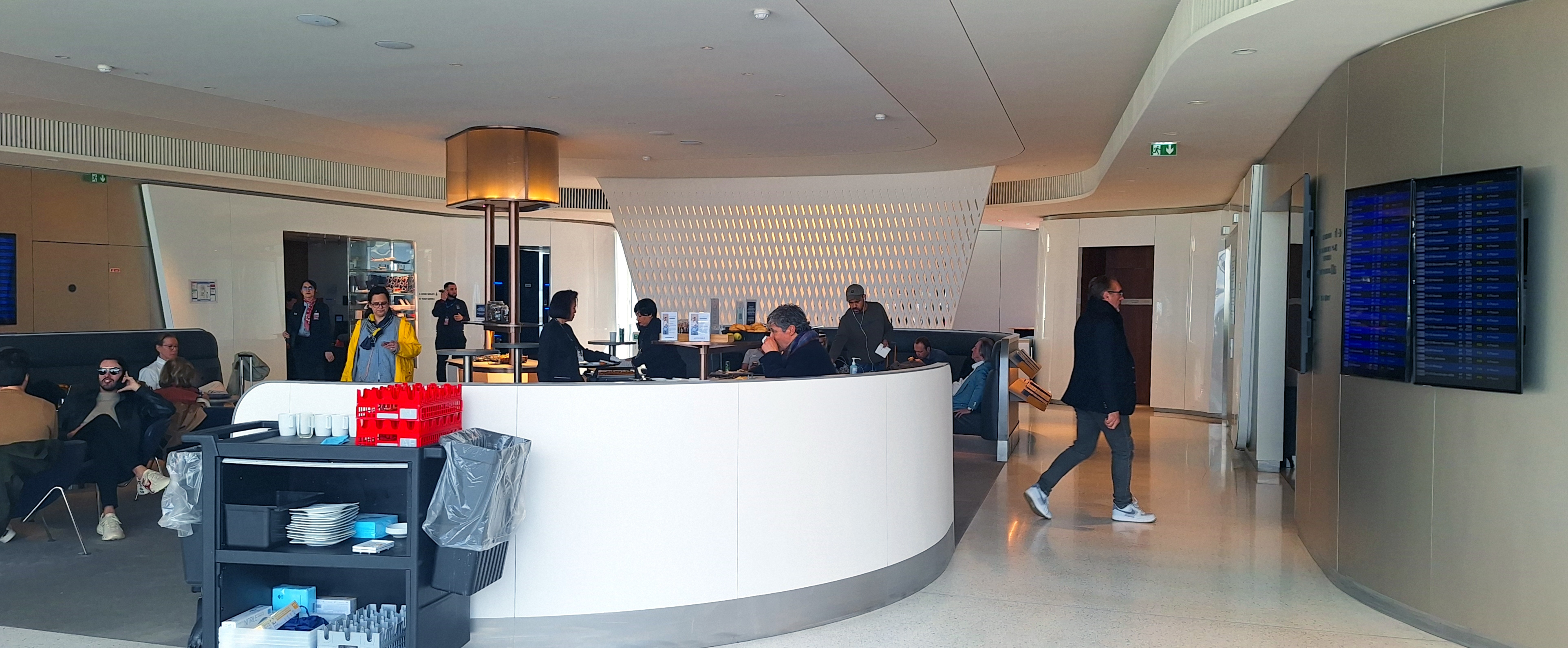 In the AF Lounge as we speak. Obviously the cleaning staff has gone on a break because there are tables stacked with plates, glasses, cups, wrappers everywhere. Wish I could add some pictures here.